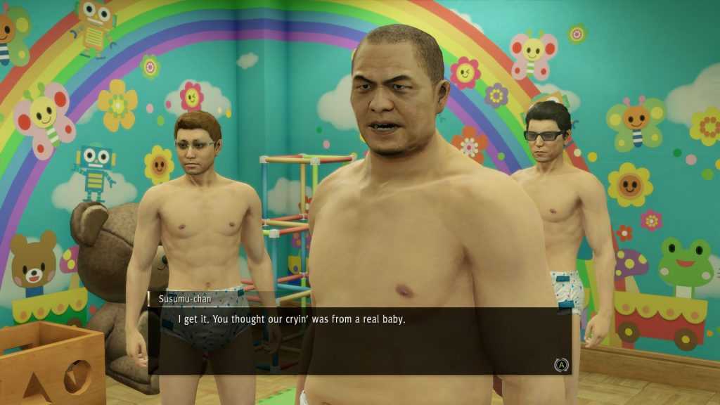 Кого только здесь не встретишь. Один из самых известных квестов — про мужика, которому срочно нужно приготовить молочную смесь. Отыскав для него горячую воду и все приготовив, вы узнаете, что смесь нужна была для клуба якудз-фетешистов, изображающих из себя младенцев. Встреча не обходится без драки, но в итоге вы находите общий язык — потом якудз в подгузниках можно звать на подмогу в боях. В другом квесте нужно спасти от смерти краба по имени Нэнси — и он тоже станет вашим помощником. Или вот: несколько мужиков стоят на берегу — и нужно угадать, кто из них отливает в реку. А в другом квесте Ичибан находит горшок очень, очень острой кимчи… впрочем, ладно, не буду спойлерить хотя бы этот квест.