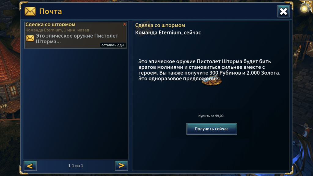 Сделка со штормом. На старте игра предлагает задонатить в нее 99 рублей. Всего за доллар с небольшим вы получите “живое” оружие, которое развиваться и становиться сильнее вместе с персонажем. Бонусом игрок получит 2000 золота и 300 рубинов. Это, пожалуй, единственный стоящий донат в Eternium. В любом случае, мы не можем рекомендовать приобрести эту пушку — предложение провисит два дня в почтовом ящике. Этого хватит, чтобы распробовать игру и понять, нужно это вложение или нет.
