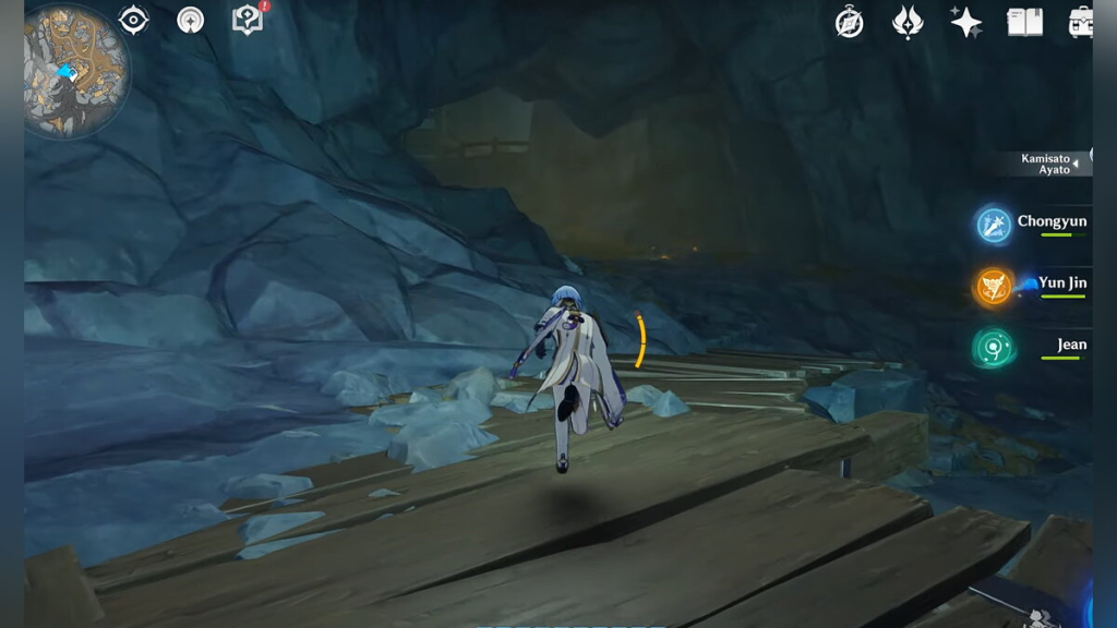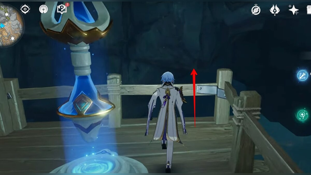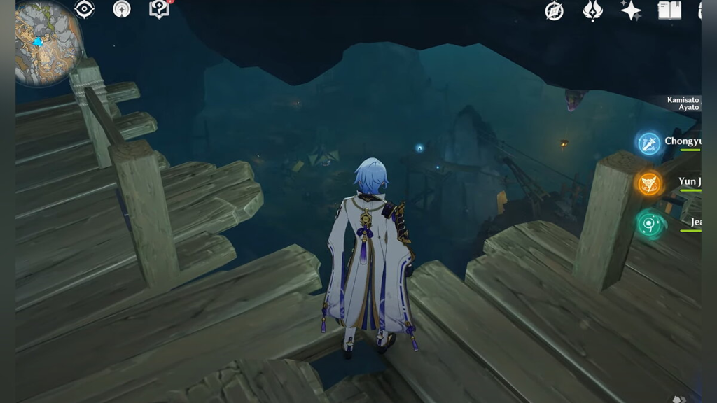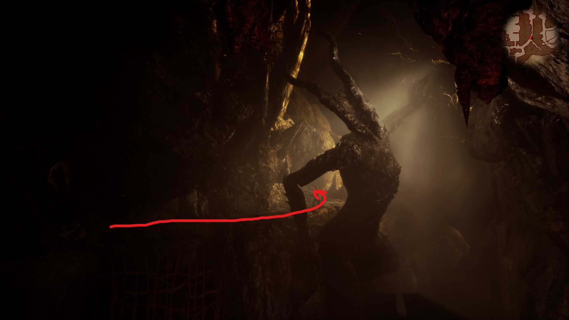 Бегите налево, мимо синих кристаллов и небольших водоёмов, пока не увидите пропасть. Прыгайте вниз.