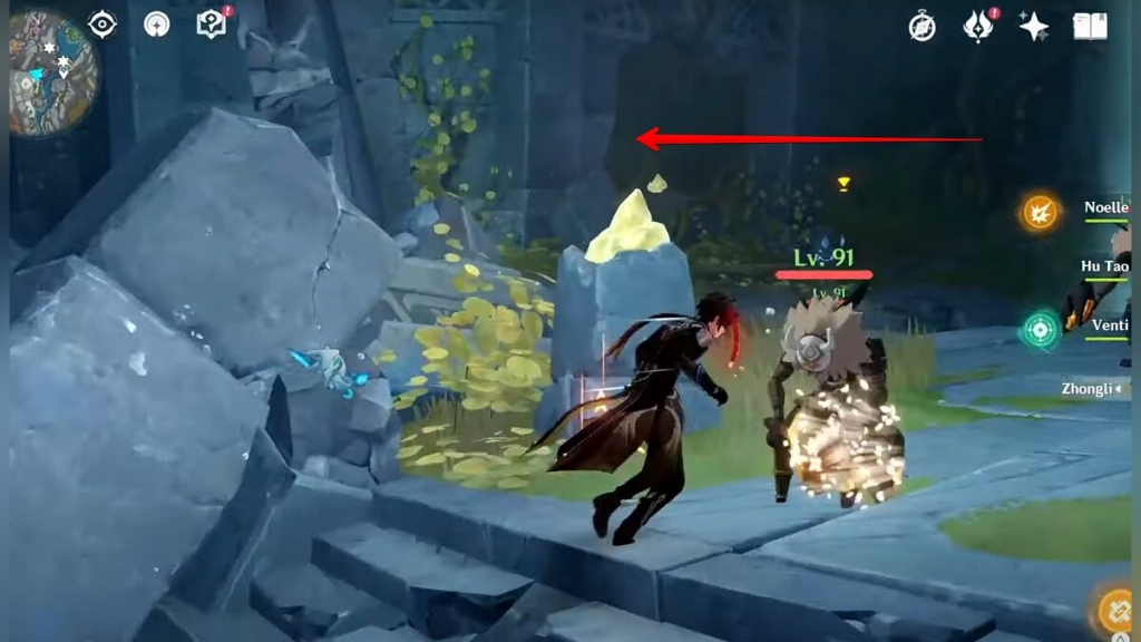 После того, как «Скалистый затвор», высокая инкрустированная Гео колонна, опустится на землю, снова поговорите с девушкой.