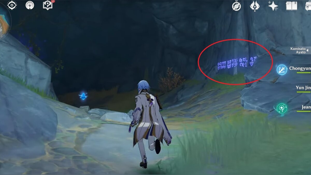 От телепорта двигайтесь на запад. Бегите вперёд по тоннелю, пока не увидите жёлтый кристалл. Около него нужно повернуть направо. Когда доберётесь до обрыва, спускайтесь вниз, к водоёму. Надпись находится справа от порога подземной реки.