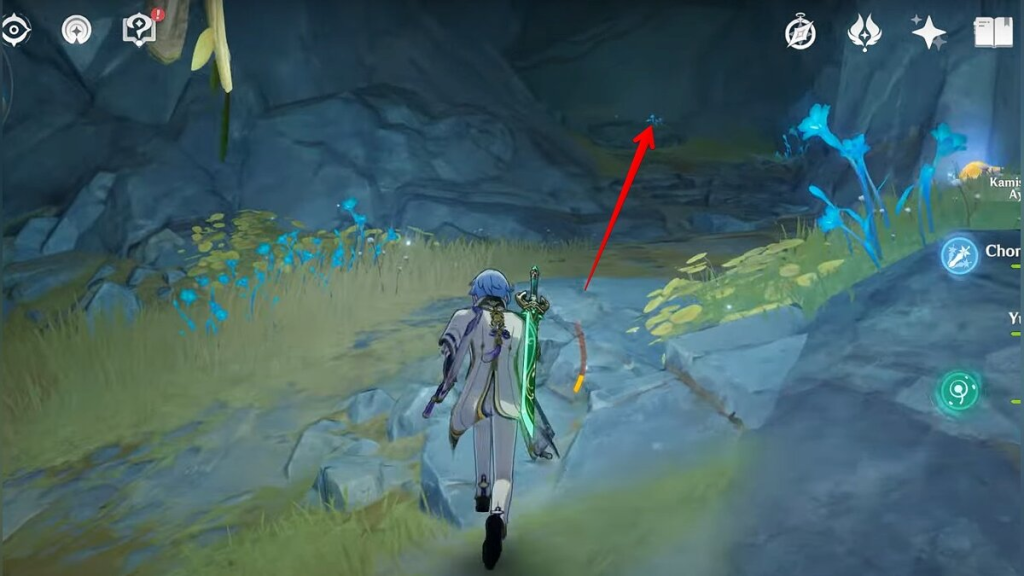 Следующая строчка находится рядом с предыдущей. Вы можете воспользоваться тем же телепортом, но вам нужно лететь немного левее водопада. Доберитесь до противоположной стороны и спрыгивайте вниз. Светящаяся строчка находится там.