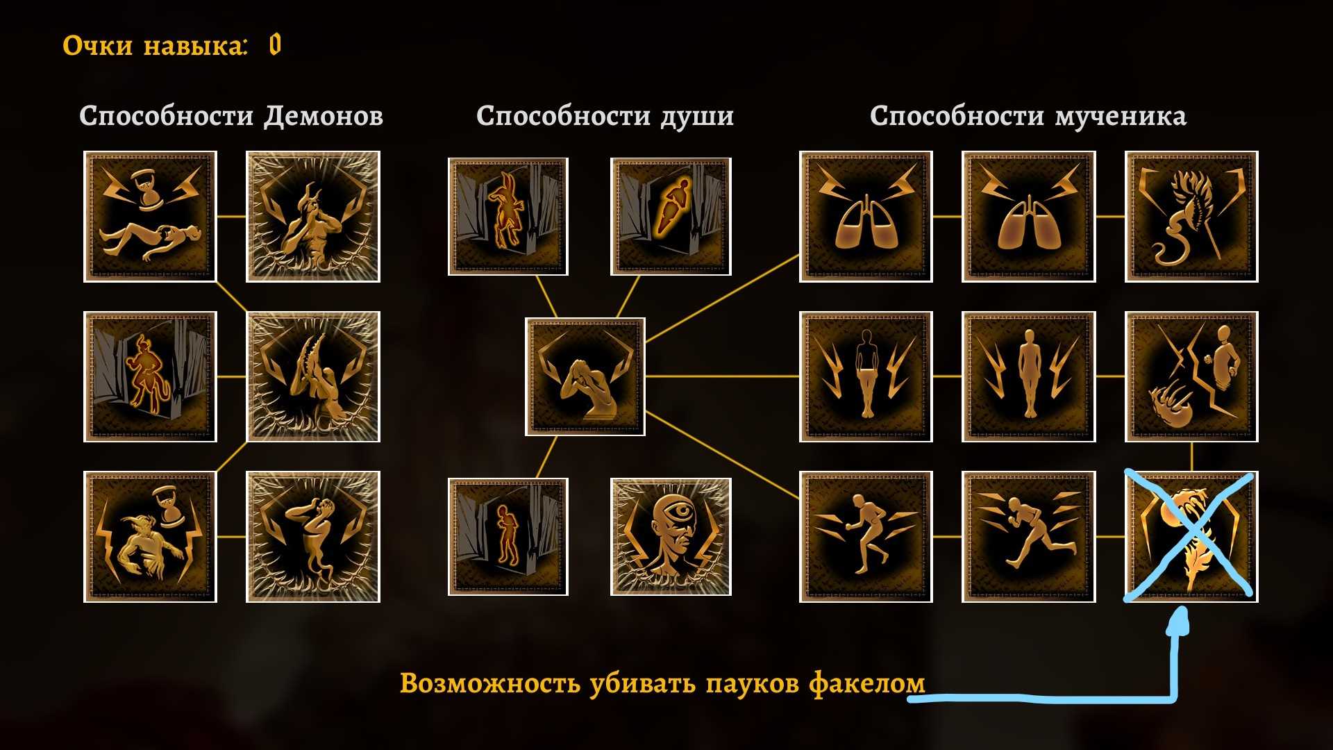 ЧЕЛОВЕК-ПАУКУбейте 15 пауков.В игре имеются существа собранные из частей человеческого тела, напоминающие пауков. Вам нужно убить 15 таких, убивать можно факелом прокачав соответствующий навык, или вселившись в демонов(Оноскелис, черт).