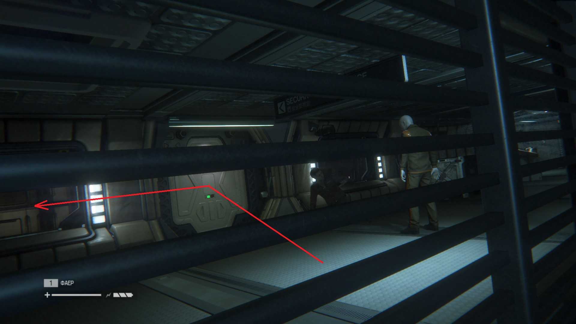 Заходим в лифт, поднимаемся на верхний уровень. В коридоре есть люк вентиляции, там несколько полезных предметов. Проходим в большой центральный зал, видим здесь чужого. Если немного подождать, то чужой сам уйдёт в вентиляцию на потолке.