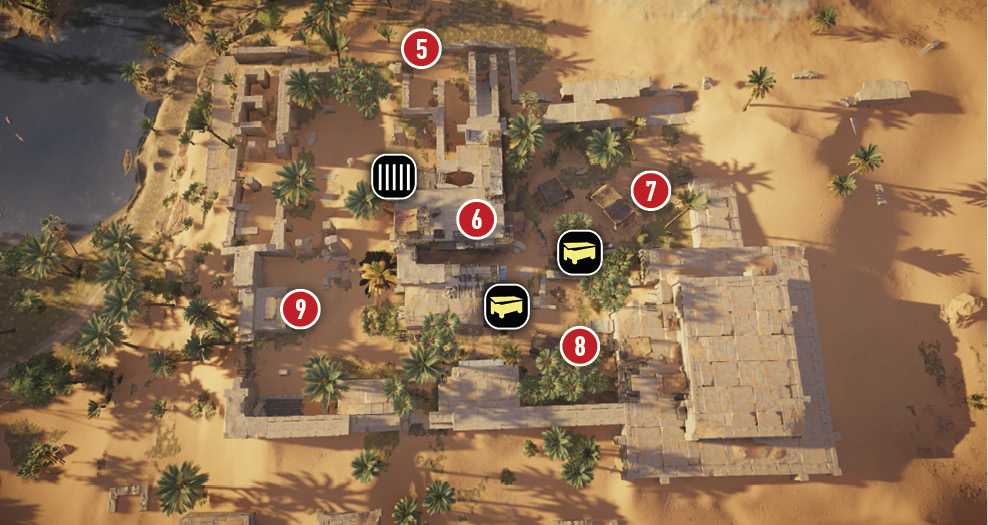 Используйте высокие стены и кусты, чтобы украдкой атаковать оставшихся бандитов, а затем соберите сокровища из палаток (7) и (8). Вы можете освободить гиену (9), чтобы охранники лагеря не скучали. Освободите Рашиди (6).