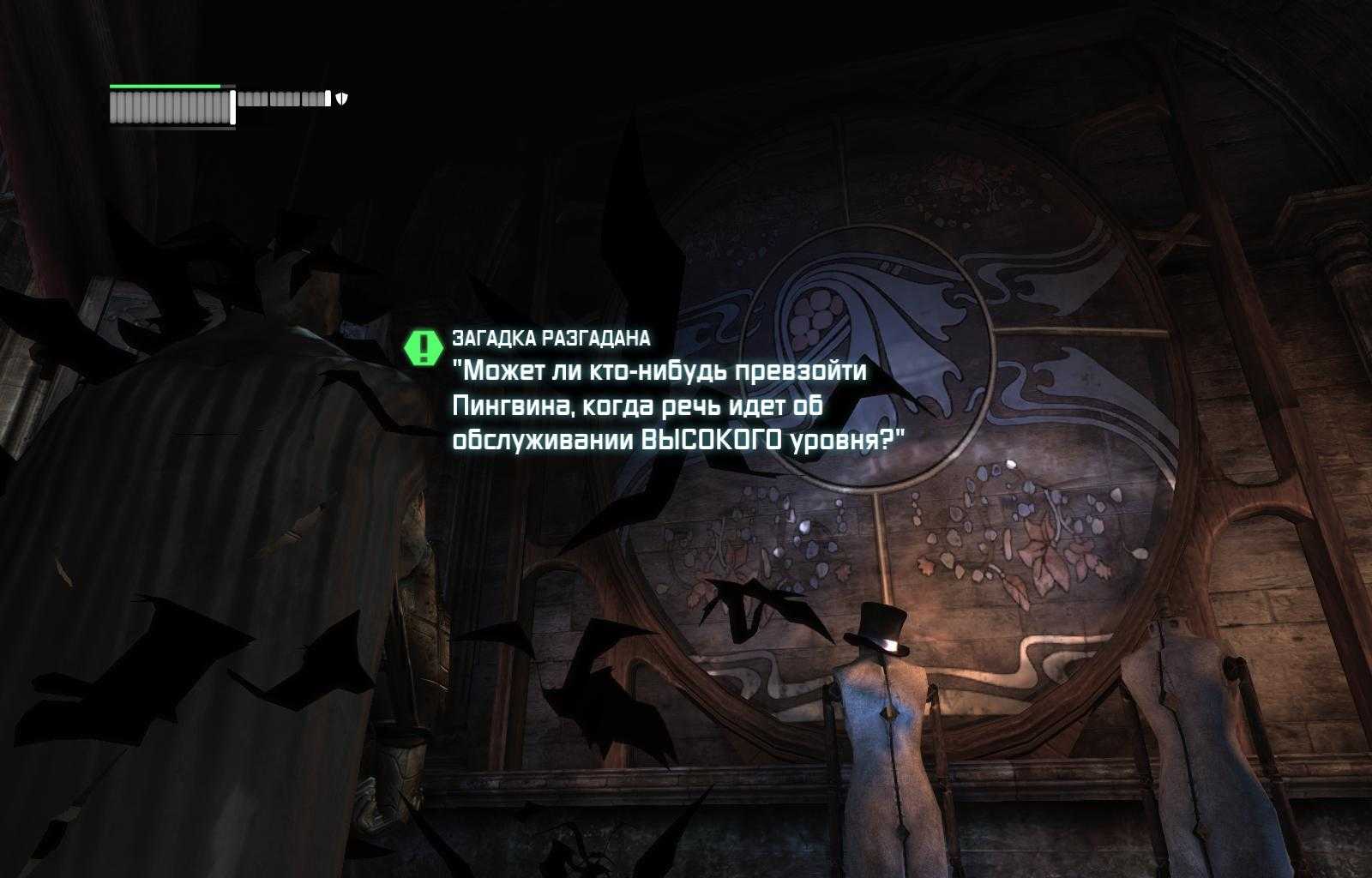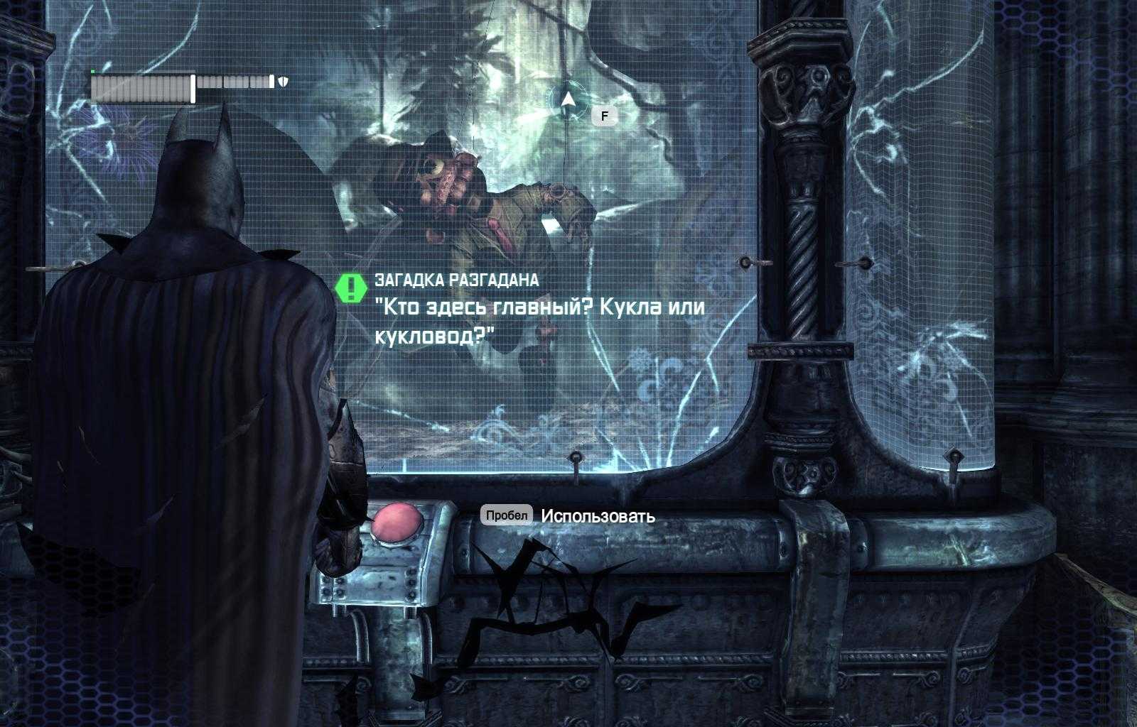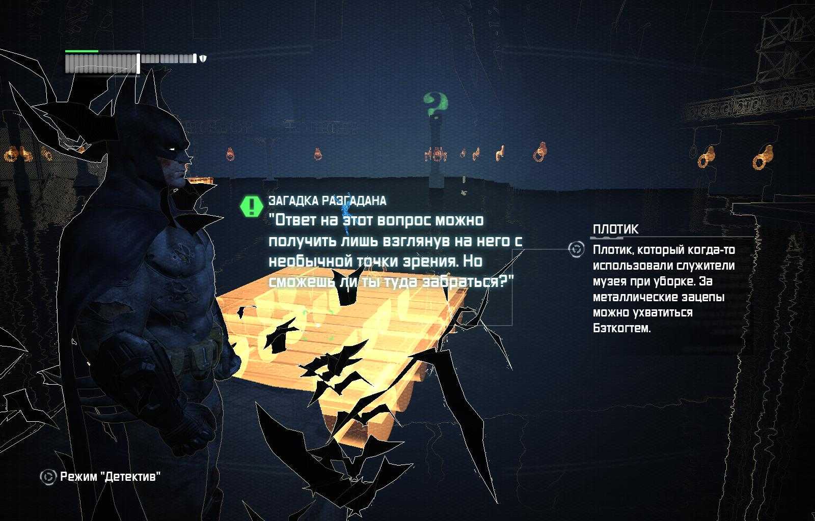 T1.2 – Достать бэткогтем с коня T1.3 – Взять с высокой колонны T1.4 – Взорвать одну мину деструктором, потом нанести гель и пройти в комнату T1.5 – Запускаем управляемый бэтаранг сначала в один, затем в второй знаки вопроса.
