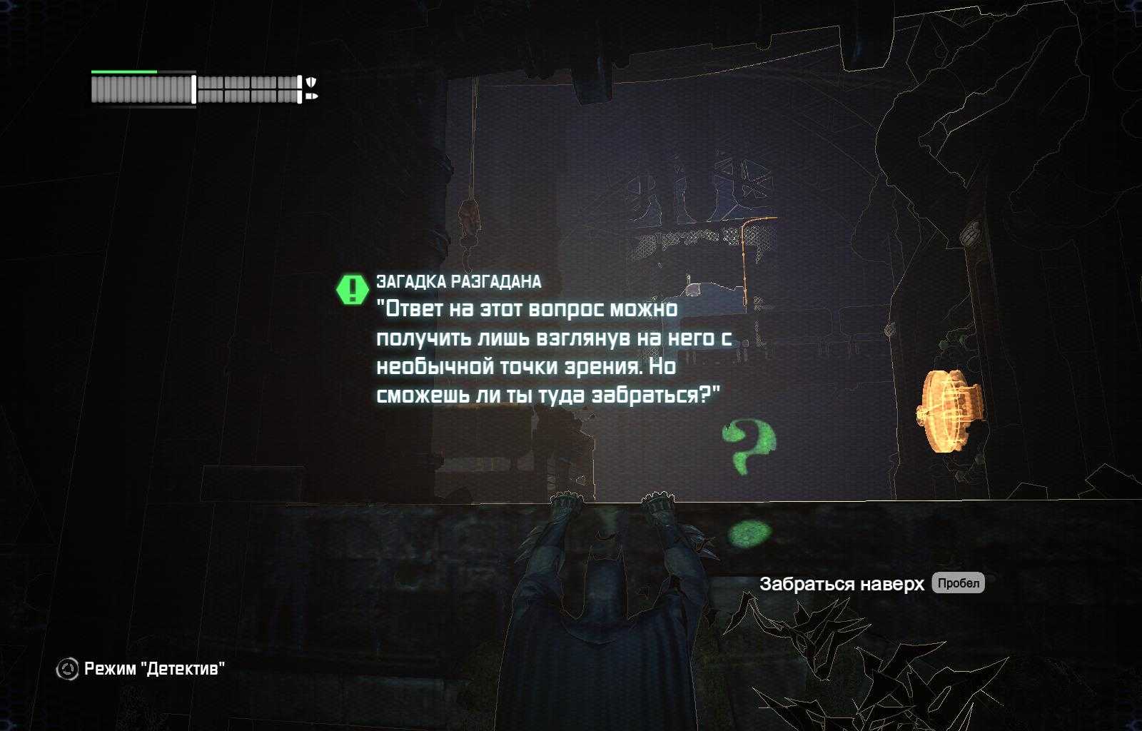 Задание 5. Район Парк аттракционов на корабле Пингвина. Смотрим на контейнер, поднятый краном, цепляемся бэткогтем за двери контейнера, чтобы их открыть. Стреляем в ящик оружия внутри контейнера.