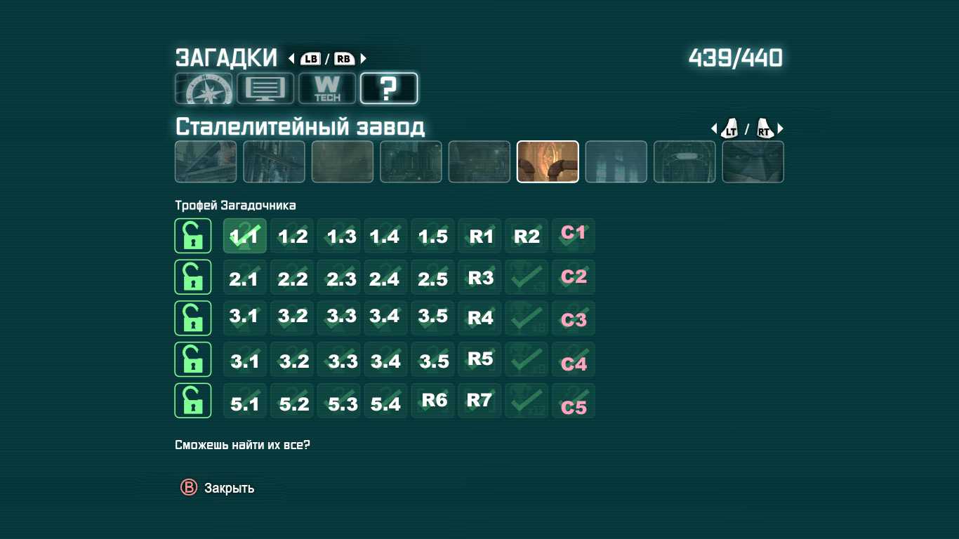 T3.1 – Открываем дверь шифровальным секвенсором. T3.2 – Под хрупким полом в лифтовой. T3.3 – Просто подбираем в застеновом пространстве. T3.4 – В пространстве под потолком. Прям над потоком. T3.5 – Разбиваем всех пингвинов, и нам выезжает приз