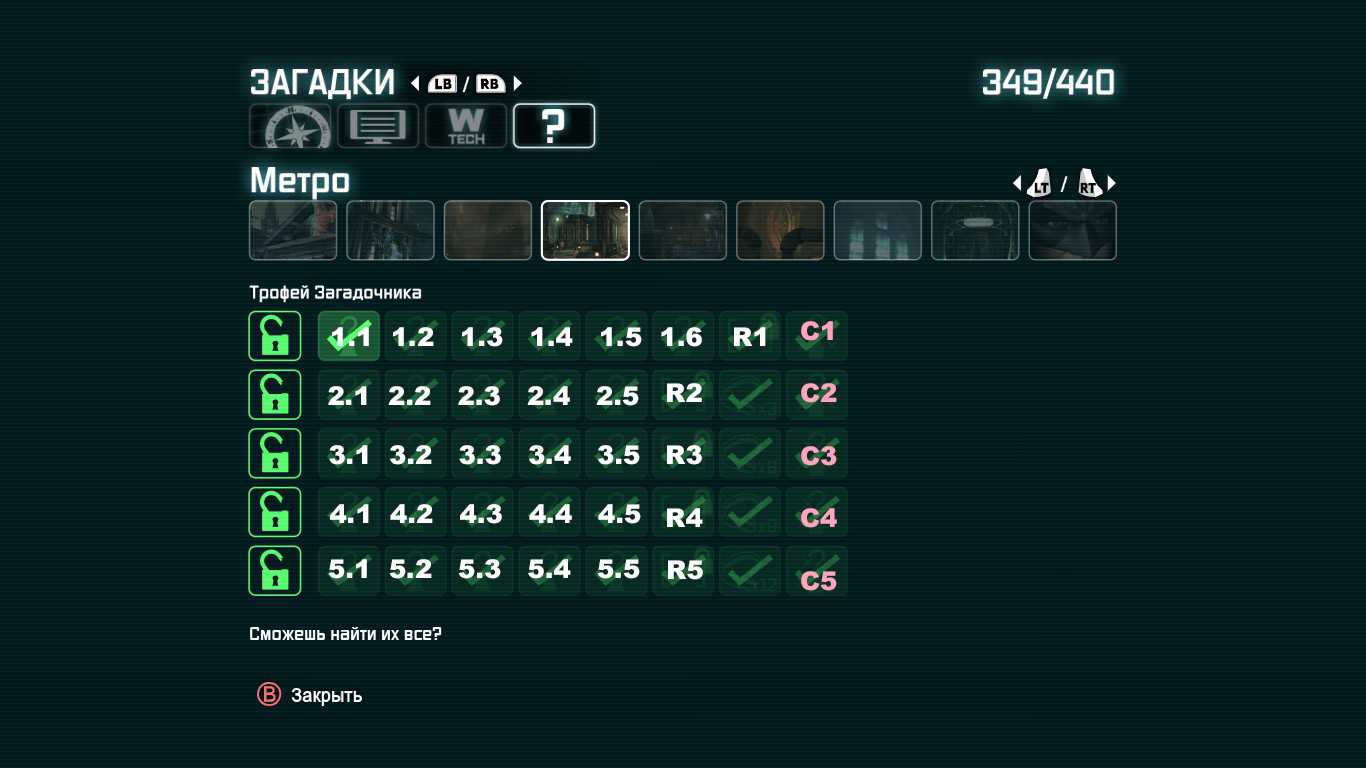 T1.1 – Открываем люк и забираем загадку. T1.2 – Открываем люк и забираем загадку. T1.3 – За хрупкой стенкой. T1.4 – Просто подбираем. T1.5 – Открываем ловушку шифровальным секвенсором и забираем Бэткогтем.