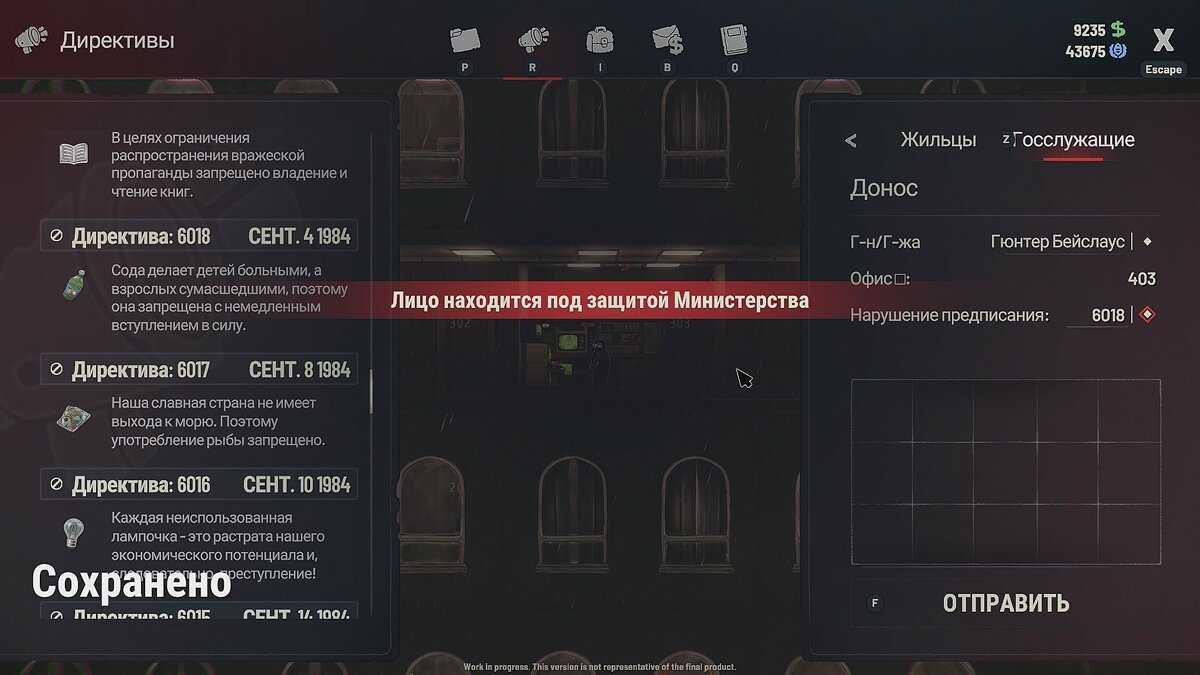 Во время прохождения мы сталкивались с багом, при котором было невозможно установить камеру наблюдения в кабинете Гюнтера. Если попытаться подбросить запрещённые предметы мужчине и донести на него, то форма будет отклонена, а вы — оштрафованы.