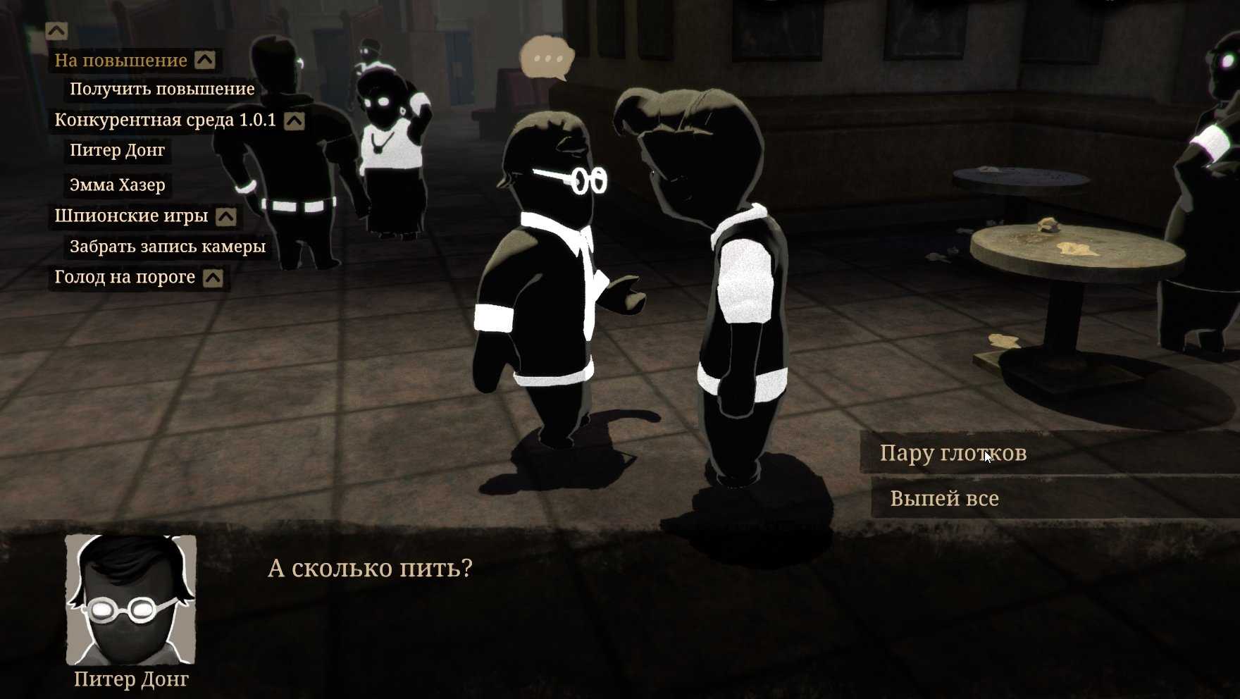 На следующий день узнайте о результатах встречи у Питера и снова предложите свою помощь. Теперь необходимо раздобыть бутылку виски (мы нашли ее в горшке с растением ранее) и брошюру, которая поможет начать разговор (она лежит в рабочем столе у Эммы Хазер). Если скажите выпить всю бутылку, то станет активным квест «Вредные советы», в котором вы потратите очки репутации чтобы уговорить Эмму простить Питера.