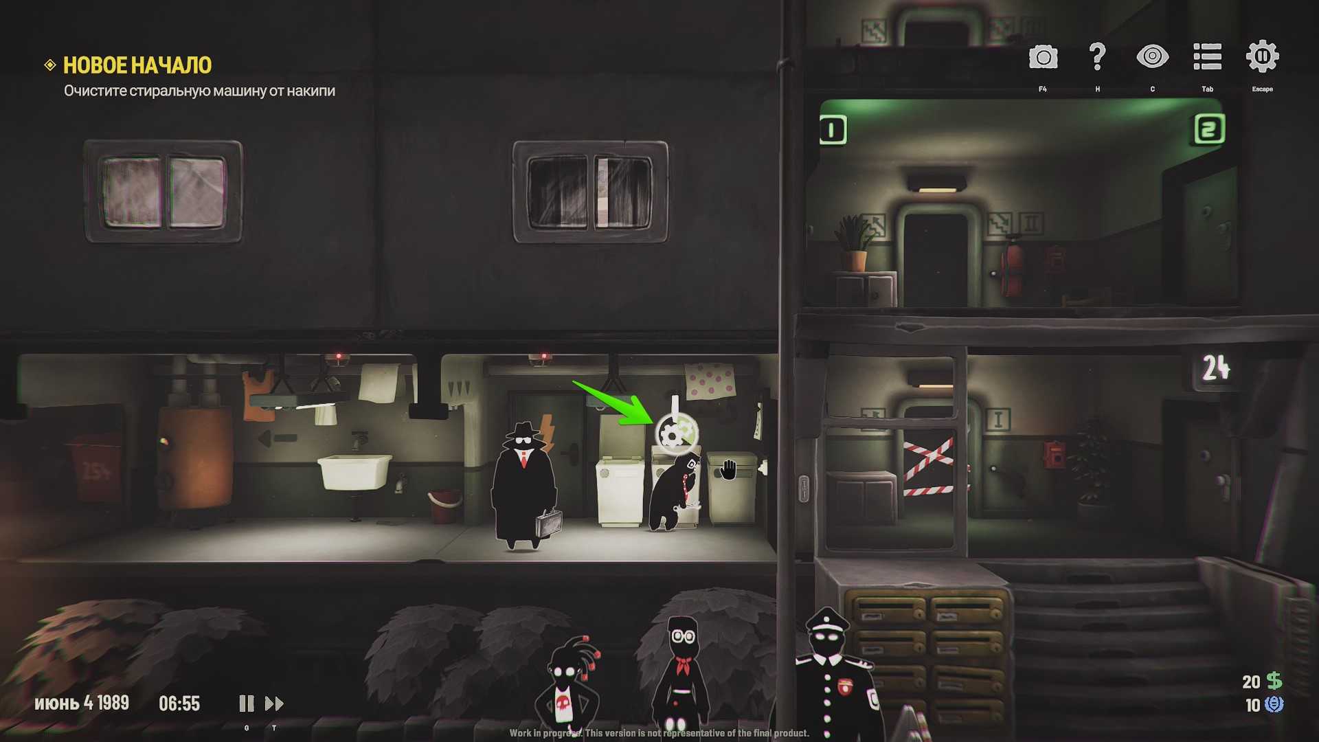 Поговорите с Эрнстом Мюллером и следуйте за ним. Мужчина расскажет о ваших обязанностях. Помимо того, что вам нужно отвечать на звонки и выполнять задания Министерства, ежедневно придётся чистить стиральную машину от накипи, добавлять в печь топливо и выносить мусор. Эти действия принесут вам немного денег: