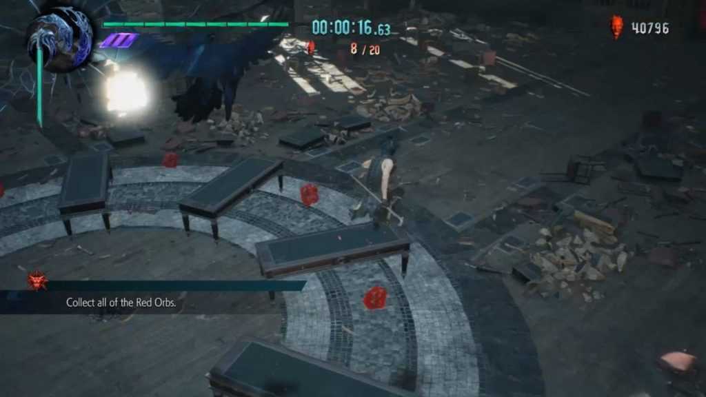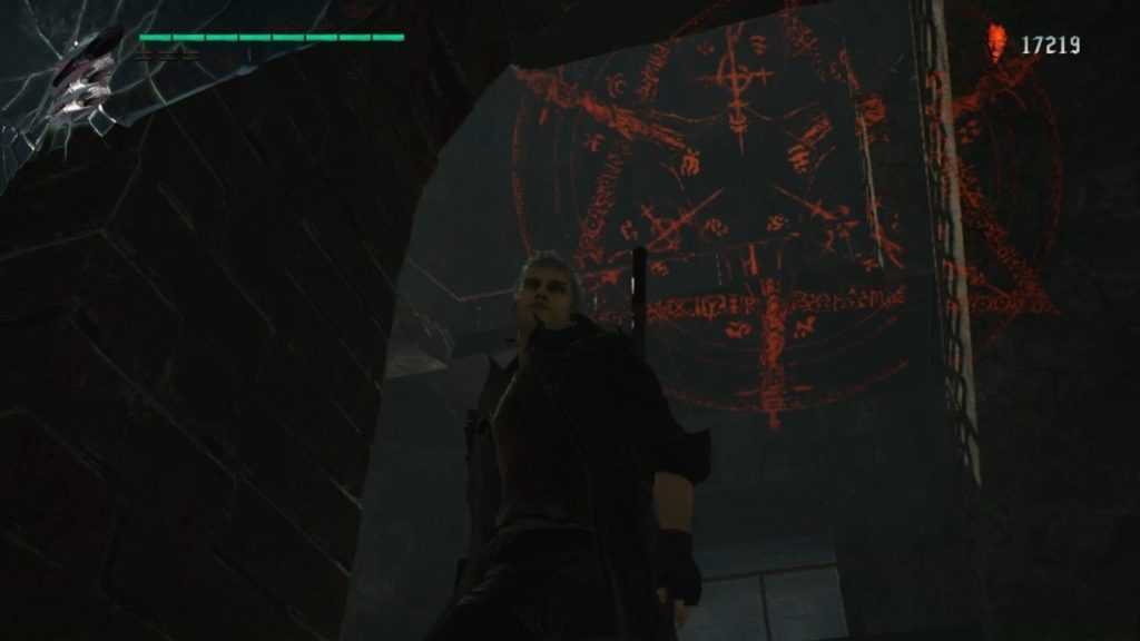 Боевая система V полностью отличается от Nero, и требуется время, чтобы узнать ее основы, сражаясь со слабыми противниками. После боя продолжайте, уничтожьте красный кристалл и бегите по лестнице. Выпрыгните на другую сторону и убейте группу летающих врагов.