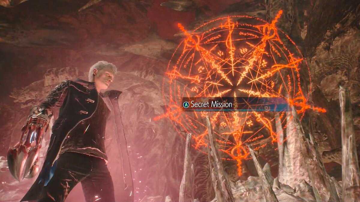 After where you fought the first group of enemies in the warehouse and dropped down, you can see a container on the left side in front of you and when you look closely the pattern of the secret icon will light up in red on the wall. Summon the Nightmare / and it will break through the wall (requires 3 purple bars of Devil Trigger). Fight the enemies behind the wall and then walk up the scaffold. At the top you find the red glow and need to look back where you came from.