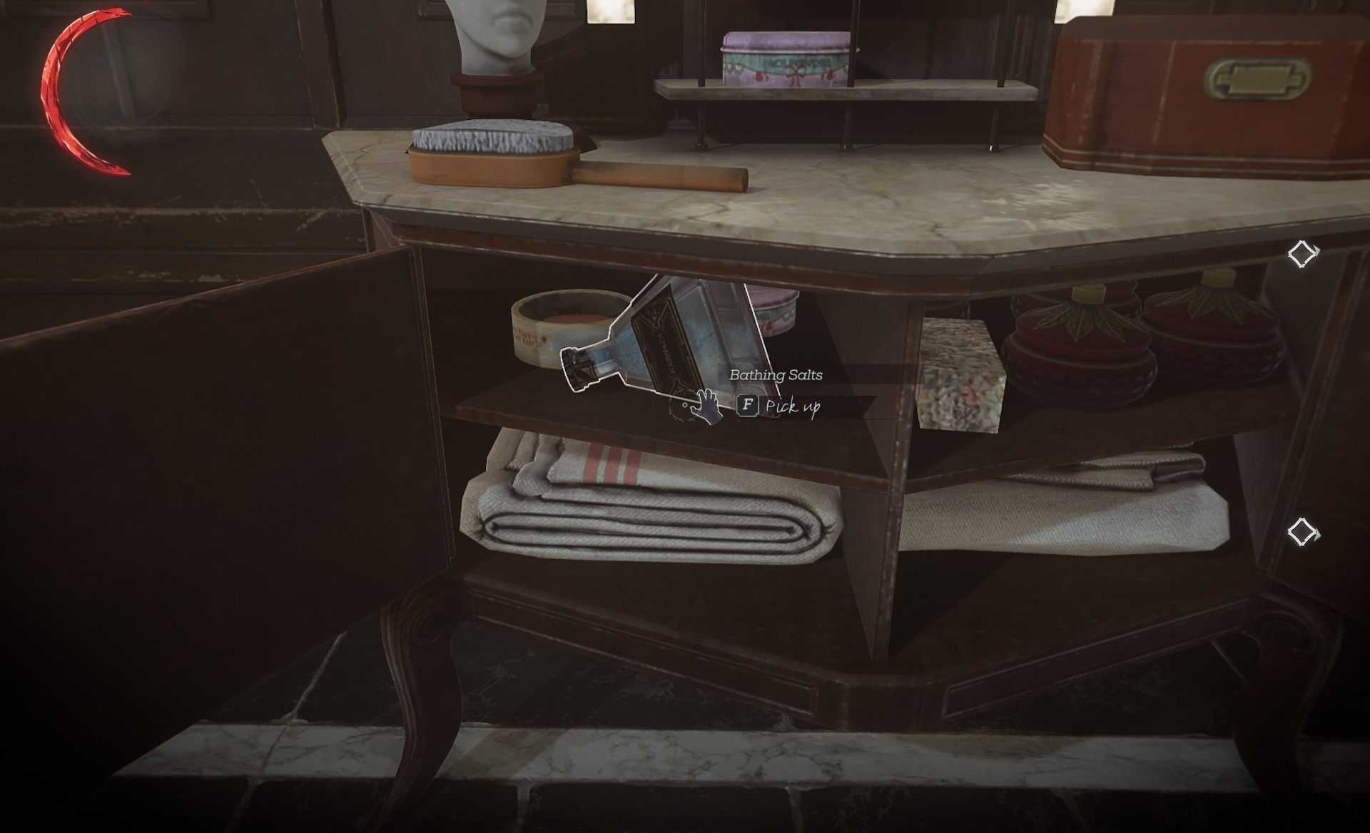 Верните свой меч и вернитесь в комнату за пределами королевских покоев. Здесь остался только один стражник – его достаточно легко подкараулить, но ещё легче задушить. Спрячьте его тело среди других павших и разграбьте эти комнаты. Среди шкафов вы найдёте несколько свободных монет, и, судя по всему, в Дануолле идёт бойкая торговля солями для ванн, так что захватите и их.