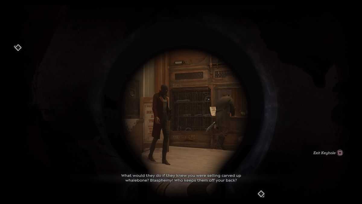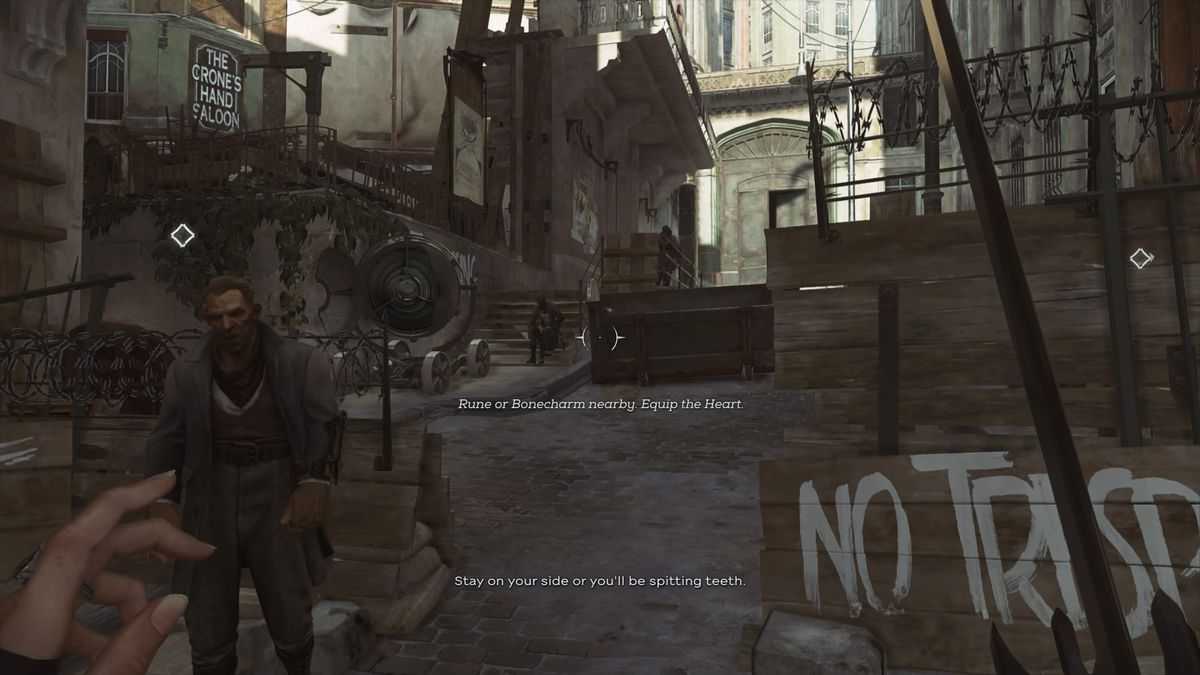 The black market is down the stairs on the right side of the street. Since you’re on the safe side of the No Trespassing signs, you can move freely. Hop over the railing and drop down. There’s a soup kitchen down there and a lot of people sitting around, but none of them will harass you. The market is behind the green door on the right just past the soup kitchen, but don’t burst in without checking the keyhole first. There are a couple Howlers in there shaking down the shopkeeper. Watch their conversation and wait them out. When they wrap up, duck out of the way and let them pass without seeing you. Then it’s safe to go inside. We covered how to rob the black market in the collectibles guide, so we won’t go into it here.