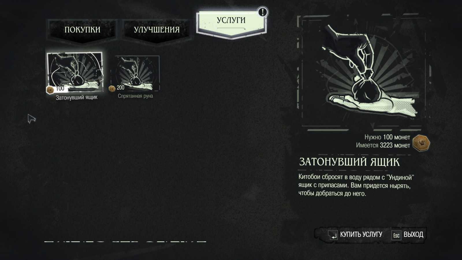 Перед началом миссии необходимо купить услугу «Затонувший ящик». Причал. За «Ундиной». В воде. Рядом находится буй. На дне в ящике.