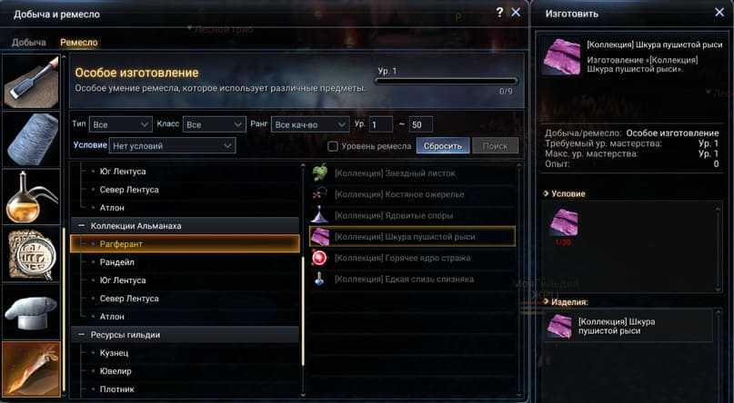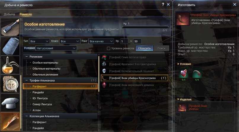 После сбора нужных предметов с пометкой (Часть трофея), игроку необходимо перейти в раздел «Ремесло», далее «Особое изготовление», «Трофеи Альманаха» и «Рагферант», выбрать необходимый предмет и приступить к его изготовлению.