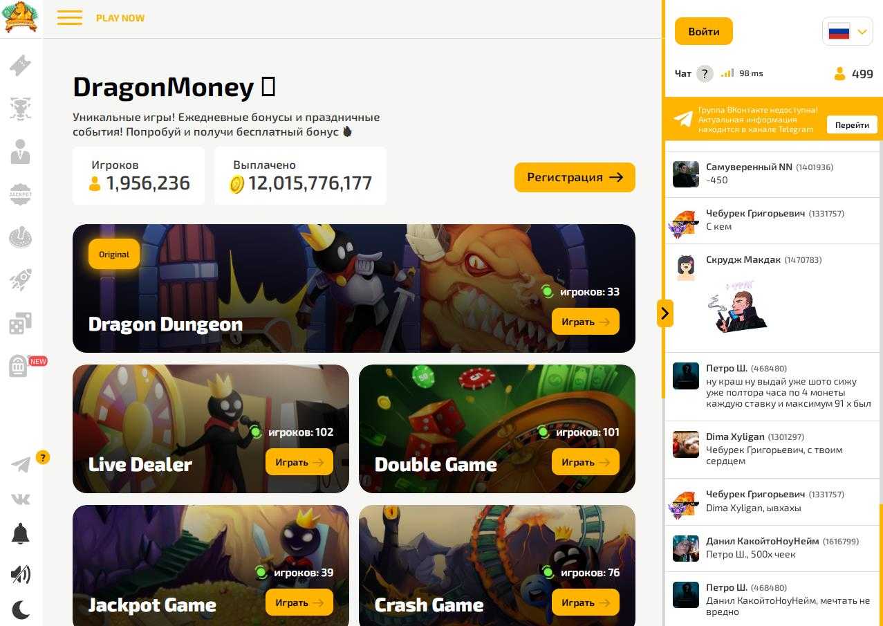 Площадка щедро благодарит пользователей за лояльность. Участникам, подписавшимся на официальные аккаунты Dragon Money в соцсетях, также гарантированы денежные бонусы. Если игрок привяжет аккаунт Телеграм и подключит двухфакторную защиту, то получит еще 50 условных монет, а если разрешит сообществу ВКонтакте уведомлять его о важных событиях, то будет награжден 30 монетами.