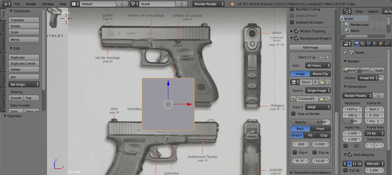 При создании High-Poly модели нет необходимости экономить полигоны, используйте столько, сколько считаете нужным. Не жалейте полигонов на всеразличные мелкие детали и порезы. Для удобства вы можете использовать Hotkeys (горячие клавиши), которые сильно упростят вам жизнь и сэкономят уйму времени. Все полезные горячие клавиши Blender написаны в этой статье: Горячие клавиши Blender3D. Нам же понадобятся только некоторые из них: E — экструдирование, G — перемещение, S — масштабирование, Ctrl+B — фаска, Z — переход в режим Wireframe, X — удаление, A — выделение всех элементов, если нажать A в режиме редактирования, то выделятся все точки/ребра/плоскости, H — скрыть объект.