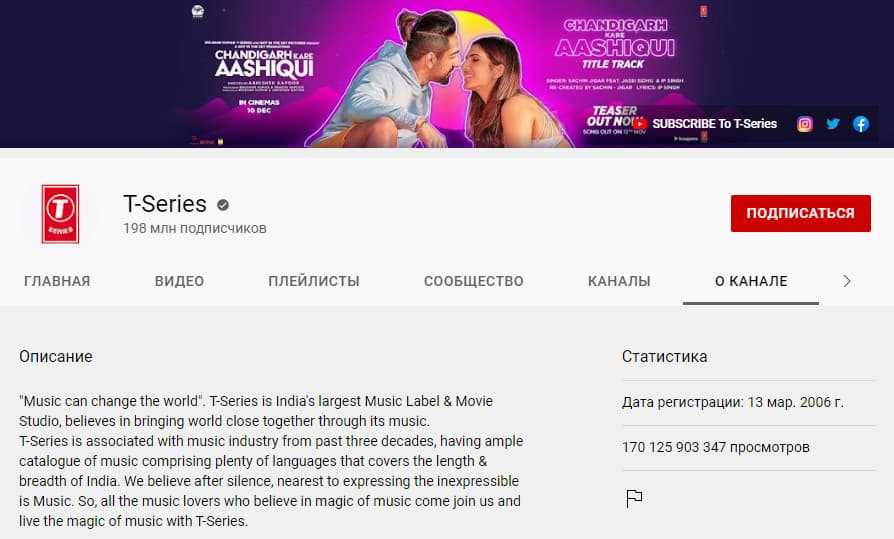 Один из самых популярных в мире ютуб-каналов — индийский T-series. Здесь рассказывают о музыке и кино, а количество подписчиков составляет 198 млн пользователей. Доходность канала не раскрывается, но эксперты предполагают, что она может составлять до 11 млн долларов в месяц.