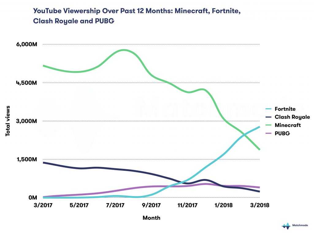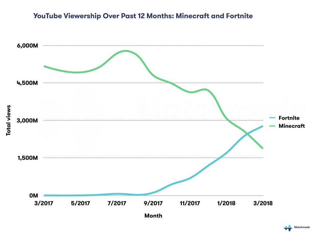 Конечно, это впечатлительные результаты, но судя по данным маркетинговой платформы Matchmade, Fortnite даже превзошла такого гиганта, как Minecraft и стала самой просматриваемой игрой на YouTube. Minecraft долгое время доминировала в игровом разделе YouTube, собирая миллиарды просмотров в месяц. Но ее популярность продолжает падать с прошлого лета, и пока Fortnite ещё предстоит достичь самого пика Minecraft, она уже успела с отрывом уйти вперёд, набрав 2.4 миллиарда просмотров в феврале и на этом не собирается останавливаться.