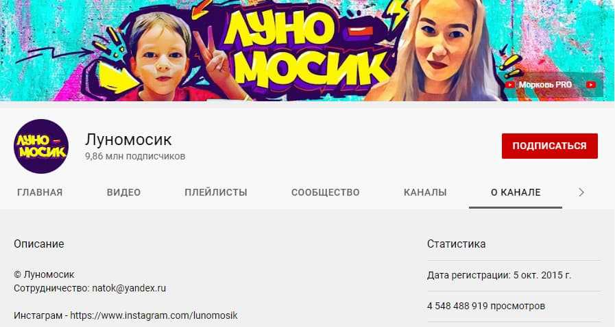 Луномосик — развлекательный канал с челленджами и играми для детей. У него больше 4 млрд просмотров и почти 10 млн подписчиков. Предполагаемый доход — 4 млн долларов в год.