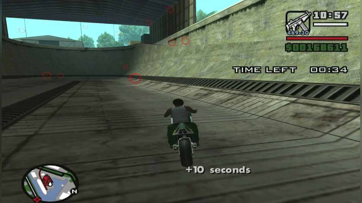 Найдите мотоцикл NRG-500 в заброшенном сухом доке в Сан Фиерро, он находится в районе Восточный аэропорт. Рядом с доком стоит большой корабль, а к самому доку подходит ветка железной дороги. Цель миссии такая же, как и в миссии трюкача на велосипеде BMX – нужно собрать все чекпоинты за время, которое будет прибавляться, с очередным собранным чекпоинтом. Миссия сложнее чем, аналогичная на BMX, и требует виртуозного управления мощным мотоциклом. Советую сначала собрать все легкие чекпоинты, расположенные на земле и на дне сухого дока, а затем приступить к более сложным, висящим довольно высоко в воздухе.
