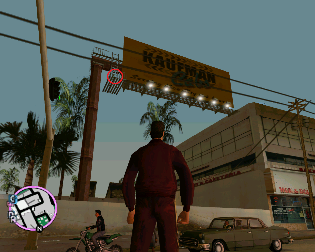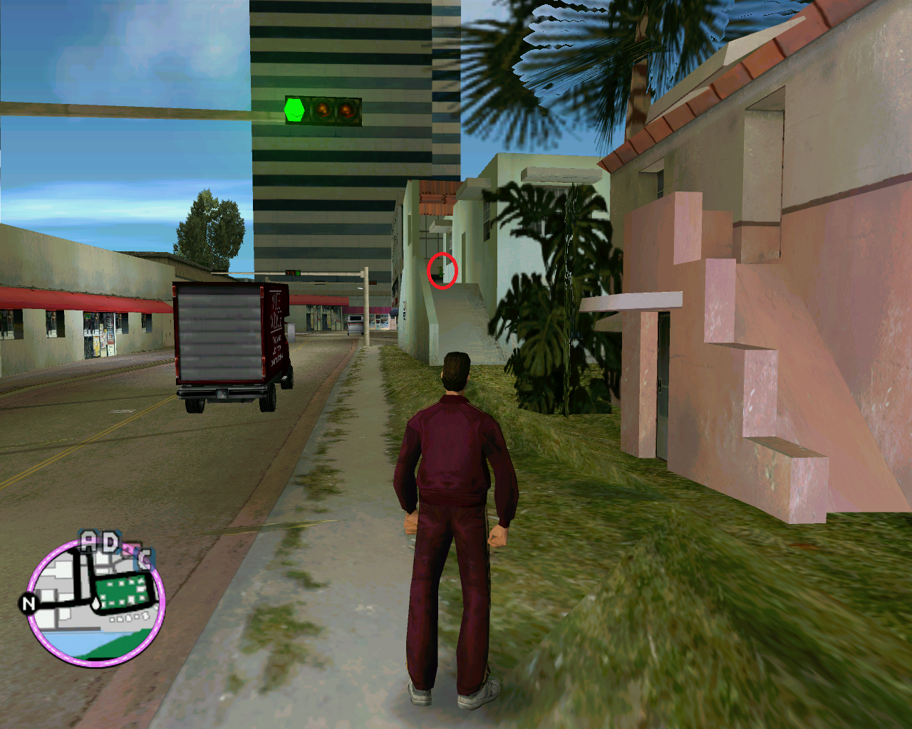 На первом острове в районе Ocean Beach между двумя переодевалками «Rafael’s» и «Collars & Cuffs» (см. «Большую географическую карту Vice City») расположена многоэтажная стоянка (въезд со стороны «Collars & Cuffs»). На крыше этой стоянки припаркован Stallion. Садимся в него и начинается миссия. Цель миссии: проехать 5 чекпоинтов пока не закончилось время, не збив при этом не одной фишки. Время идет в обратном порядке. За каждый чекпоинт добавляется 11 секунд. За прохождение в первый раз получаете 200$, за каждое последующее прохождение выигрыш удваивается.