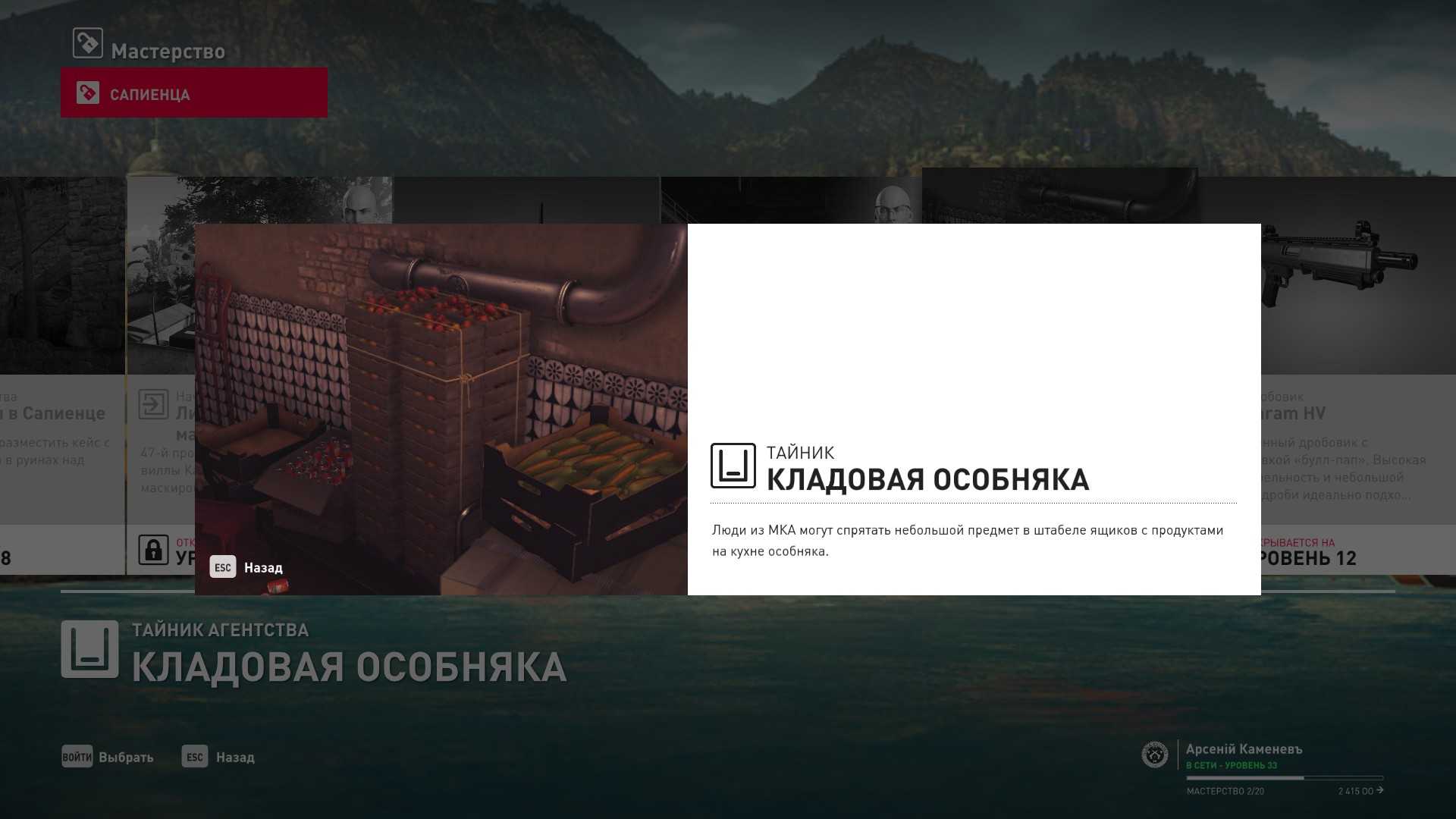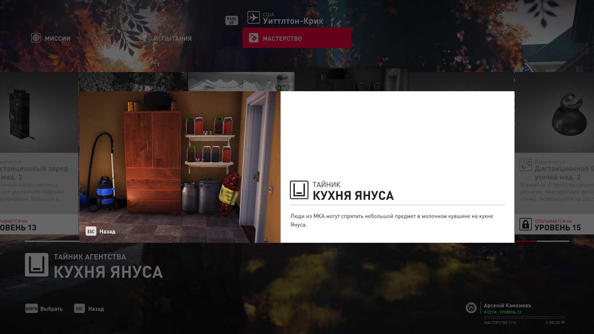 12 уровень мастерства: Начальная точка в боковом саду в маскировке смотрителя 13 уровень мастерства: Тайник МКА в кладовой
