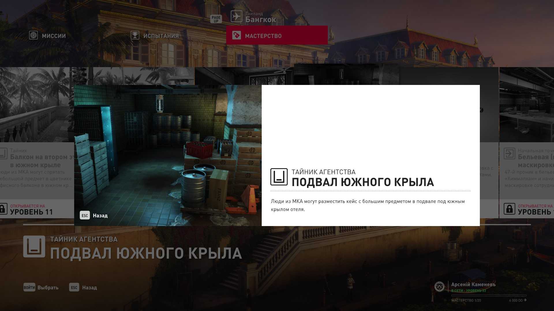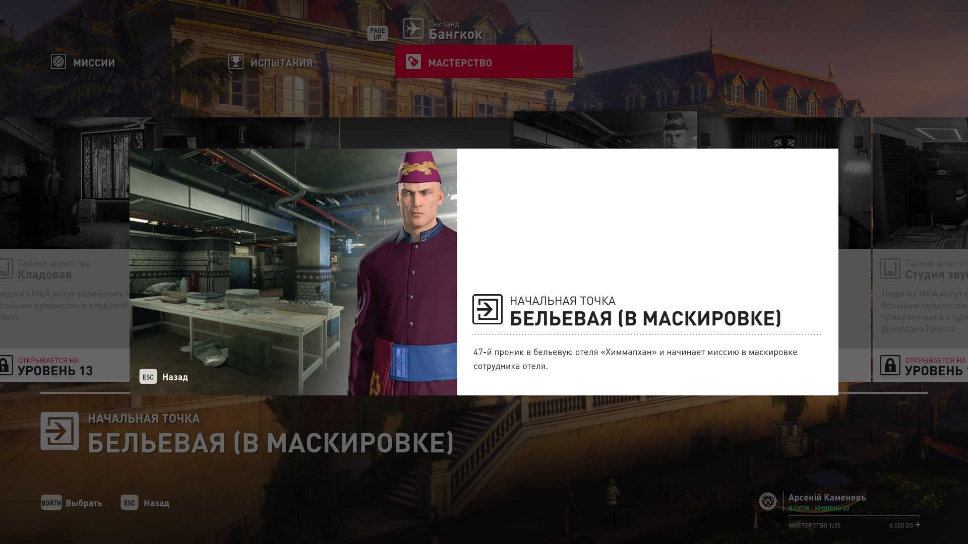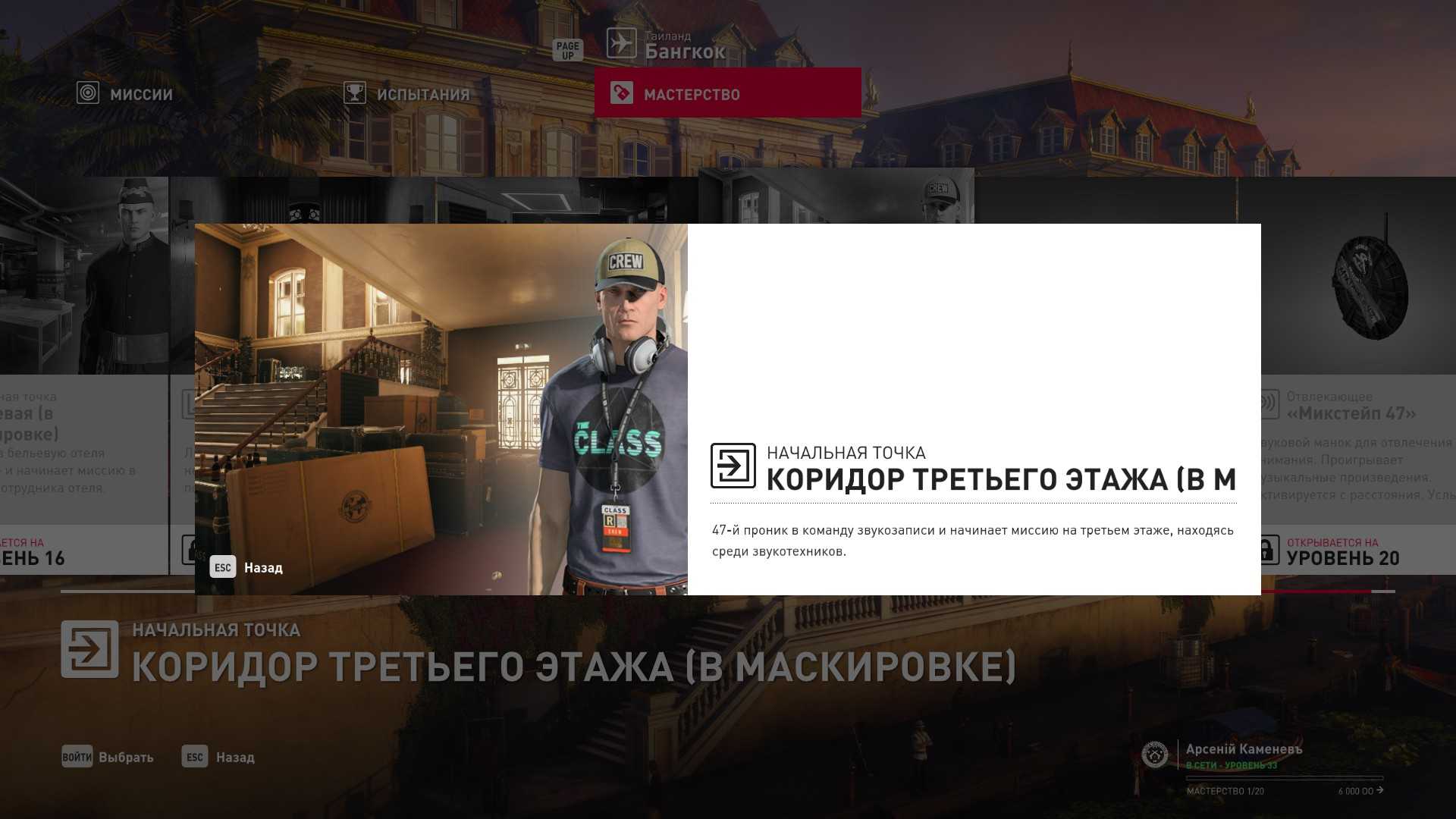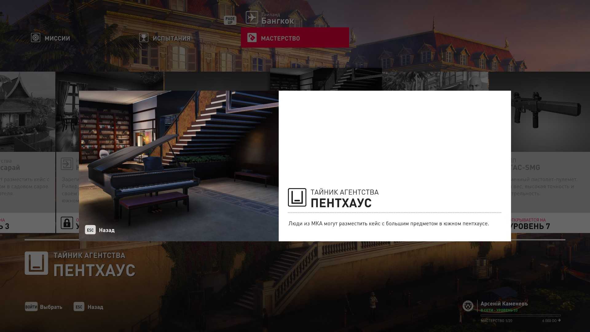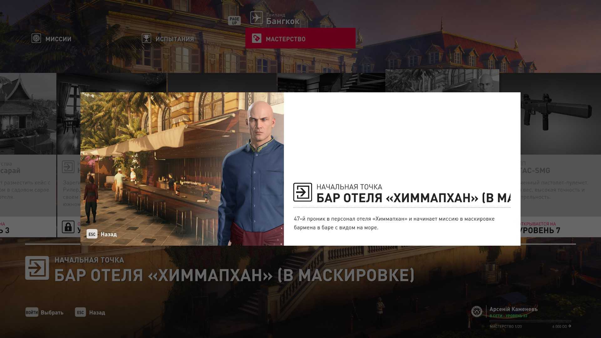 6 уровень мастерства: Тайник МКА в пентхаусе 7 уровень мастерства: Начальная точка в ресторане отеля “Химмапхан” в маскировке бармена и пистолет-пулемёт TAC-SMG