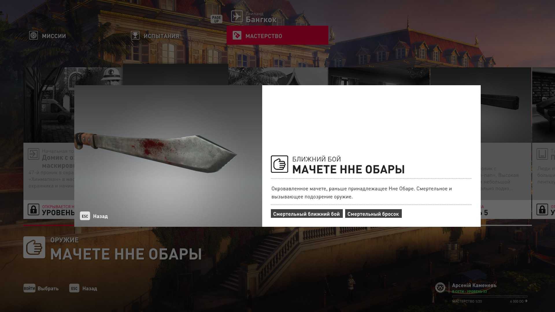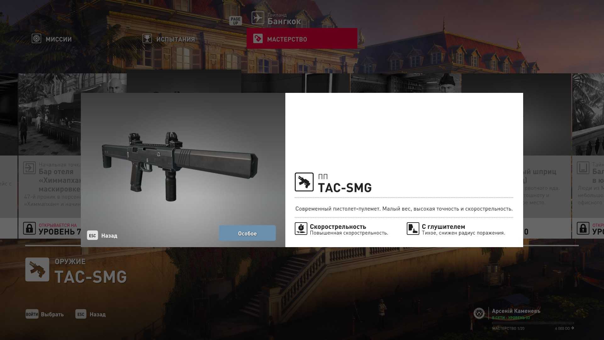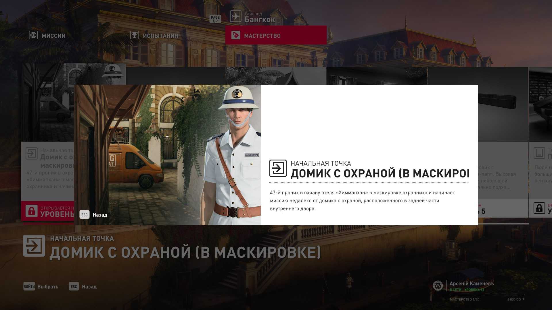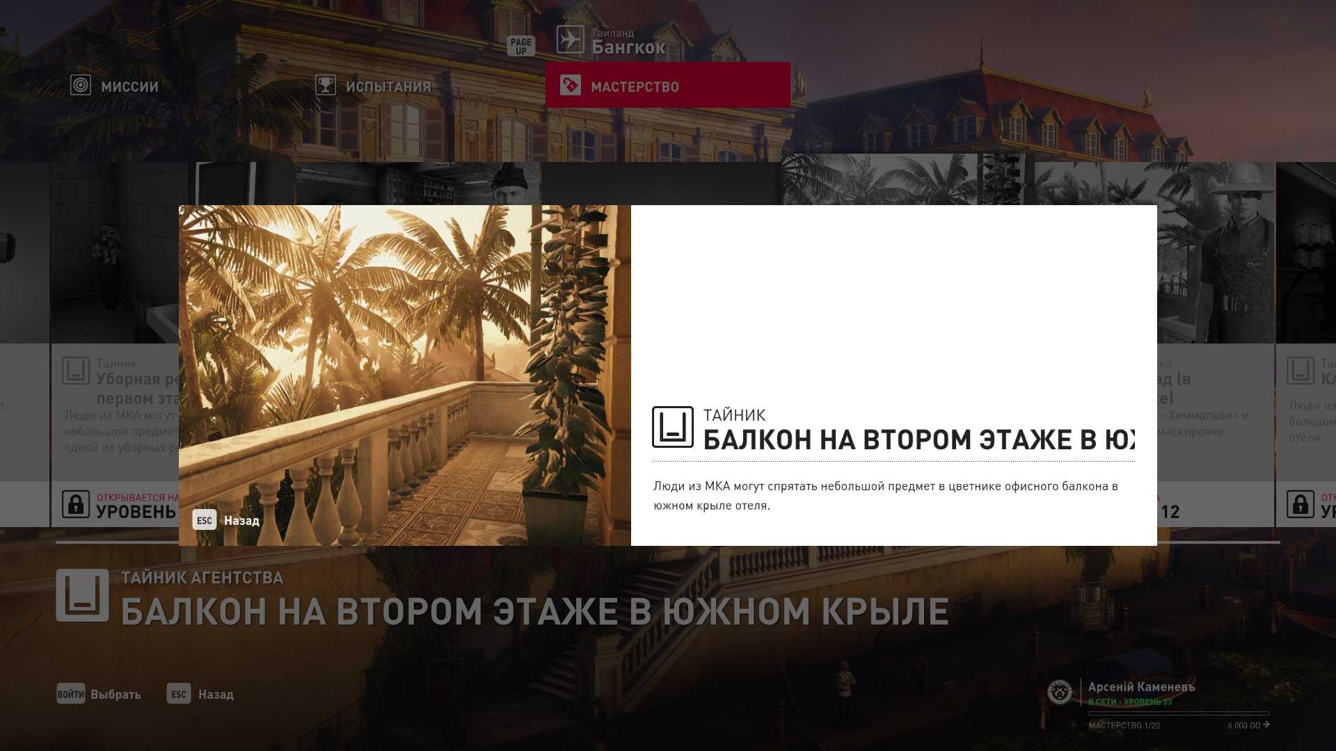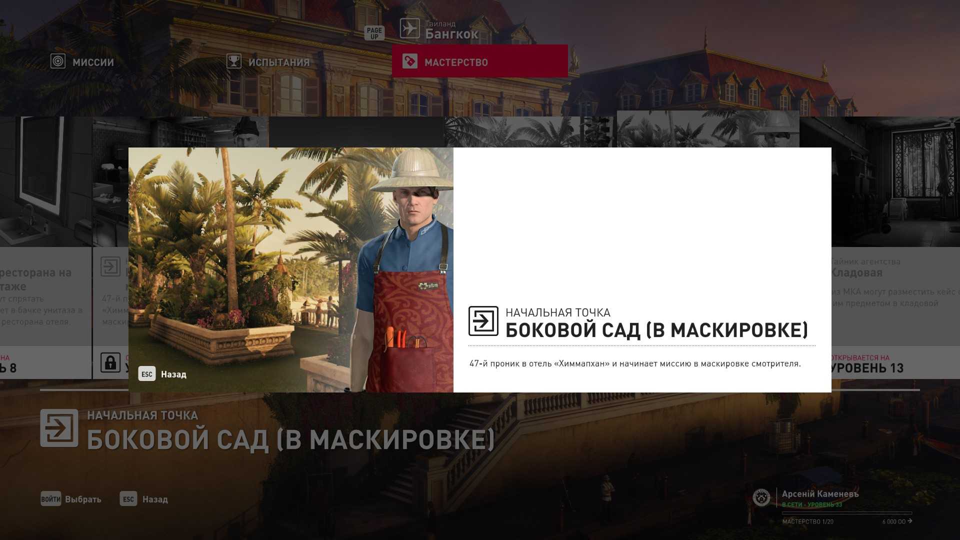 6 уровень мастерства: Тайник МКА в пентхаусе 7 уровень мастерства: Начальная точка в ресторане отеля “Химмапхан” в маскировке бармена и пистолет-пулемёт TAC-SMG