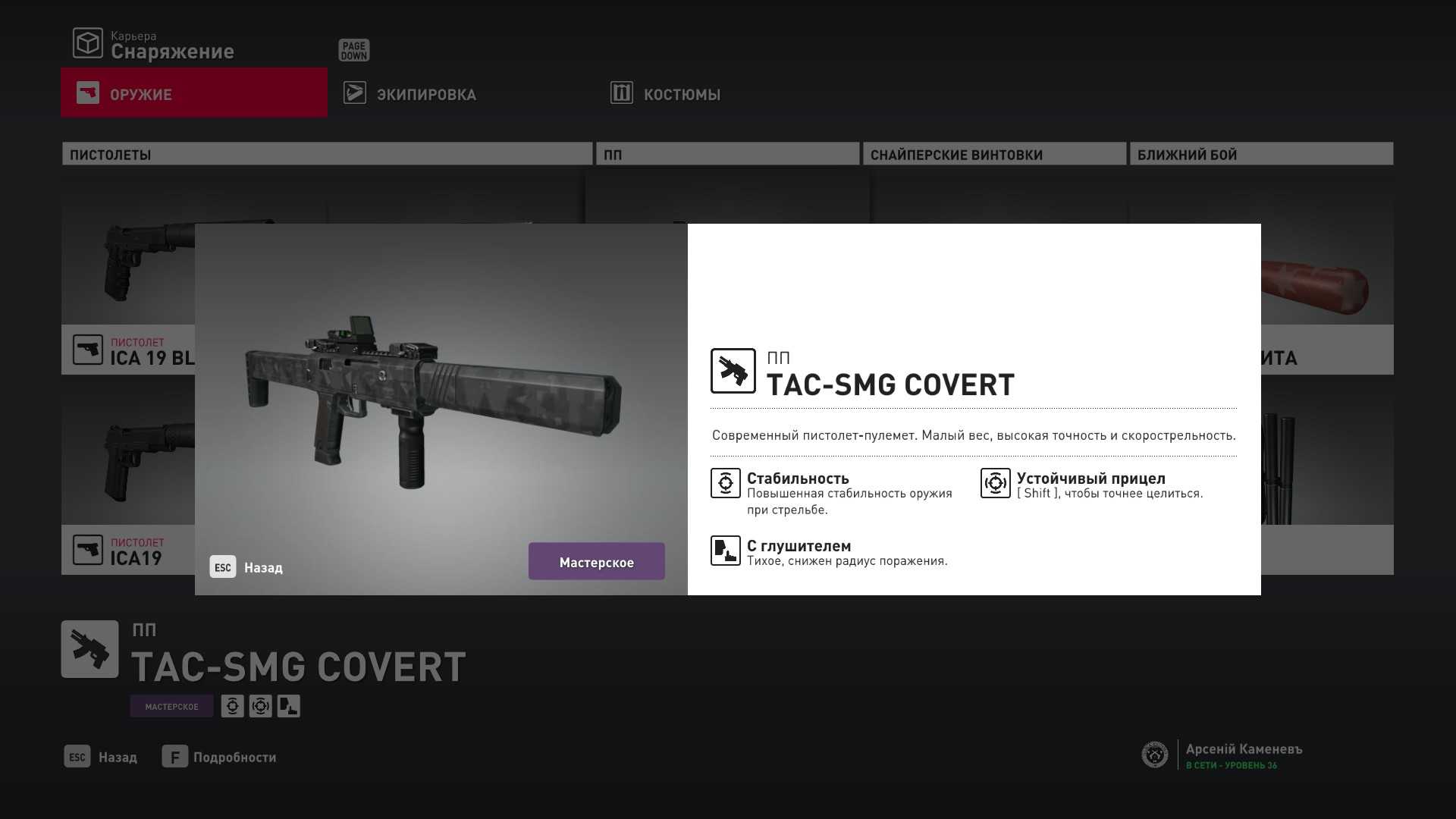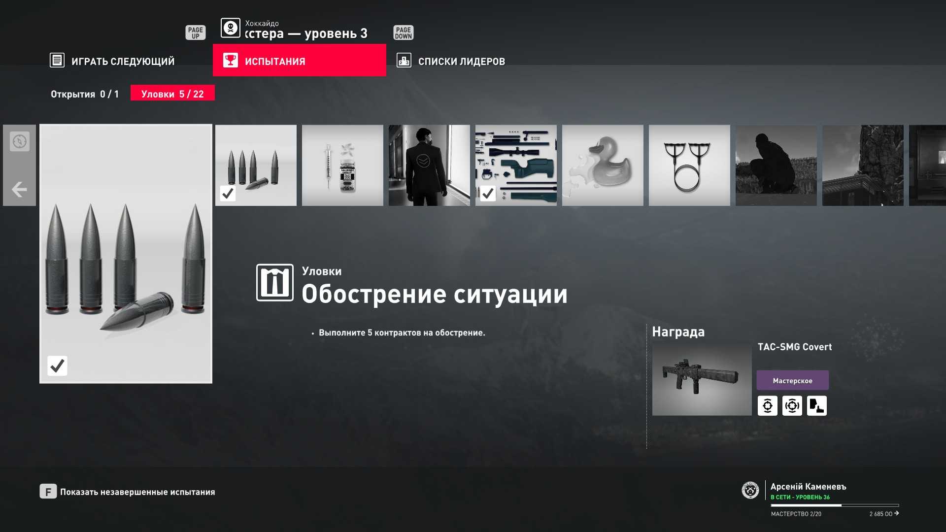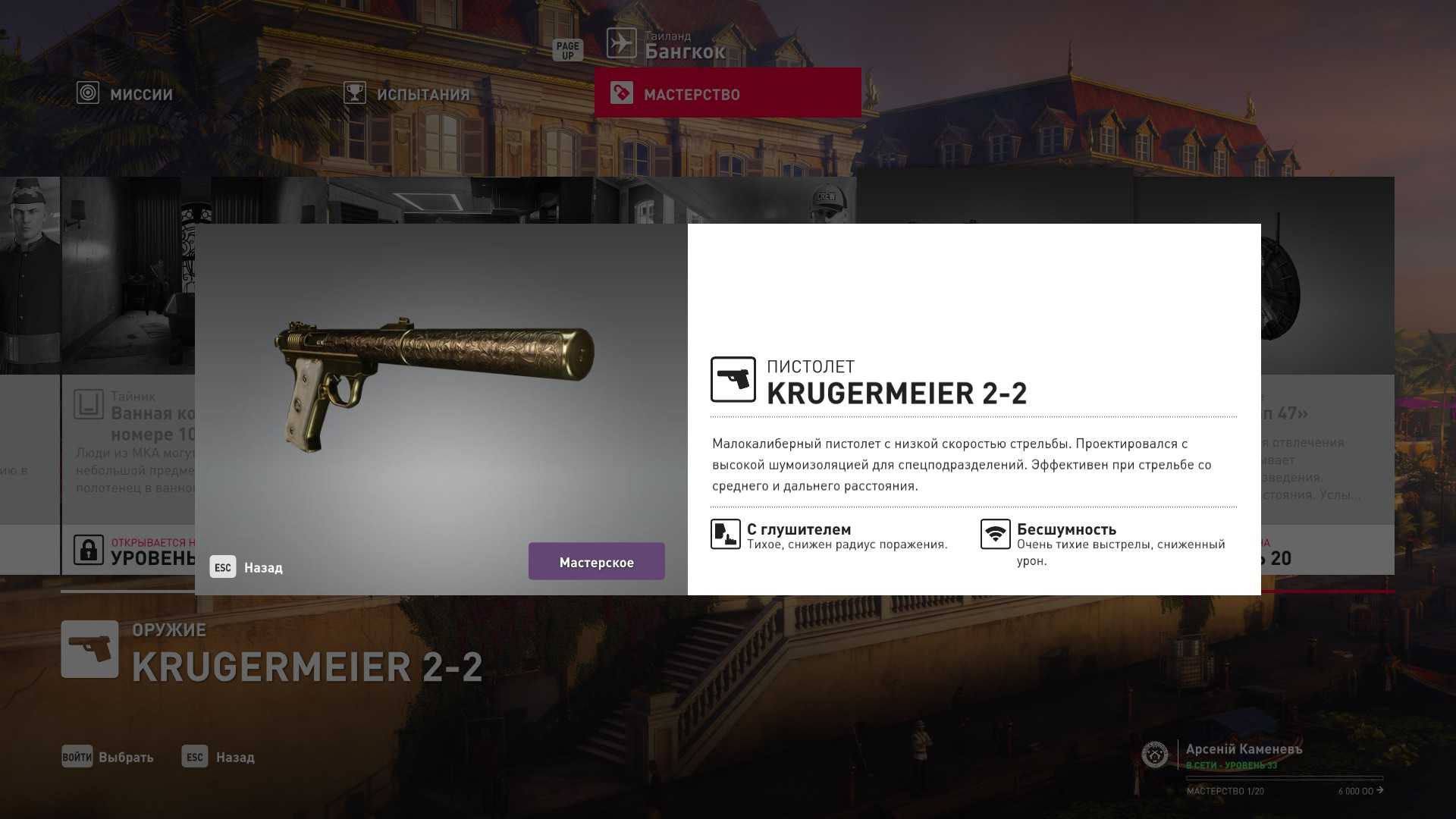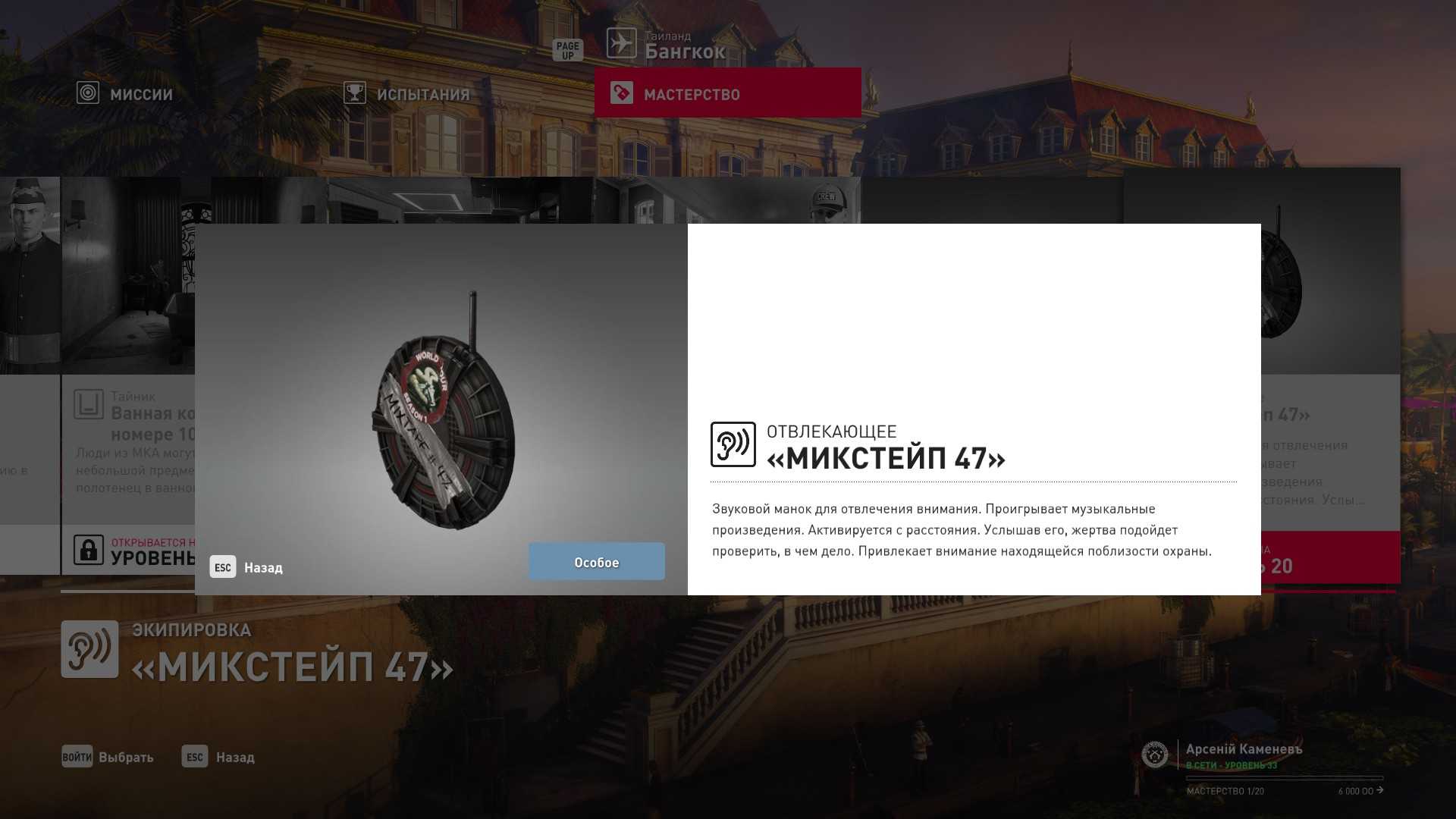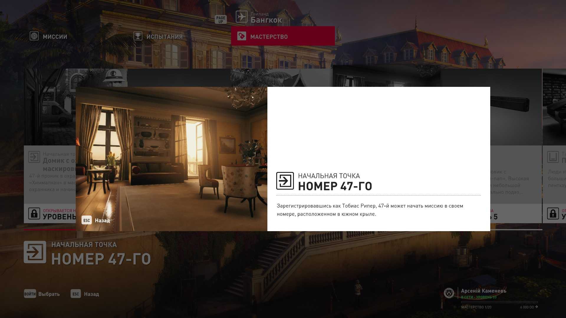 6 уровень мастерства: Тайник МКА в пентхаусе 7 уровень мастерства: Начальная точка в ресторане отеля “Химмапхан” в маскировке бармена и пистолет-пулемёт TAC-SMG
