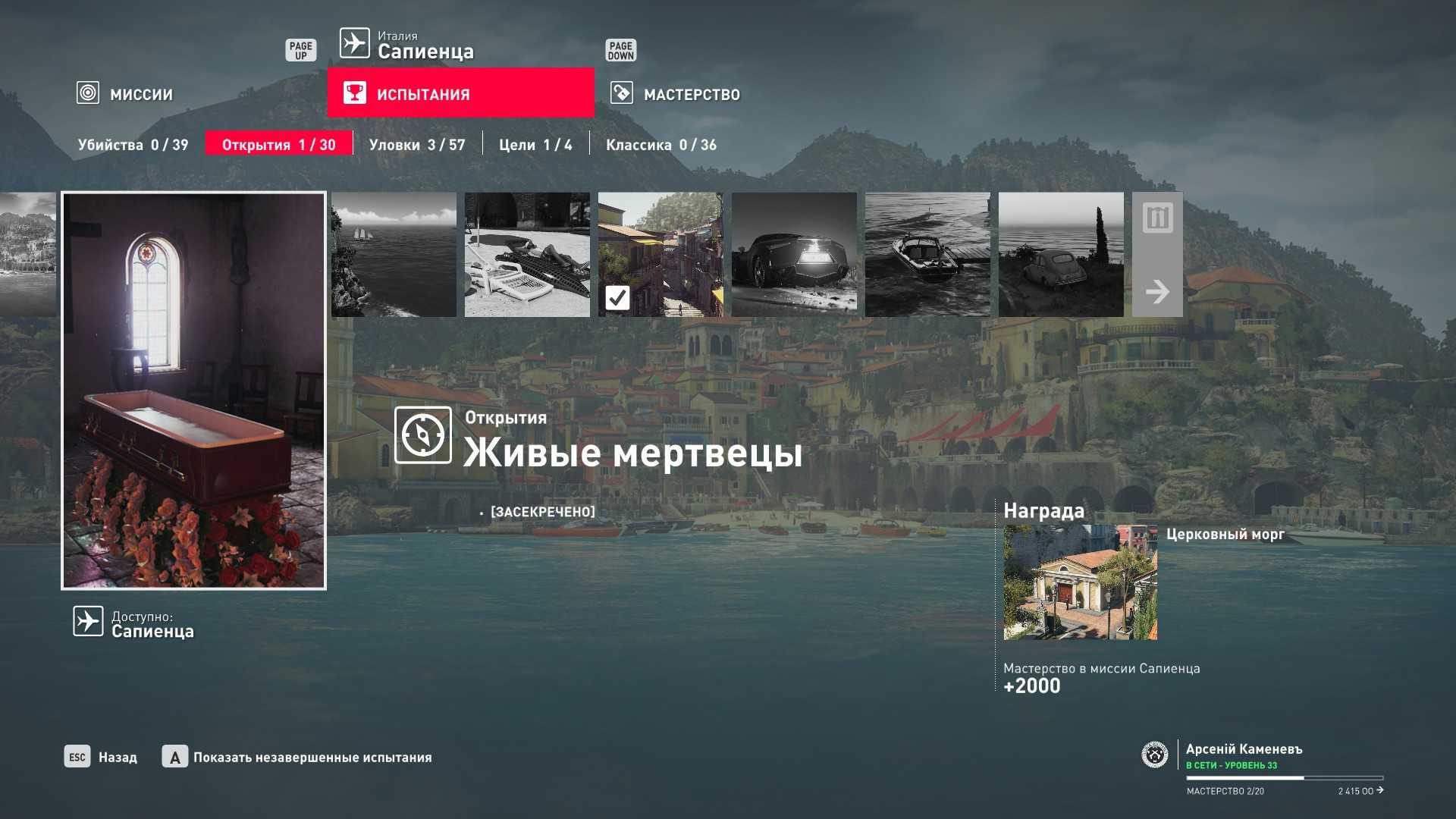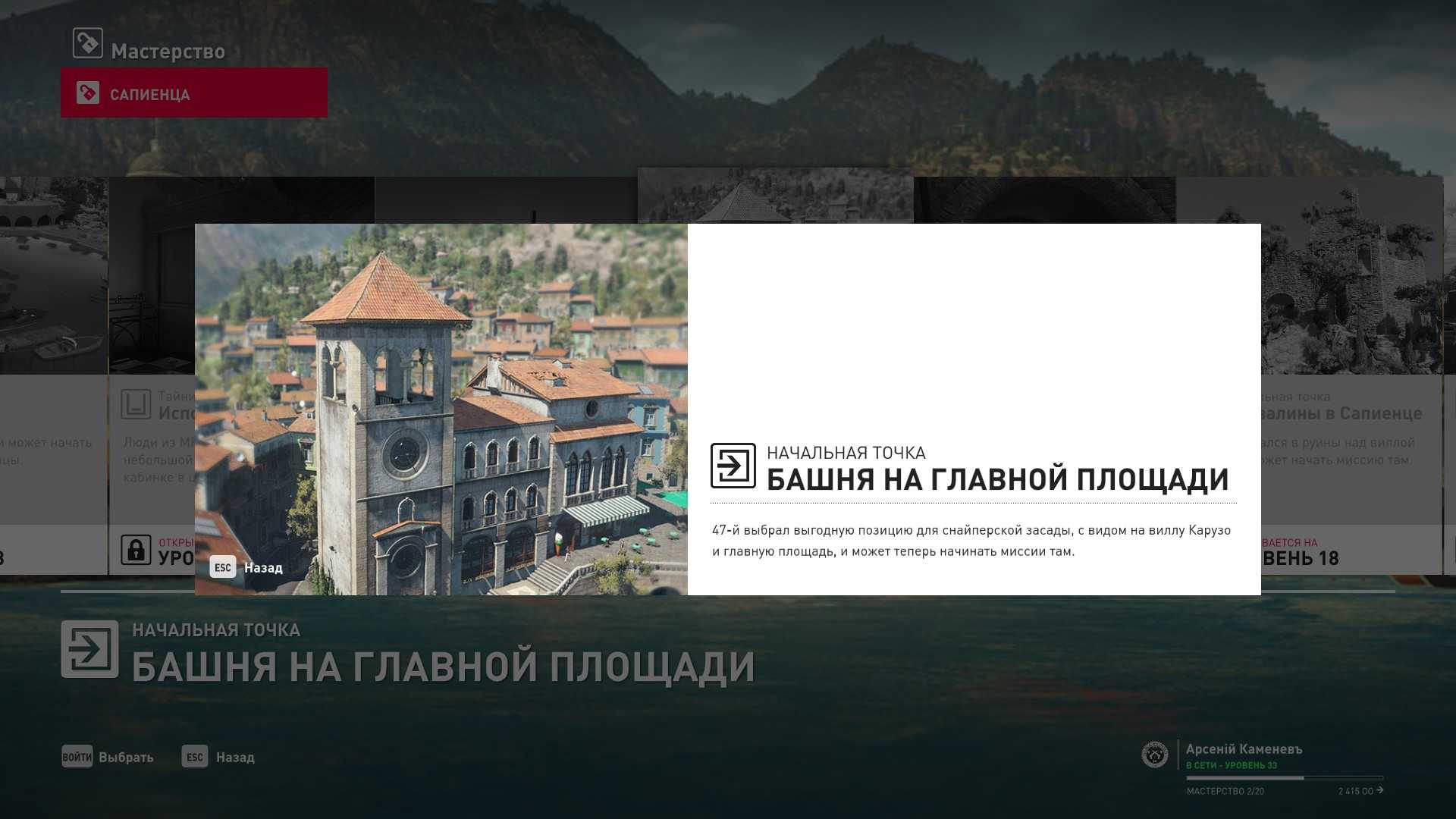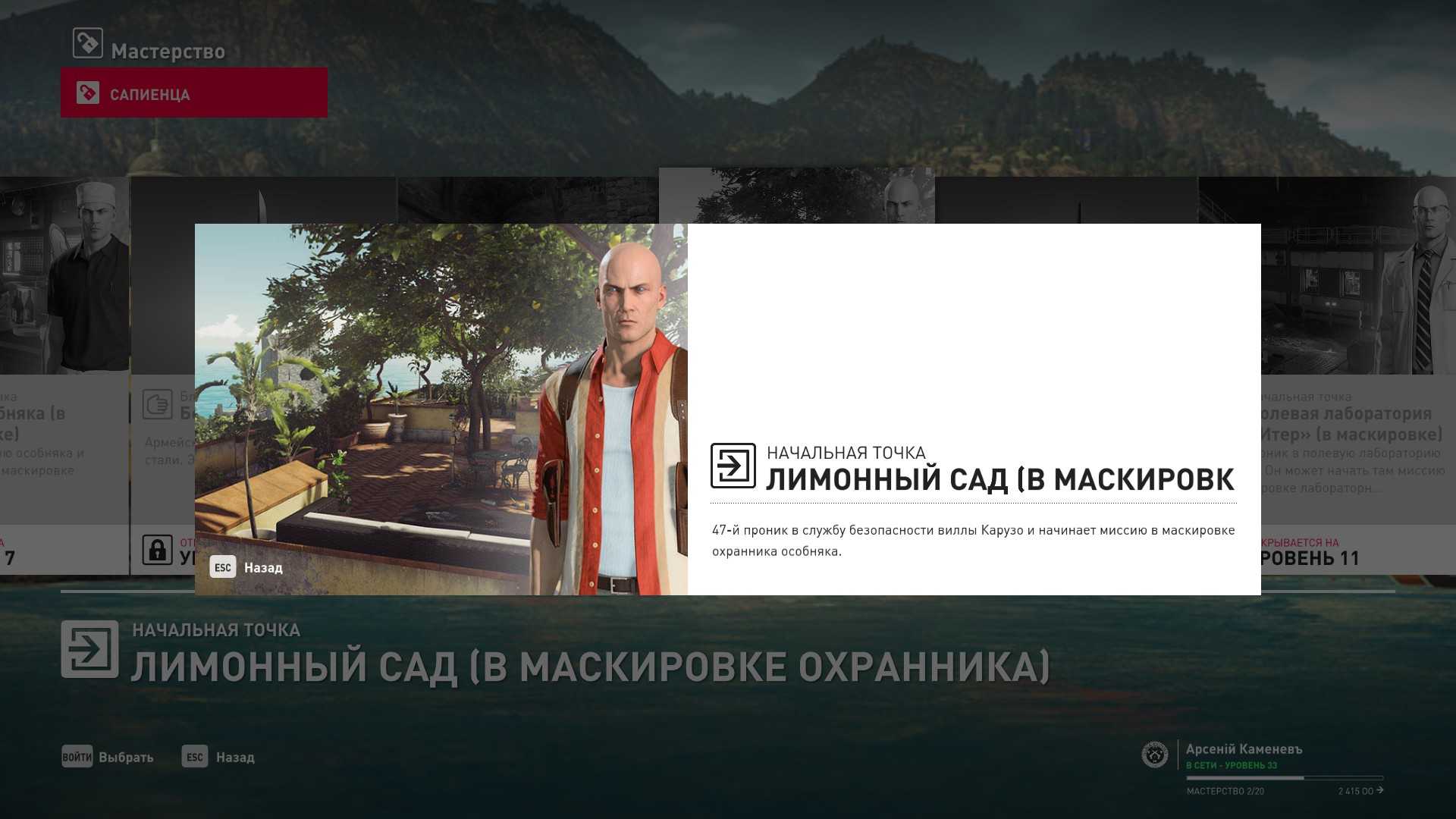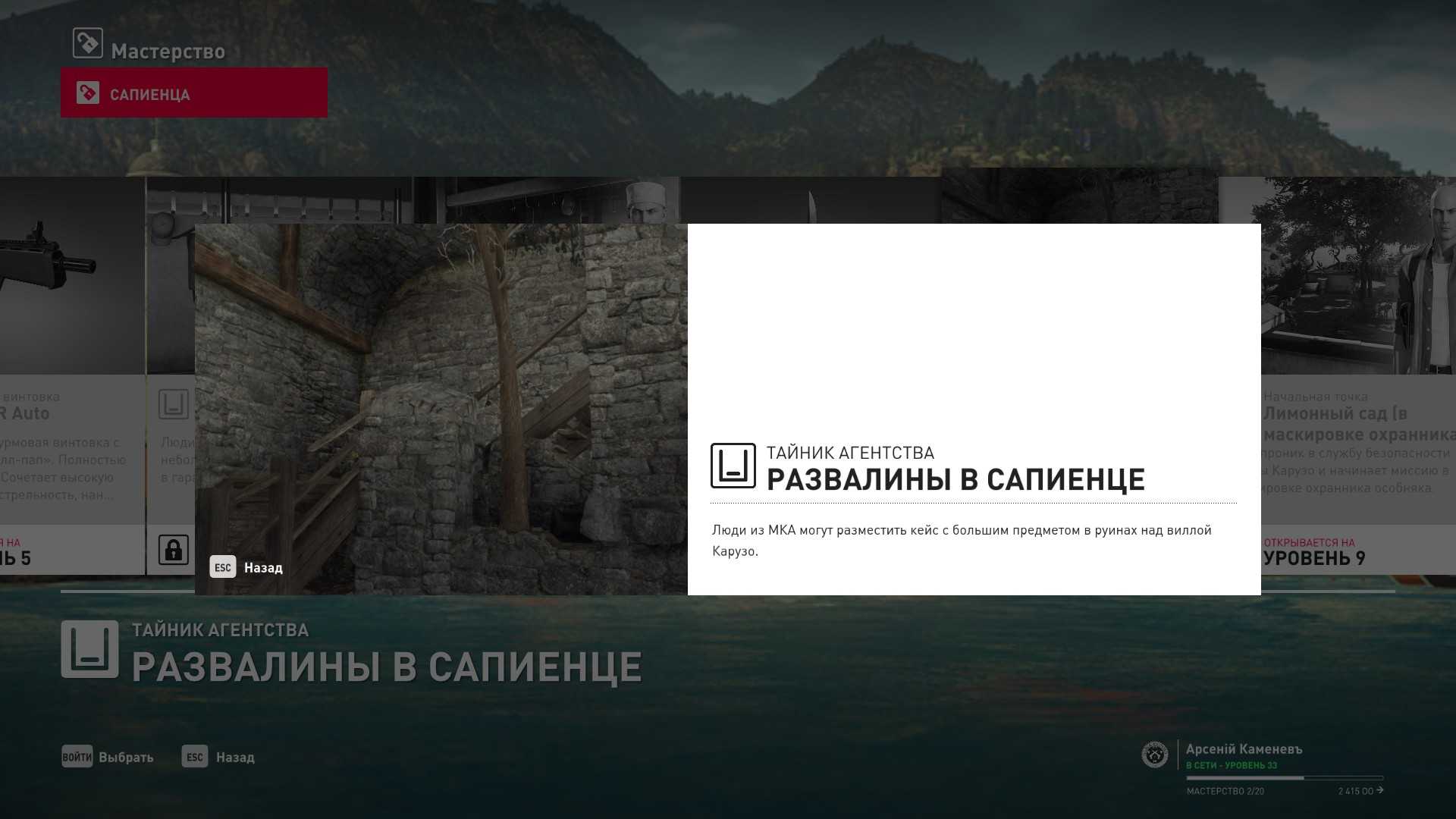 8 уровень мастерства: Тайник МКА в развалинах крепости в Сапиенце 9 уровень мастерства: Начальная точка в лимонном саду в маскировке охранника