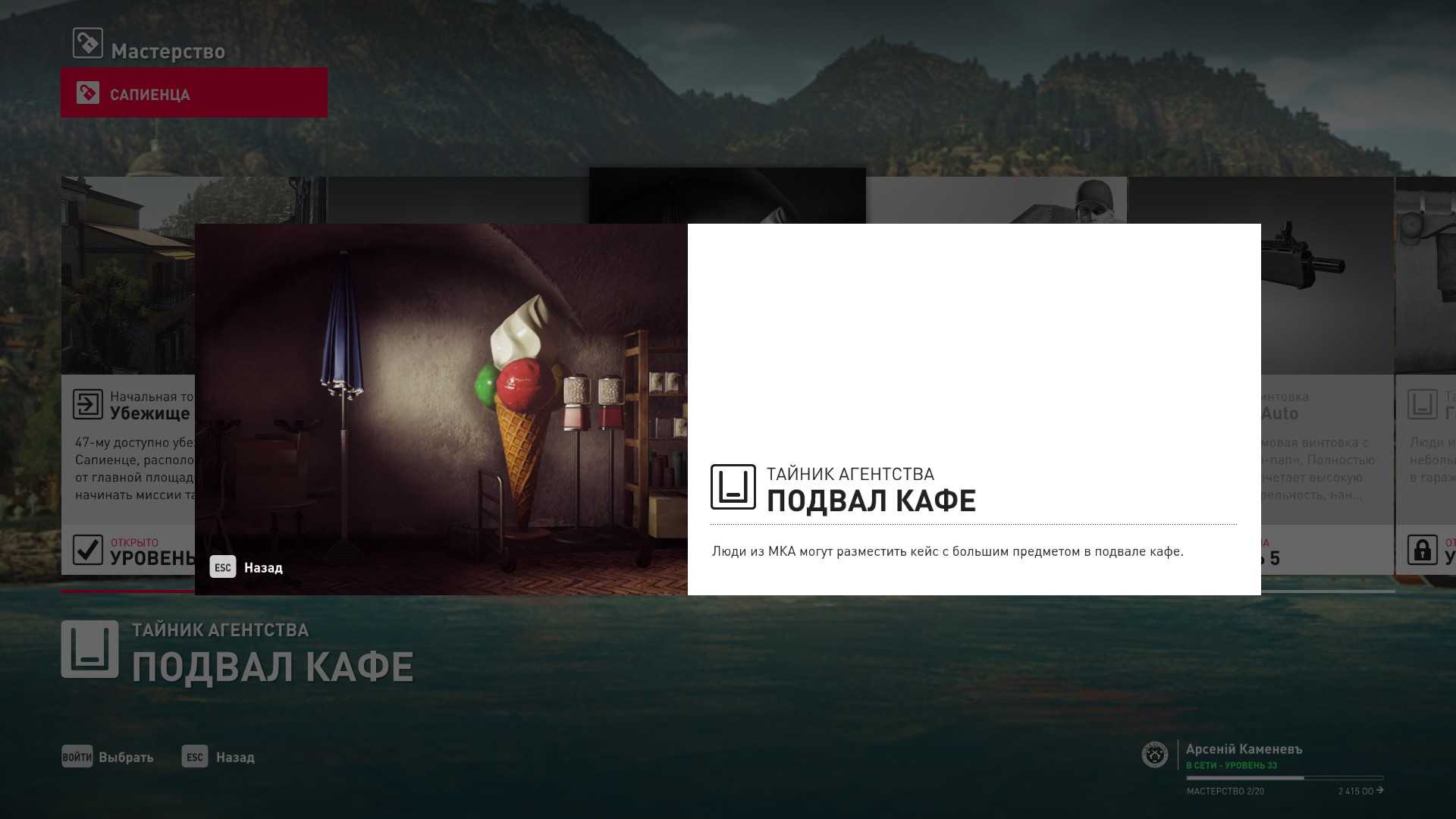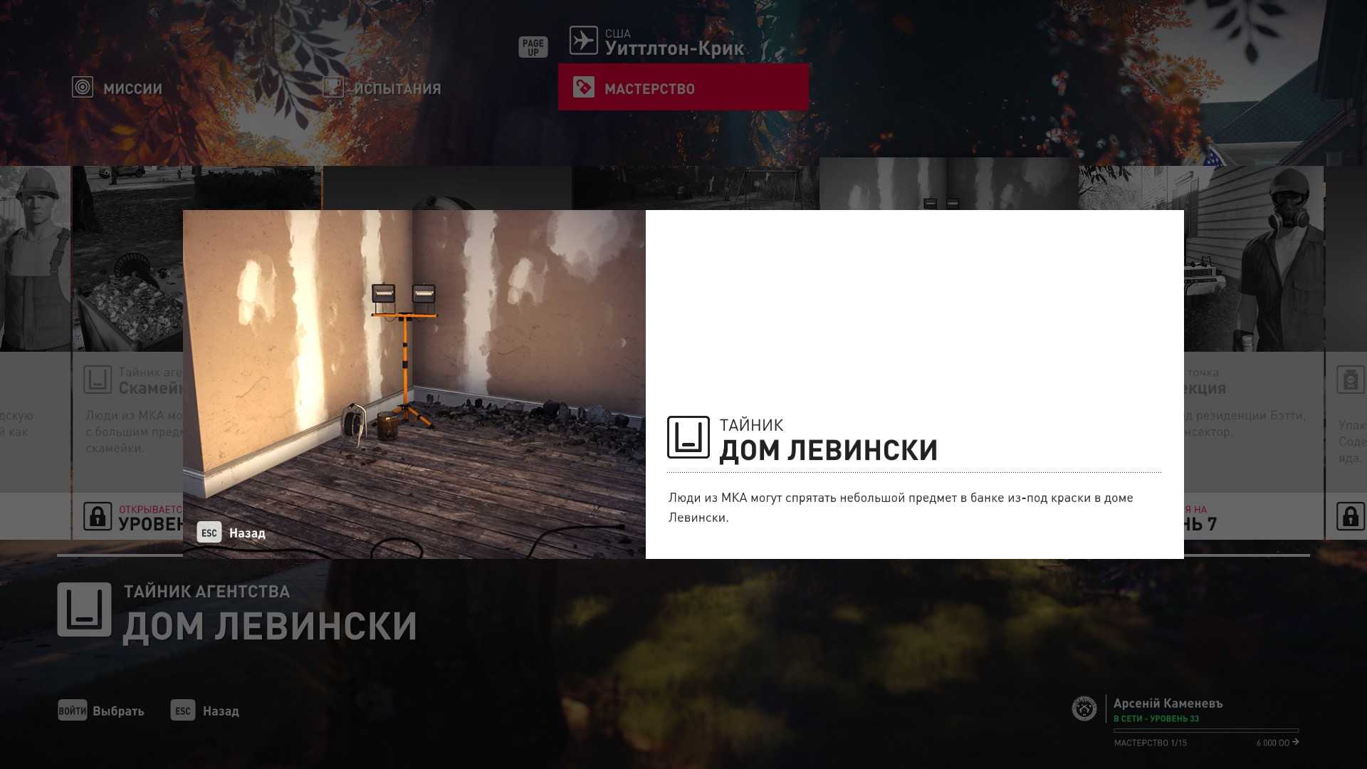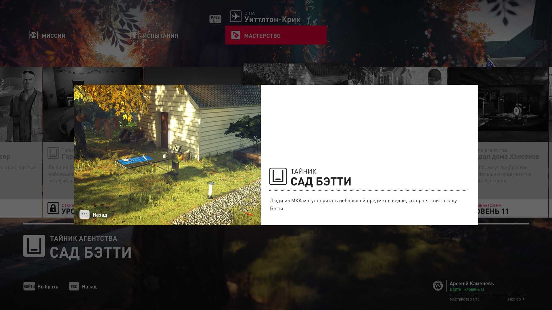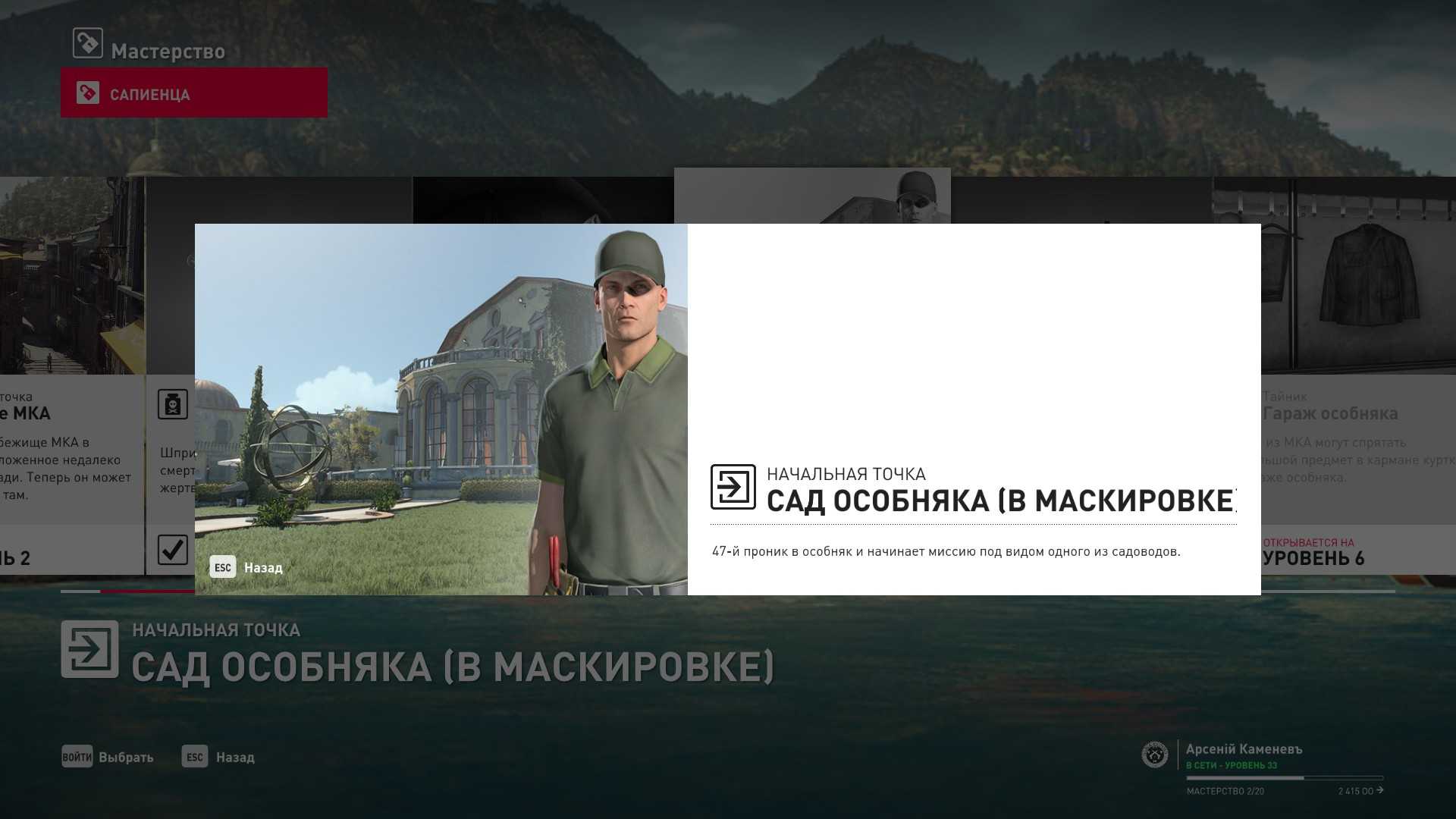 3 уровень мастерства: Тайник МКА в подвале кафе 4 уровень мастерства: Начальная точка в саду особняка в маскировке садовода