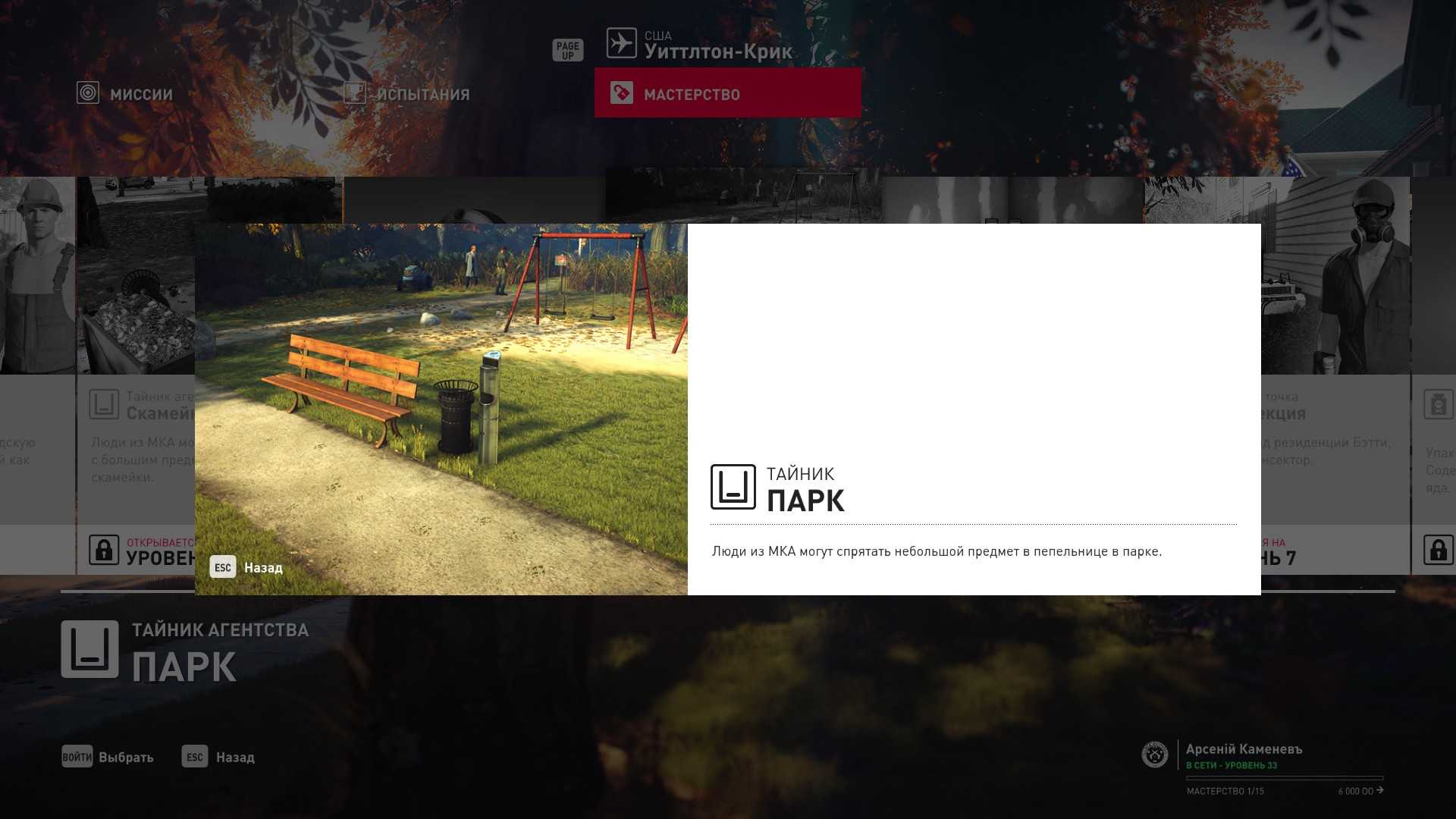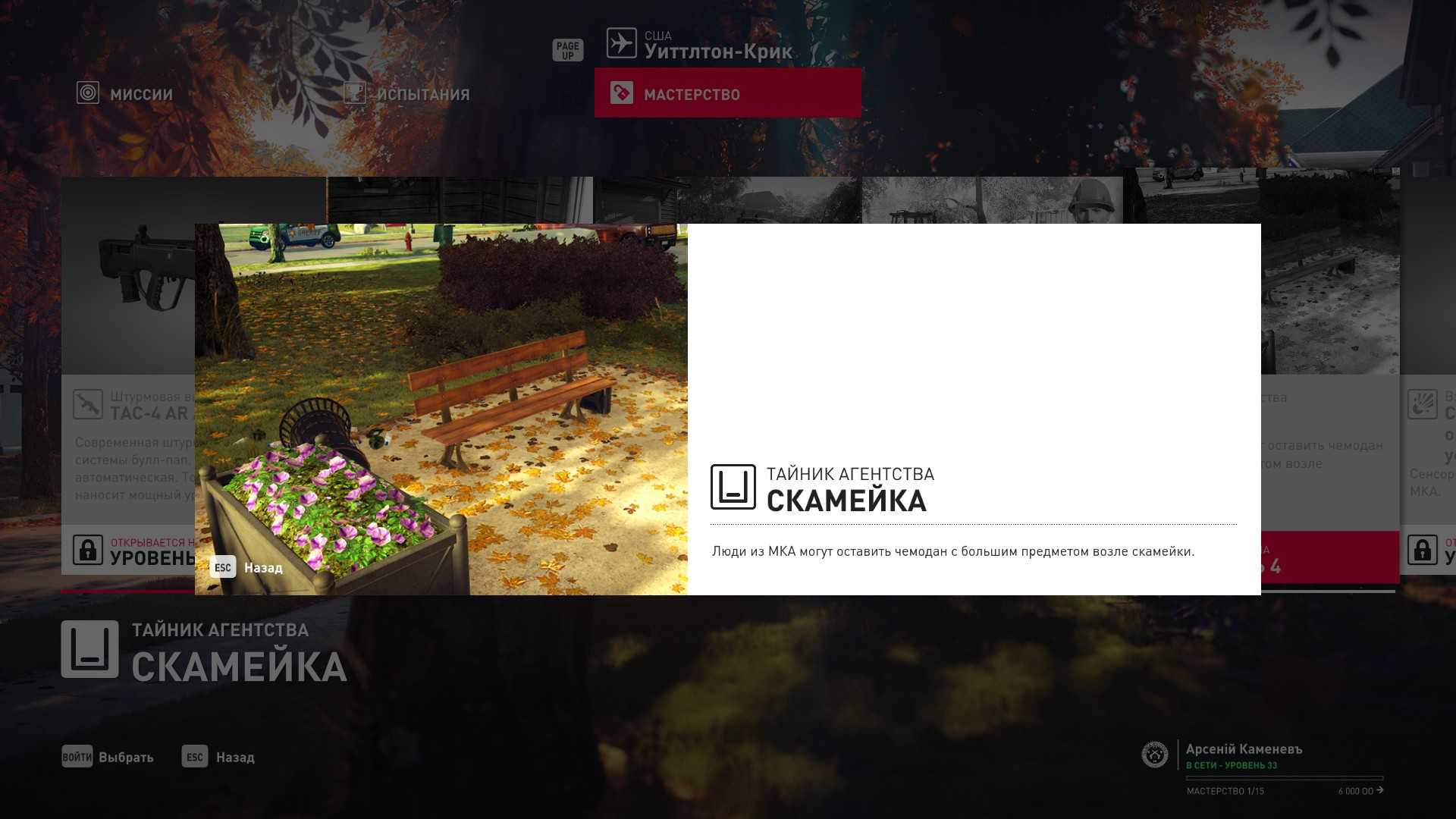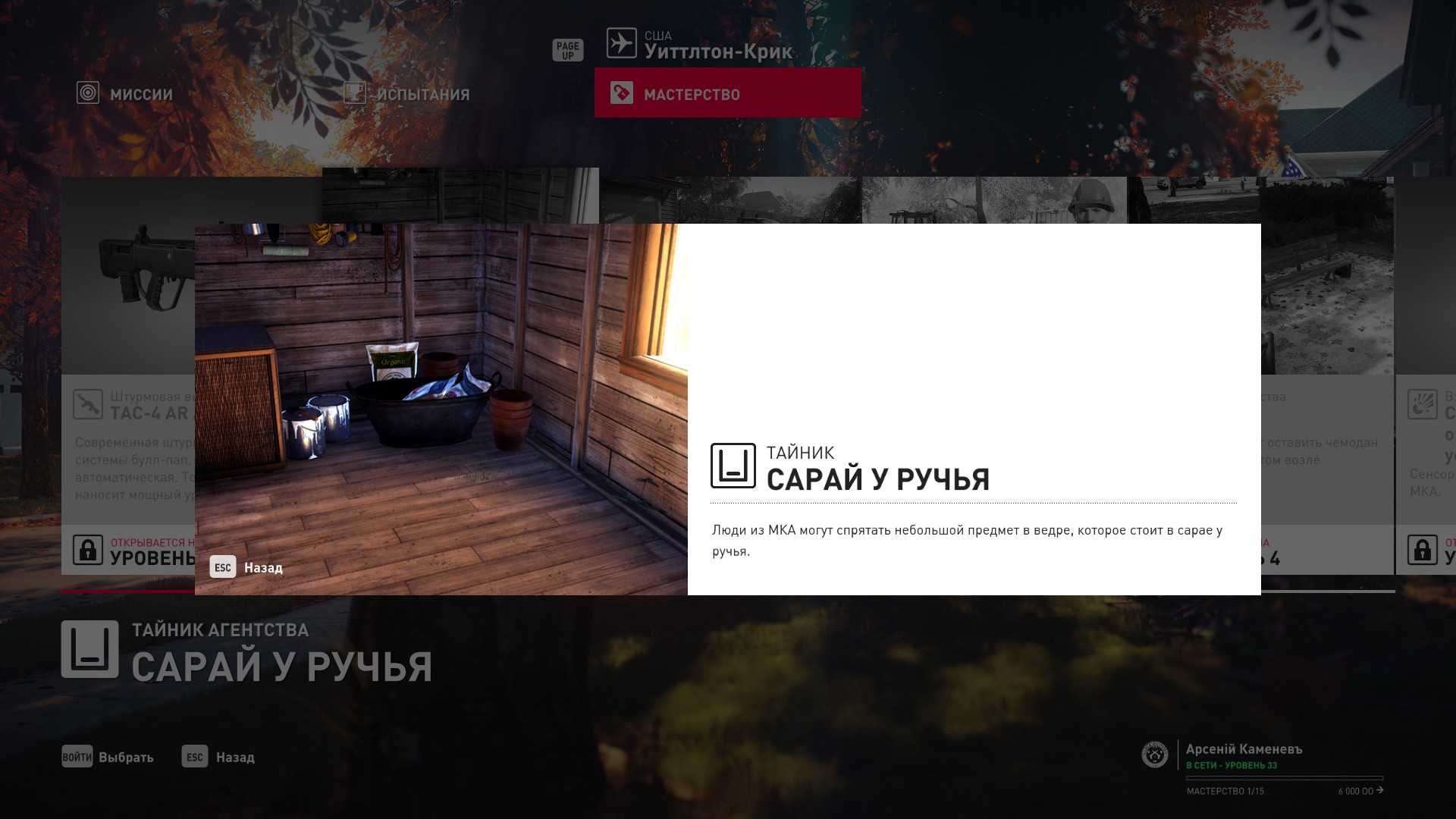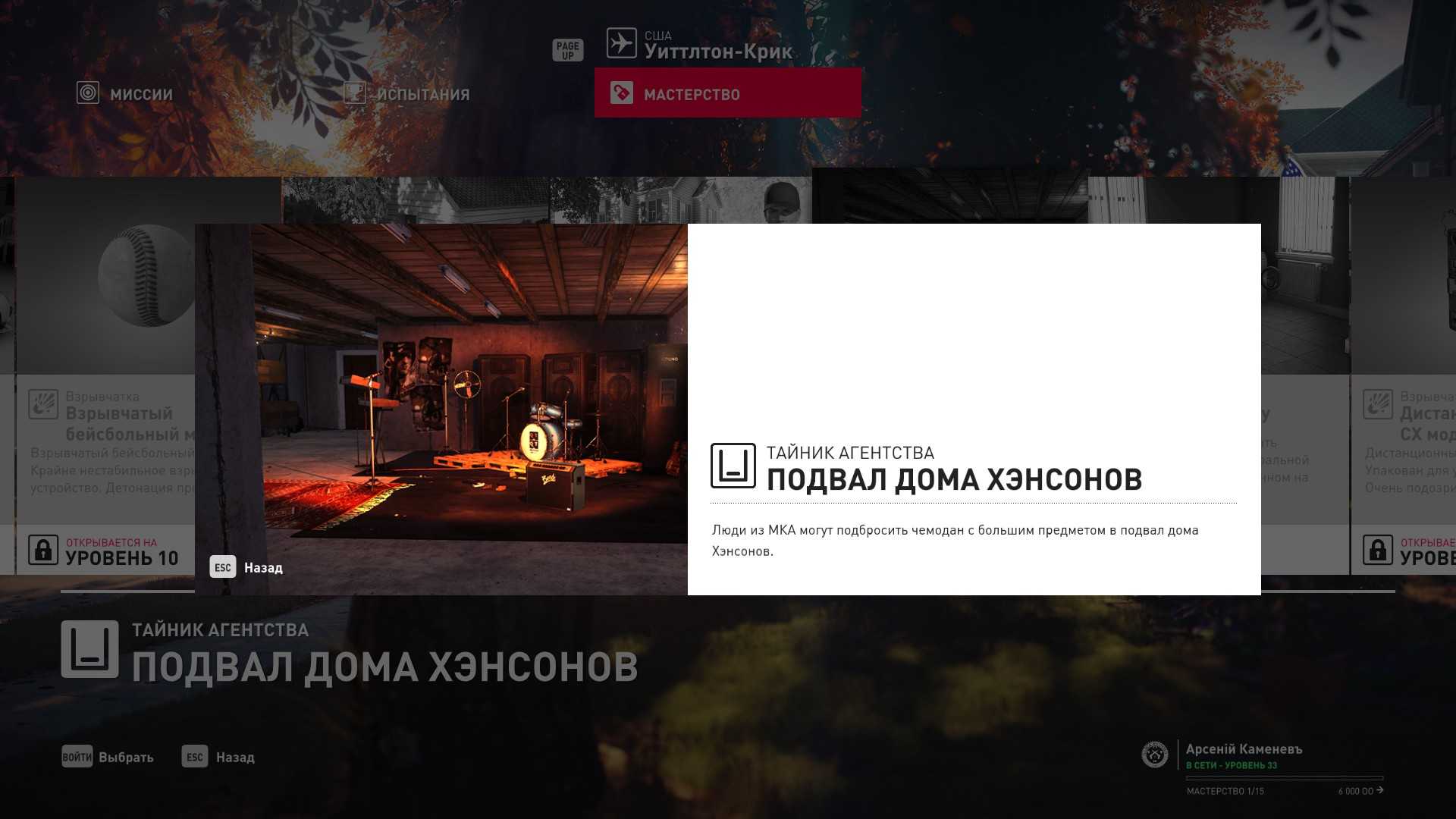 3 уровень мастерства: Тайник МКА в подвале кафе 4 уровень мастерства: Начальная точка в саду особняка в маскировке садовода