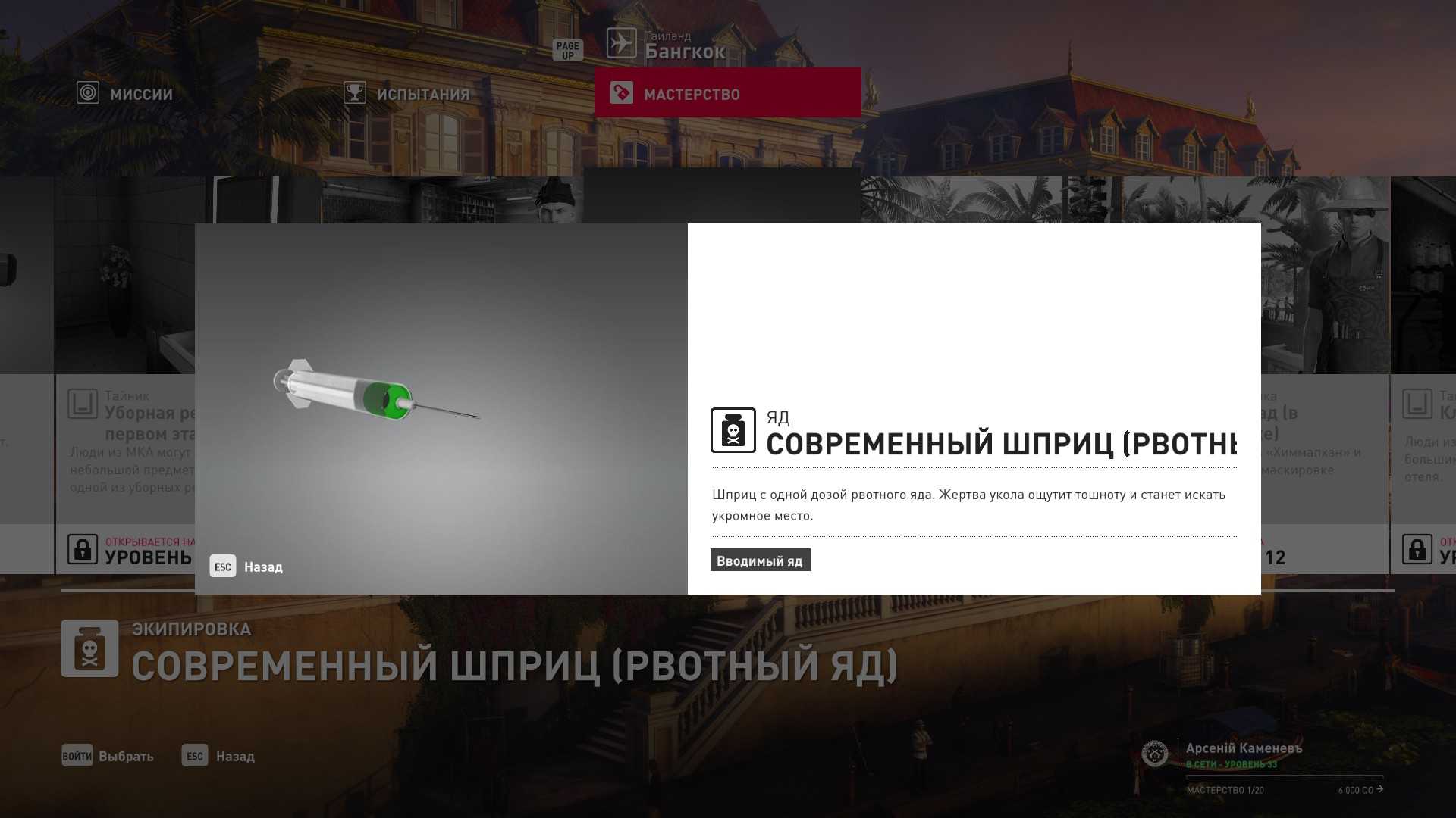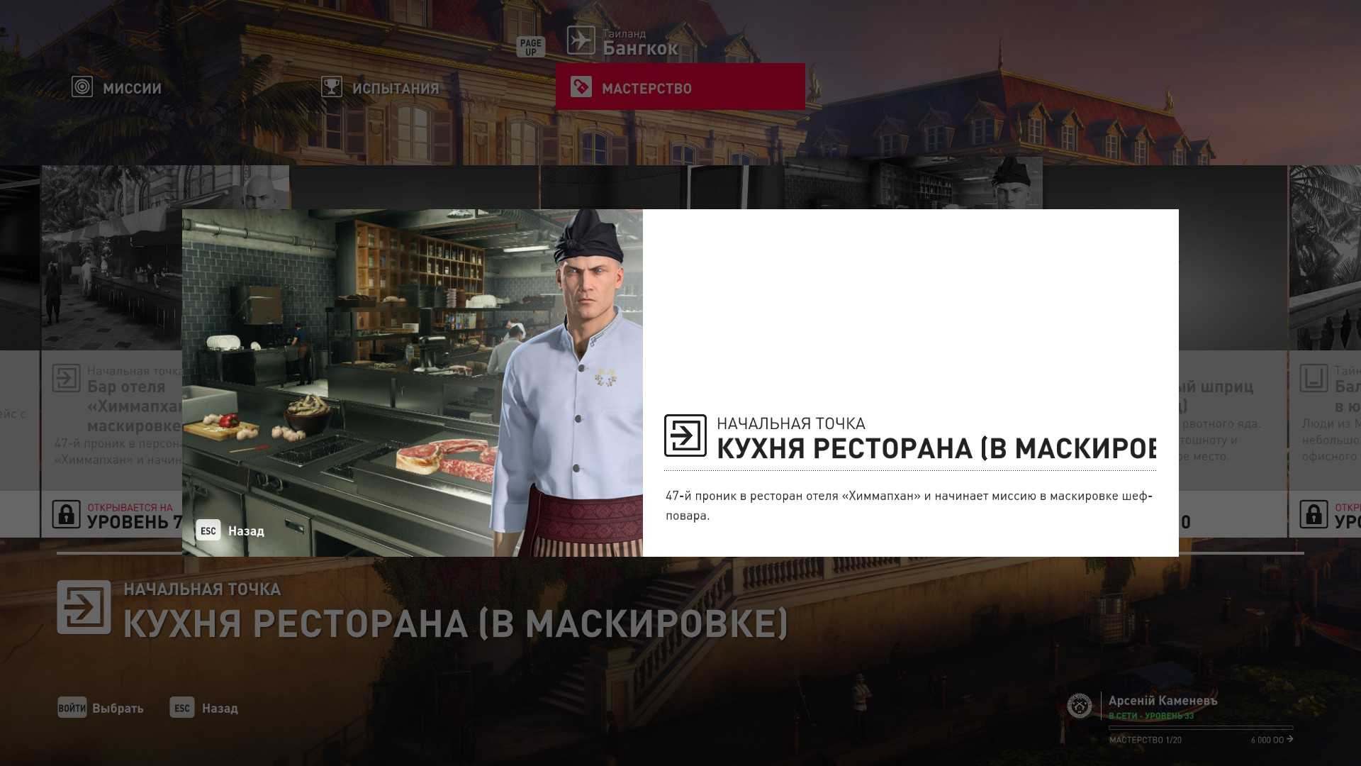 9 уровень мастерства: Начальная точка на кухне ресторана отеля “Химмапхан” в маскировке шеф-повара 10 уровень мастерства: Шприц с рвотным ядом