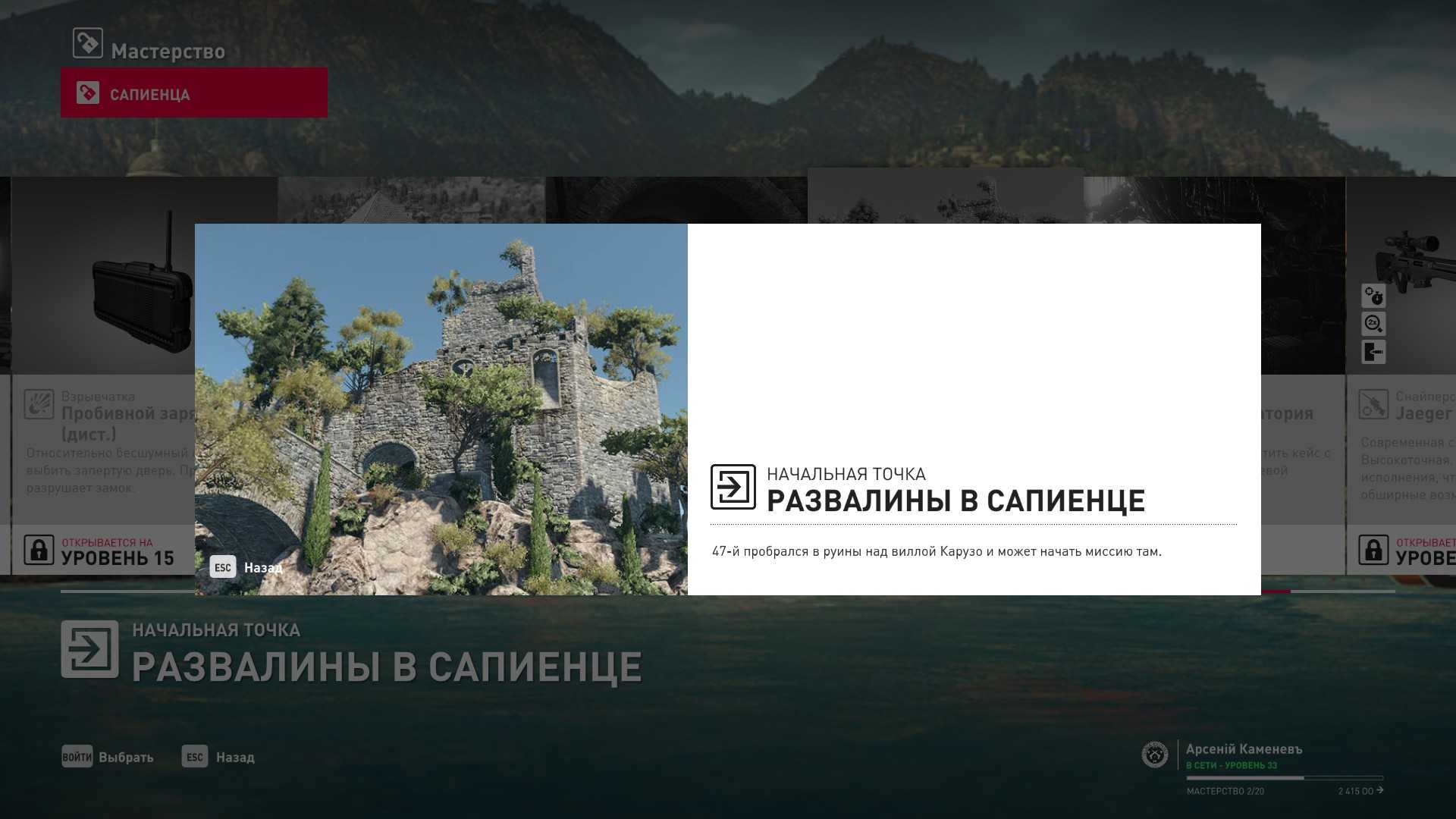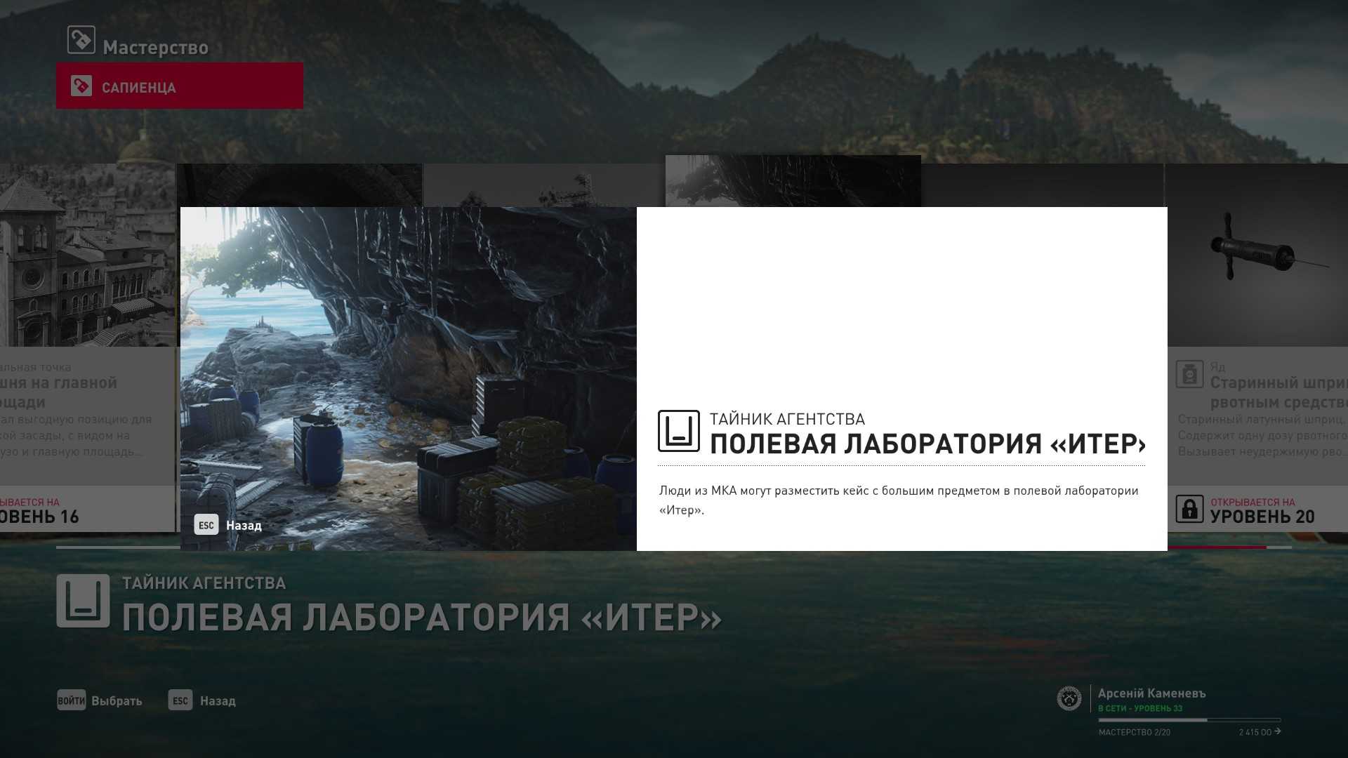 18 уровень мастерства: Начальная точка в развалинах крепости в Сапиенце 19 уровень мастерства: Тайник МКА в полевой лаборатории “Итер”