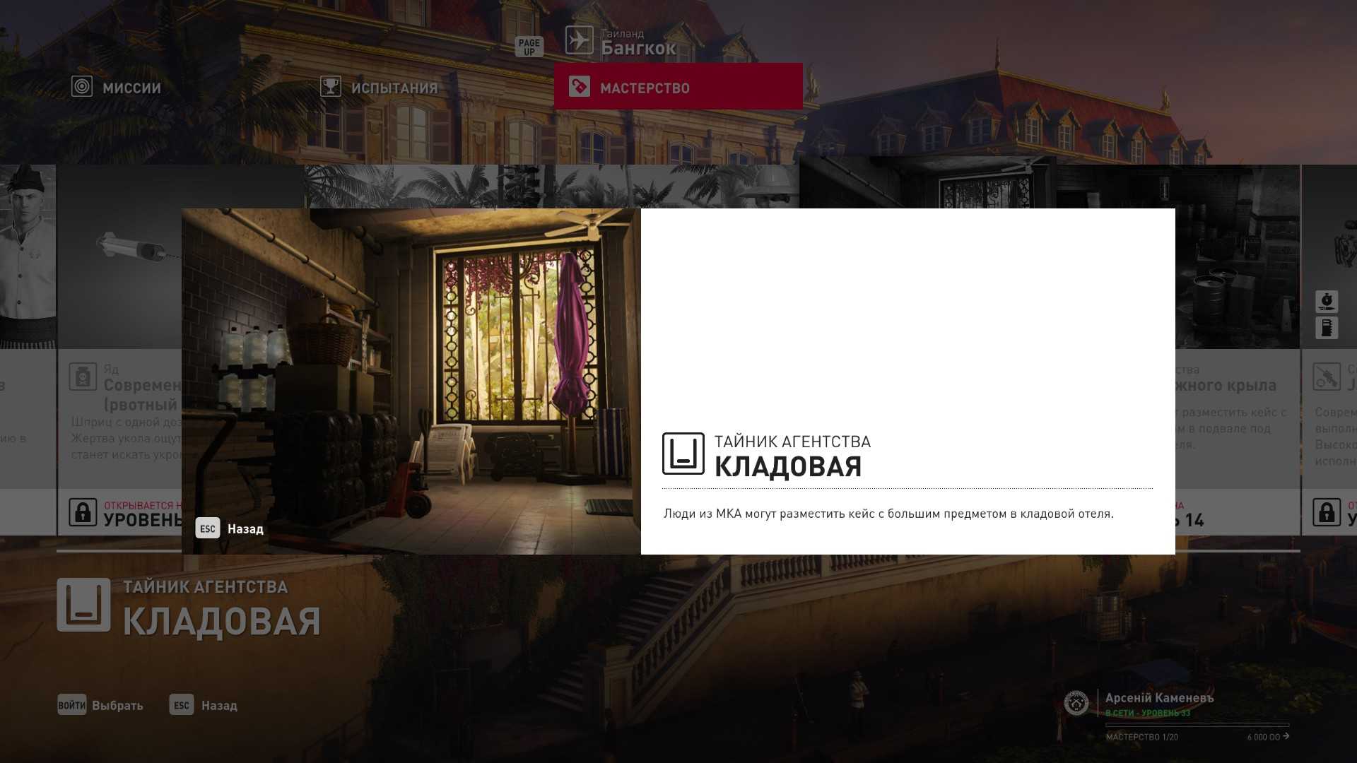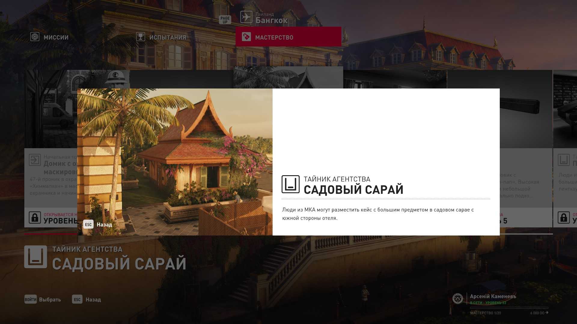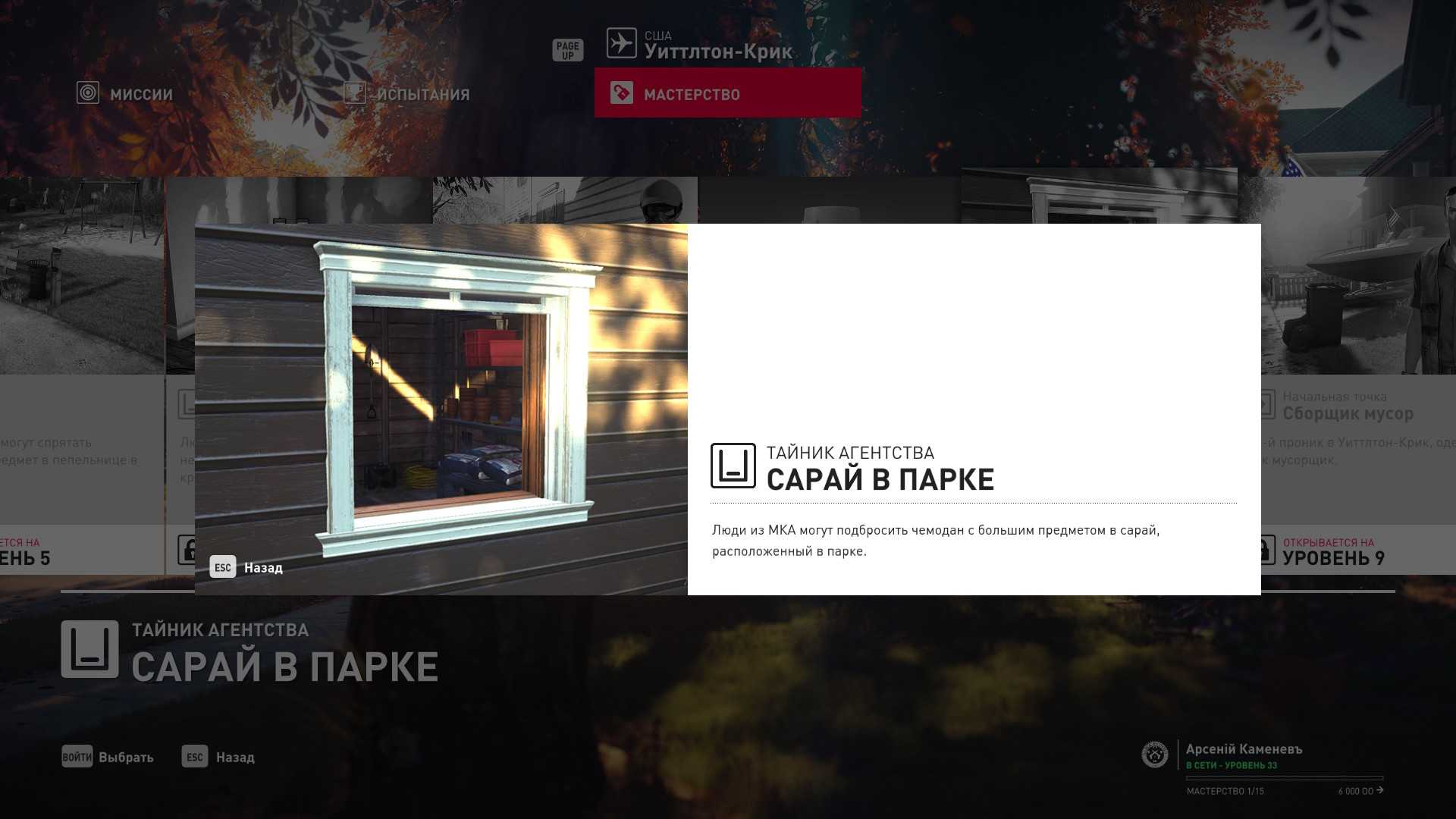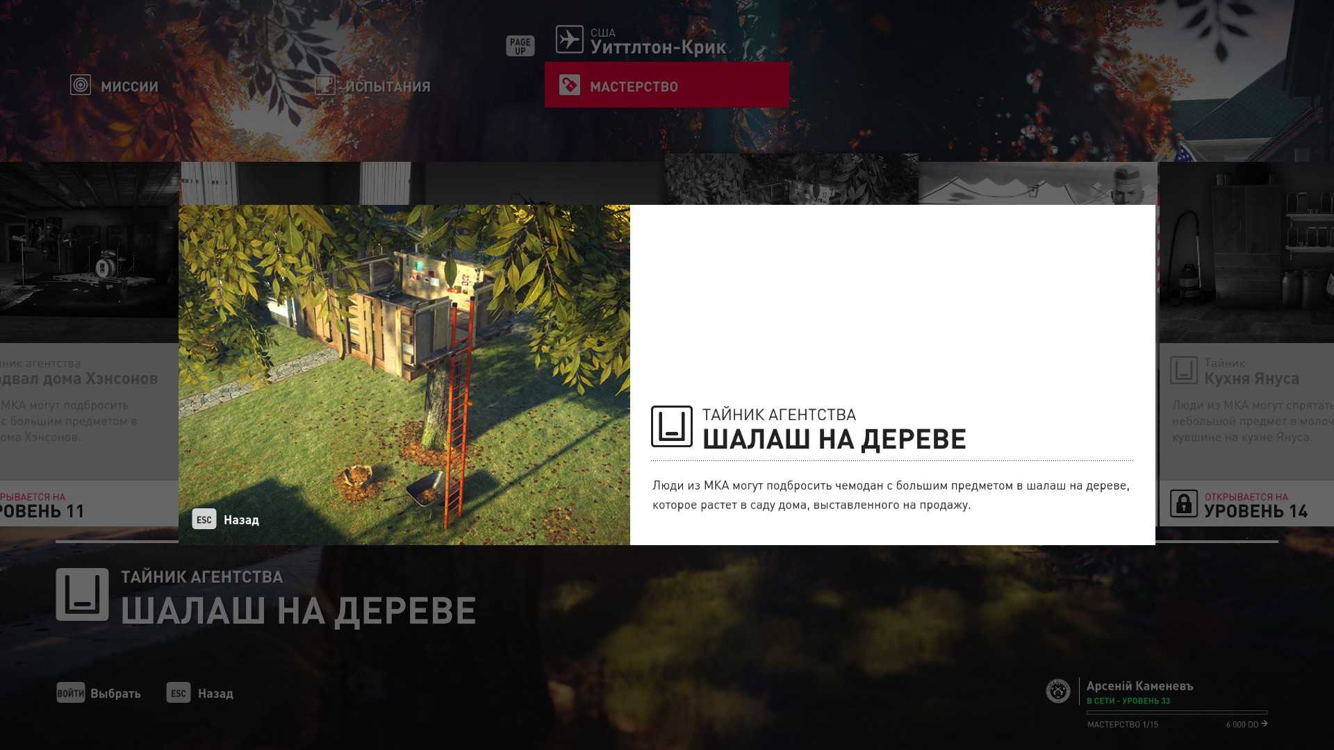 3 уровень мастерства: Тайник МКА в садовом сарае 4 уровень мастерства: Начальная точка в номере Агента 47