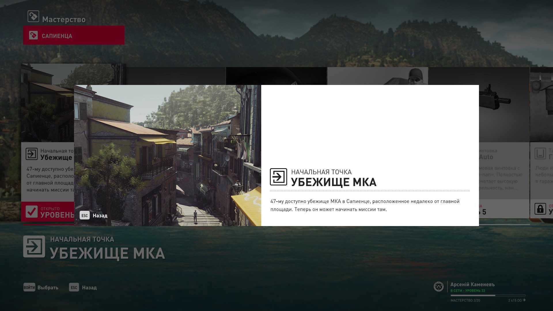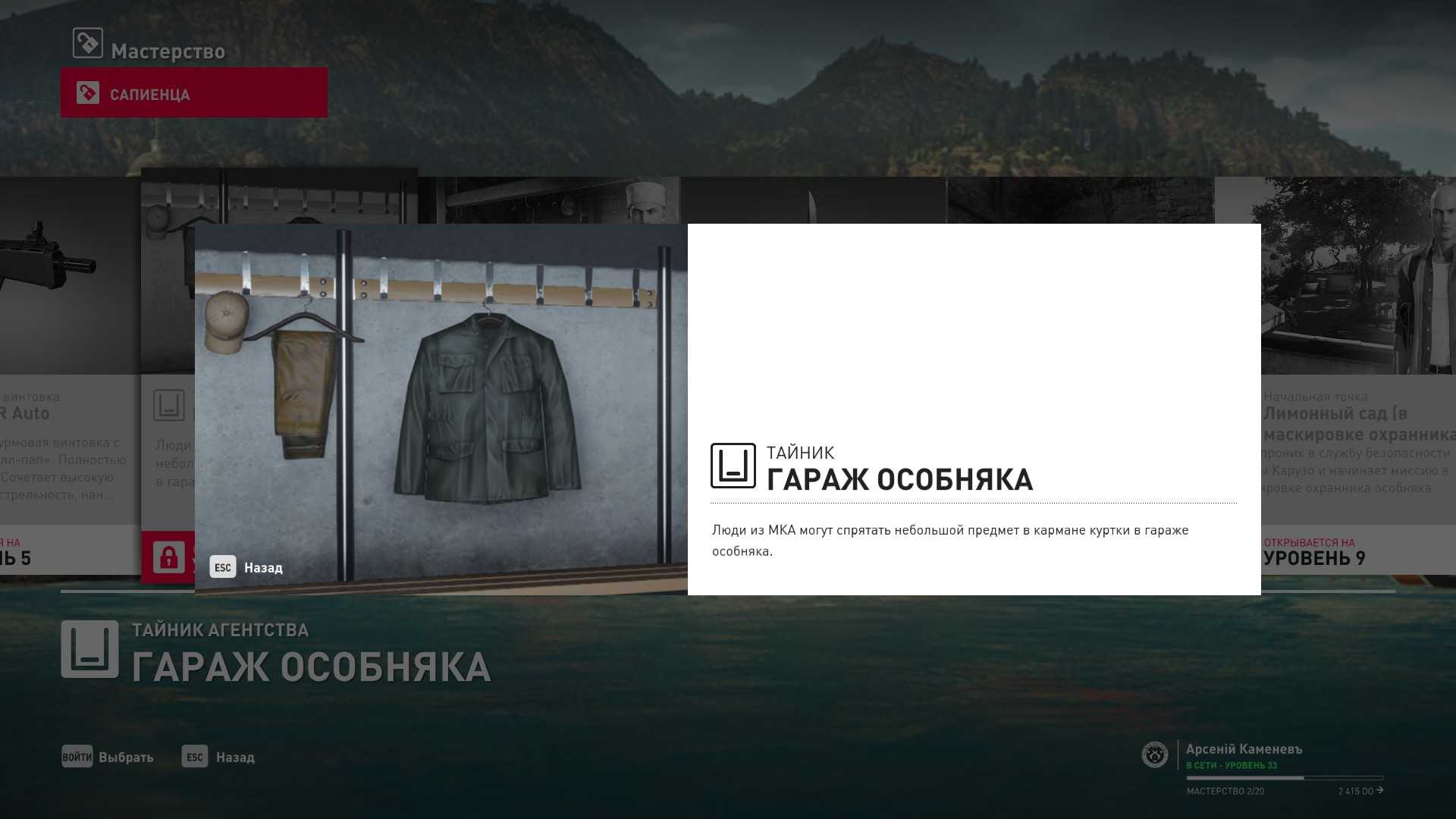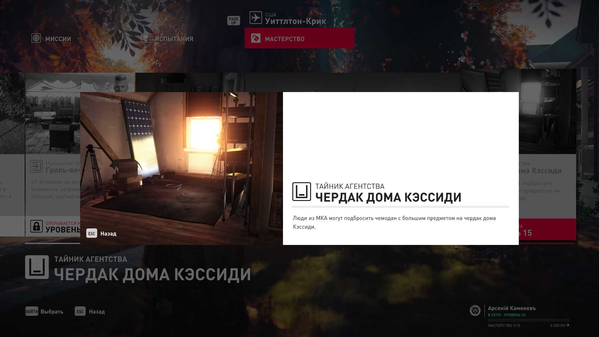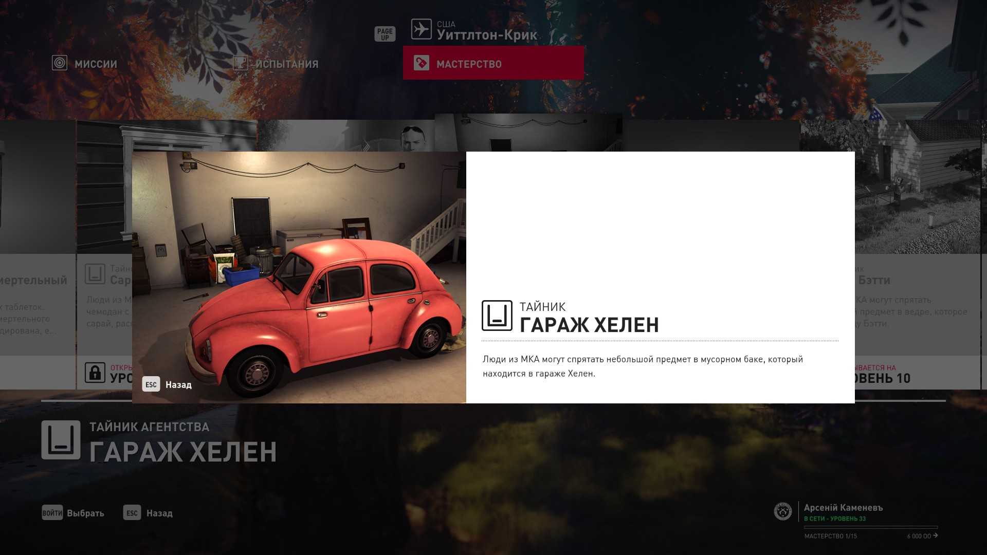 3 уровень мастерства: Тайник МКА в садовом сарае 4 уровень мастерства: Начальная точка в номере Агента 47