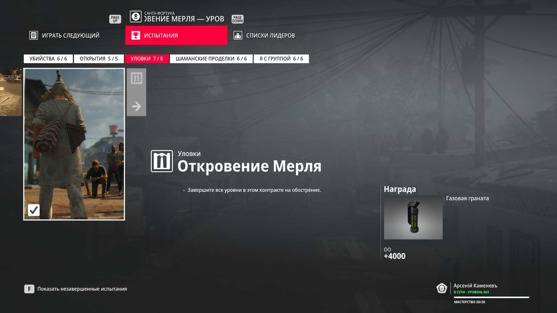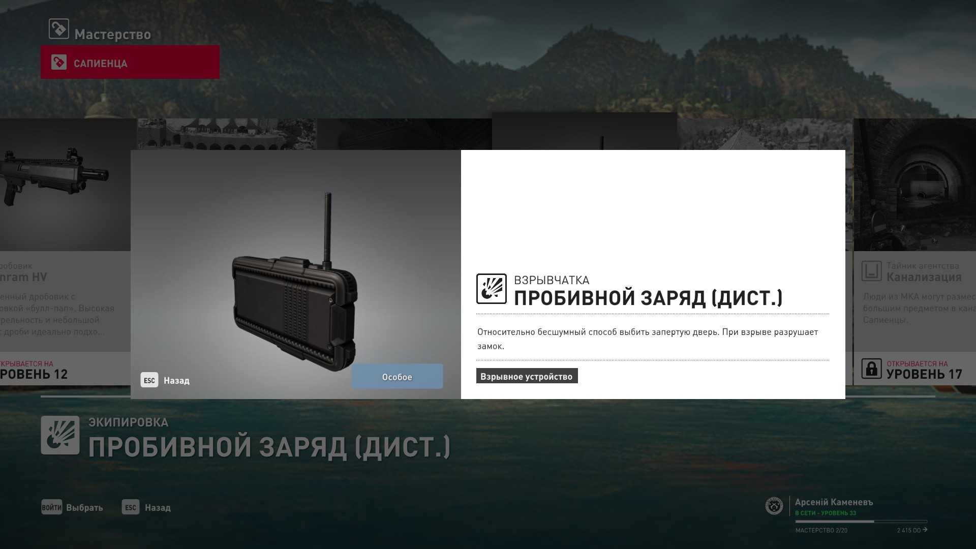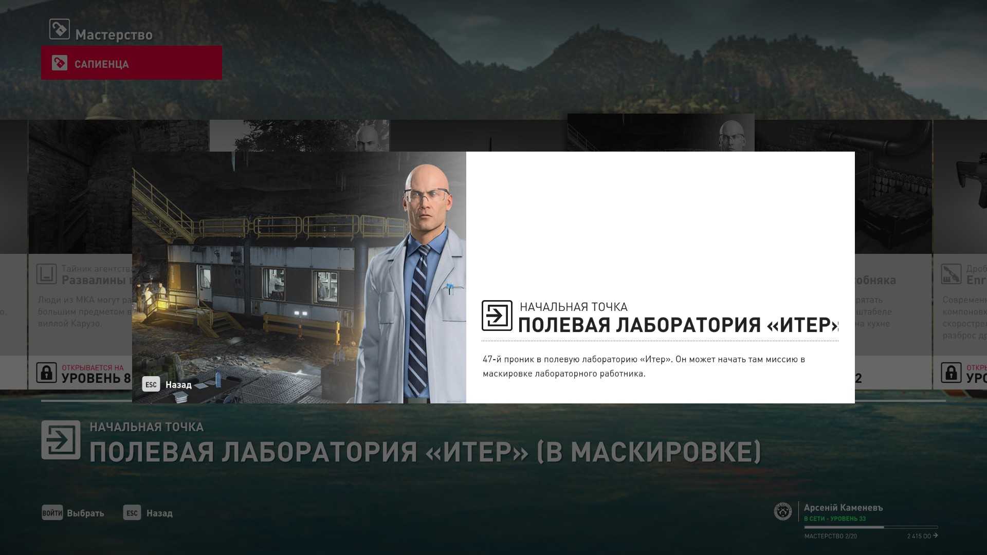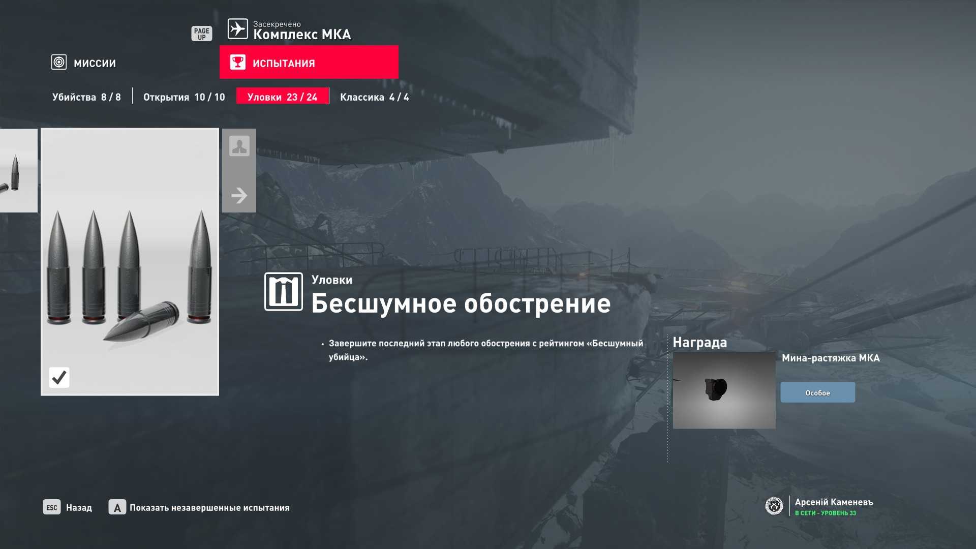 11 уровень мастерства: Начальная точка в лаборатории “Итер” в маскировке лабораторного работника 12 уровень мастерства: Тайник МКА в кладовой особняка и дробовик Enram HV