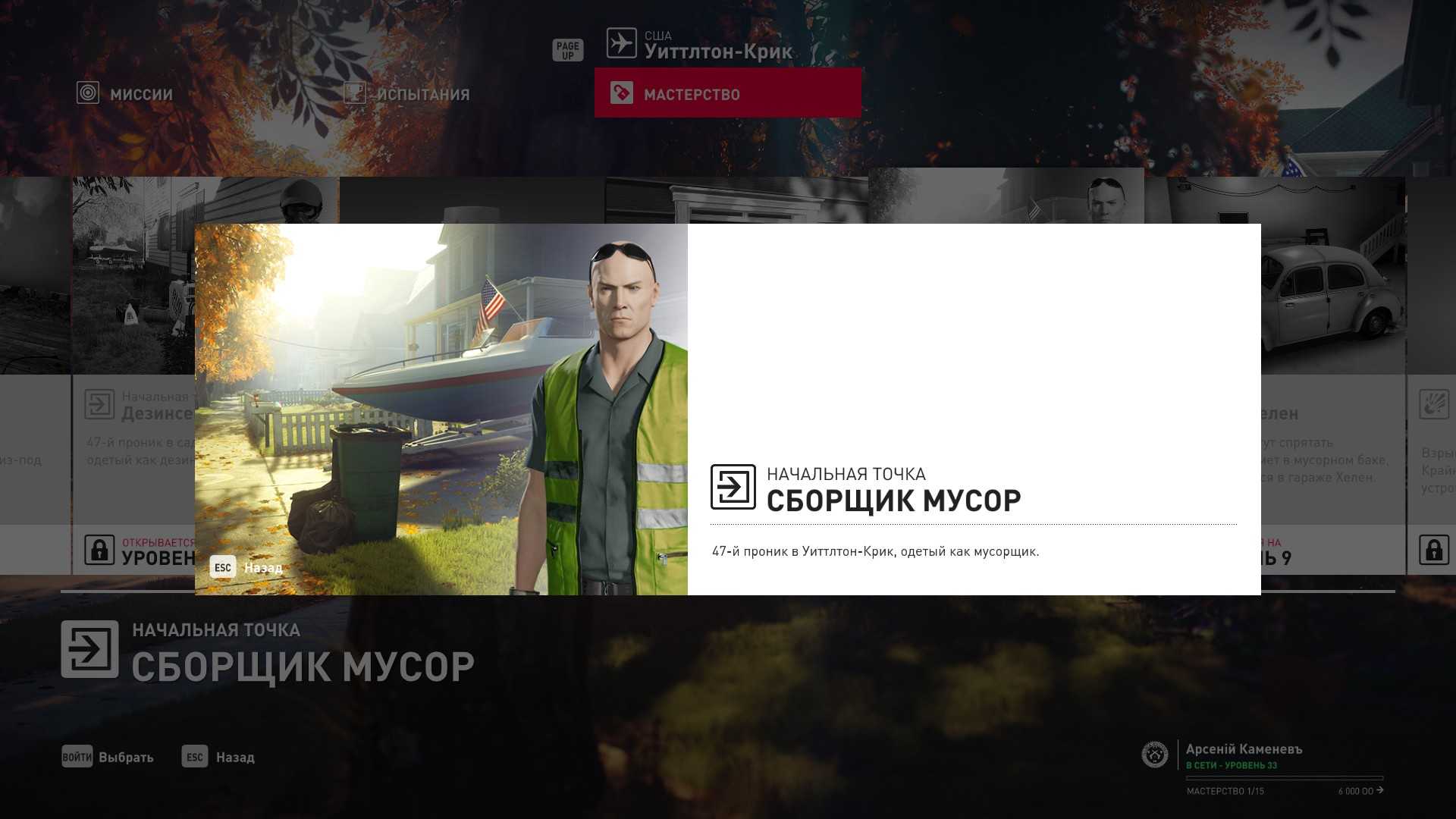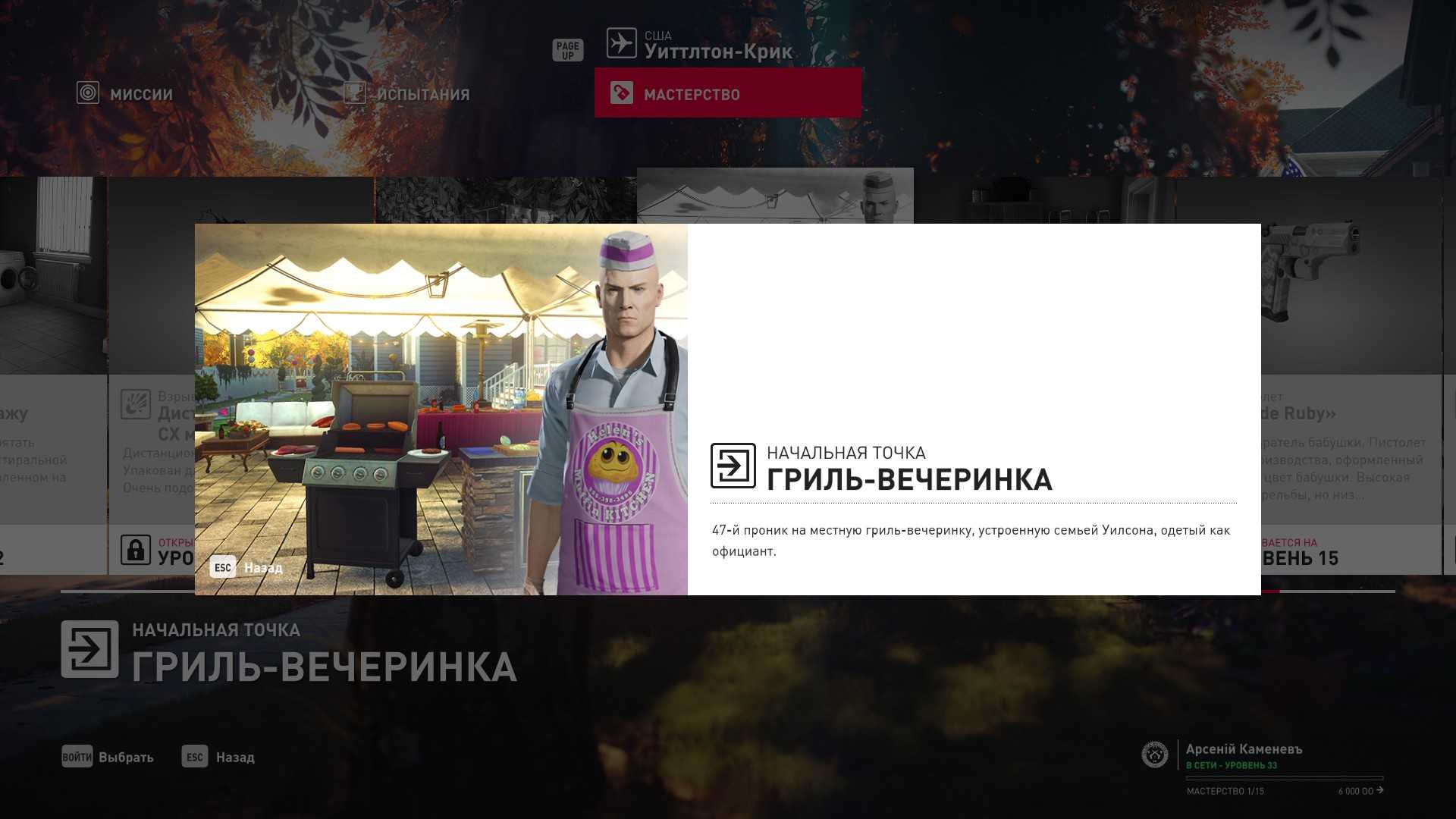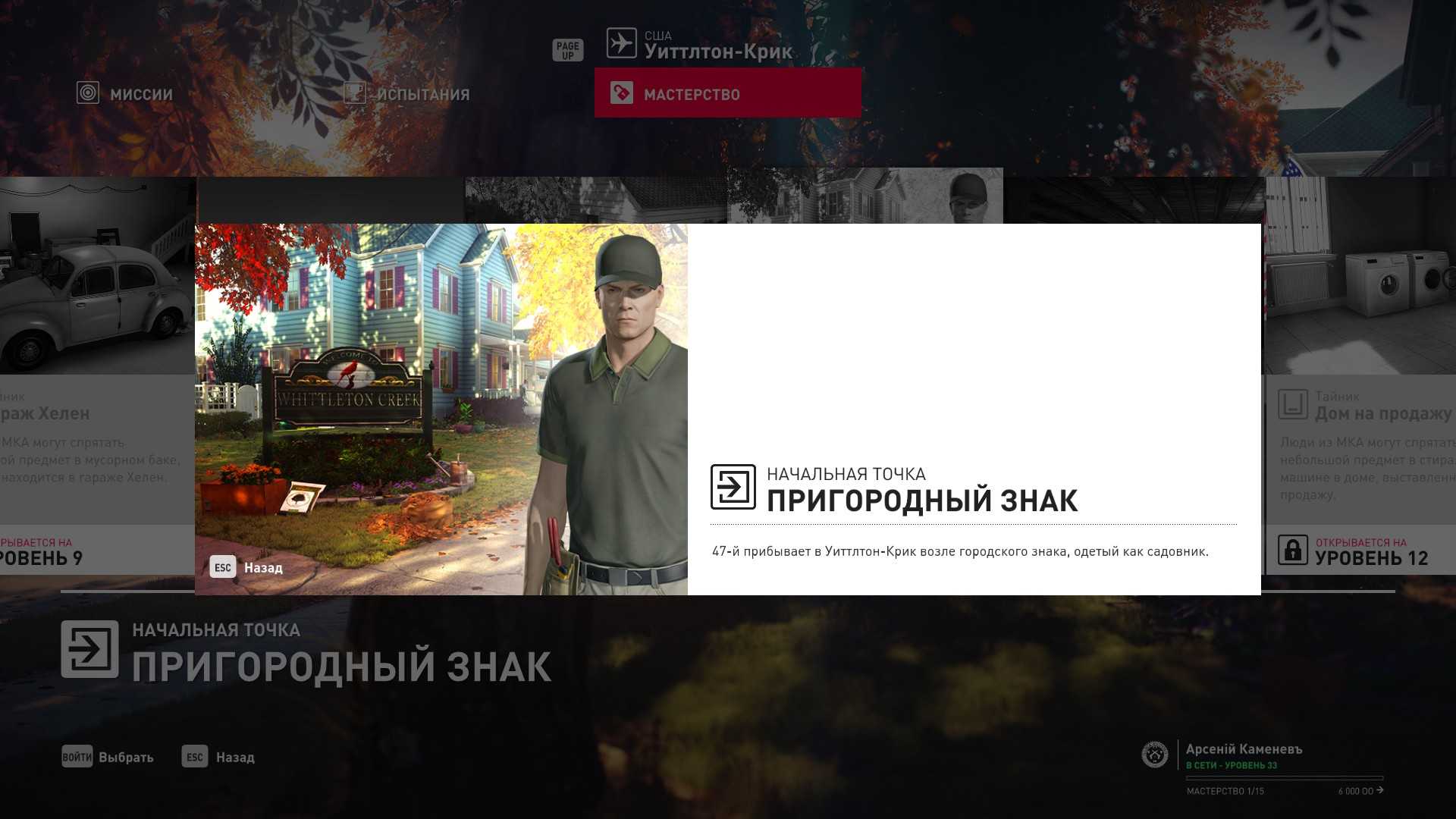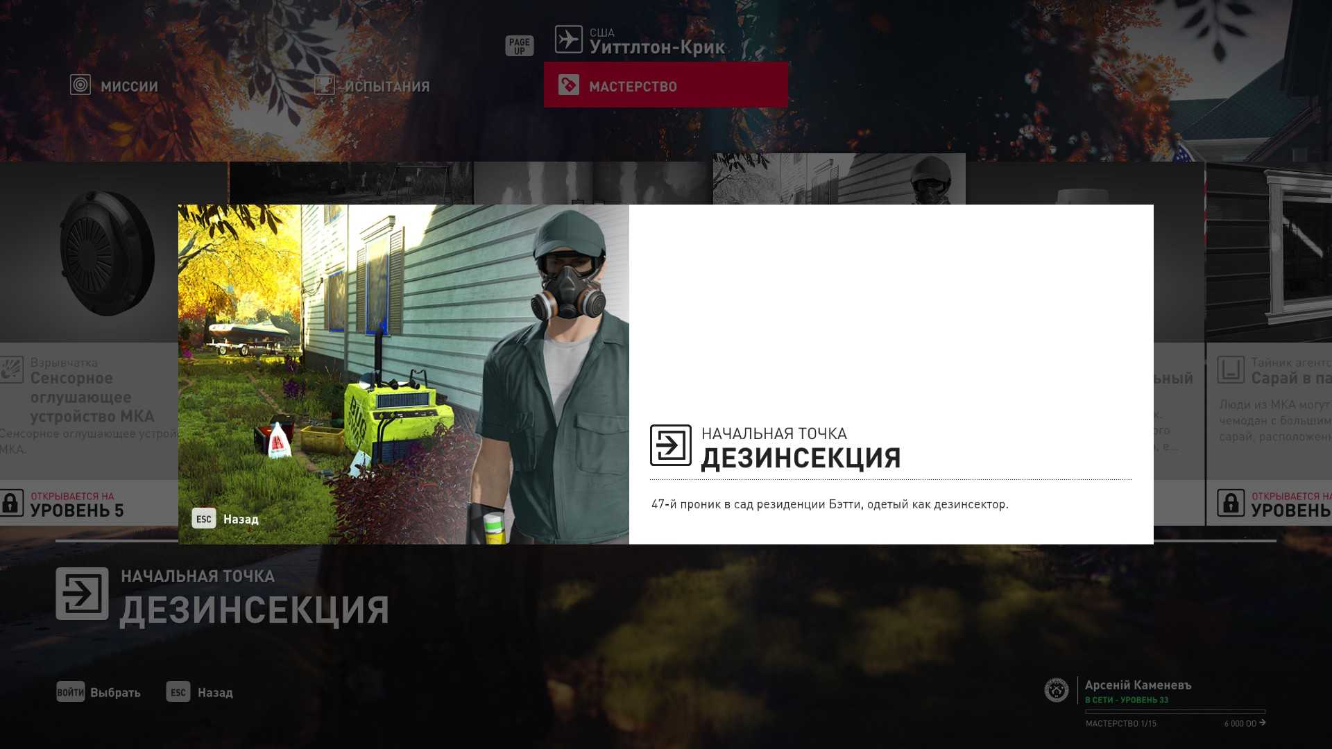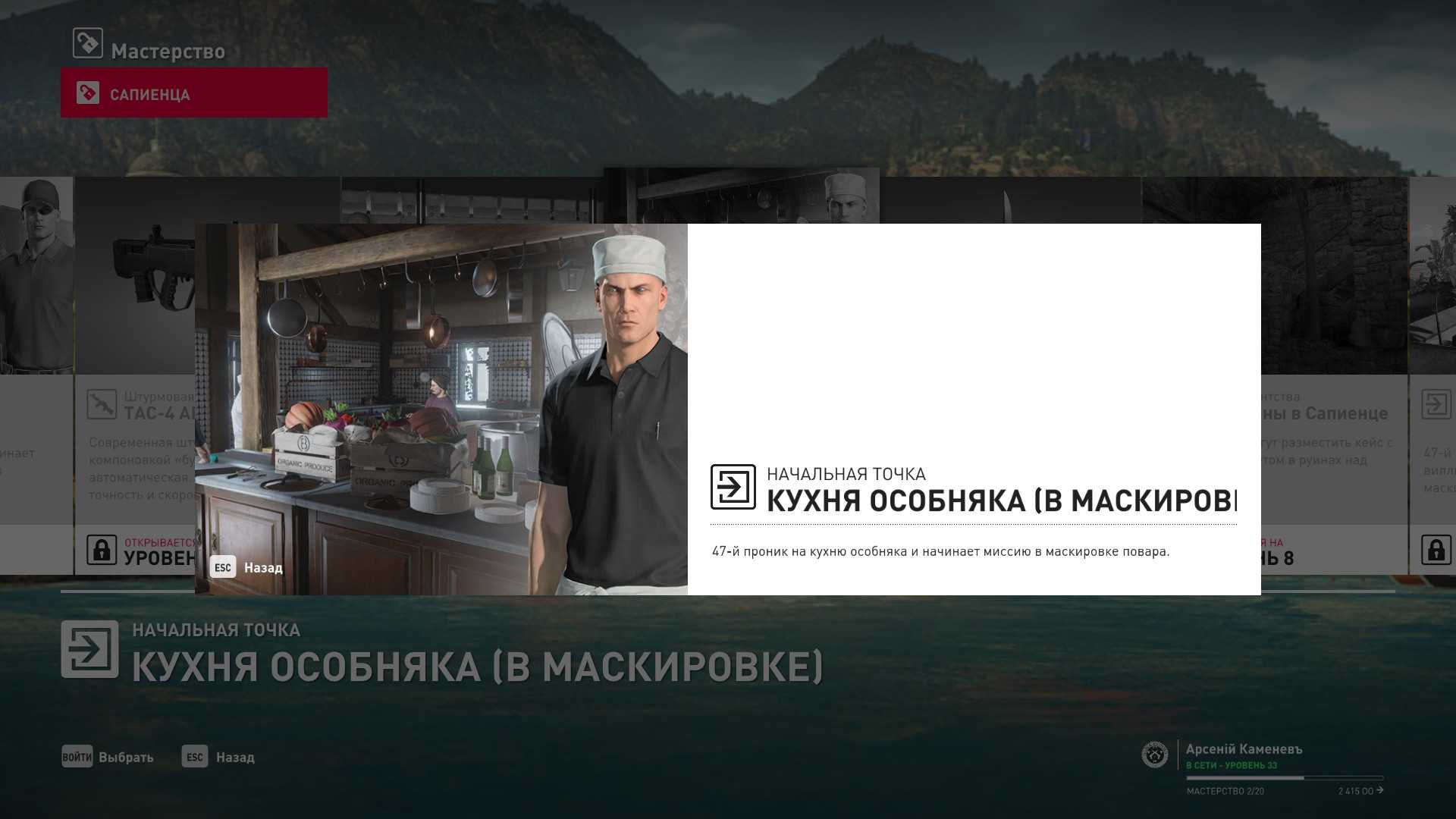 6 уровень мастерства: Тайник МКА в гараже особняка 7 уровень мастерства: Начальная точка на кухне в маскировке повара и боевой нож