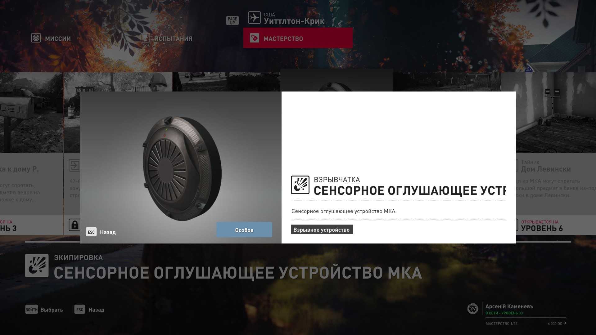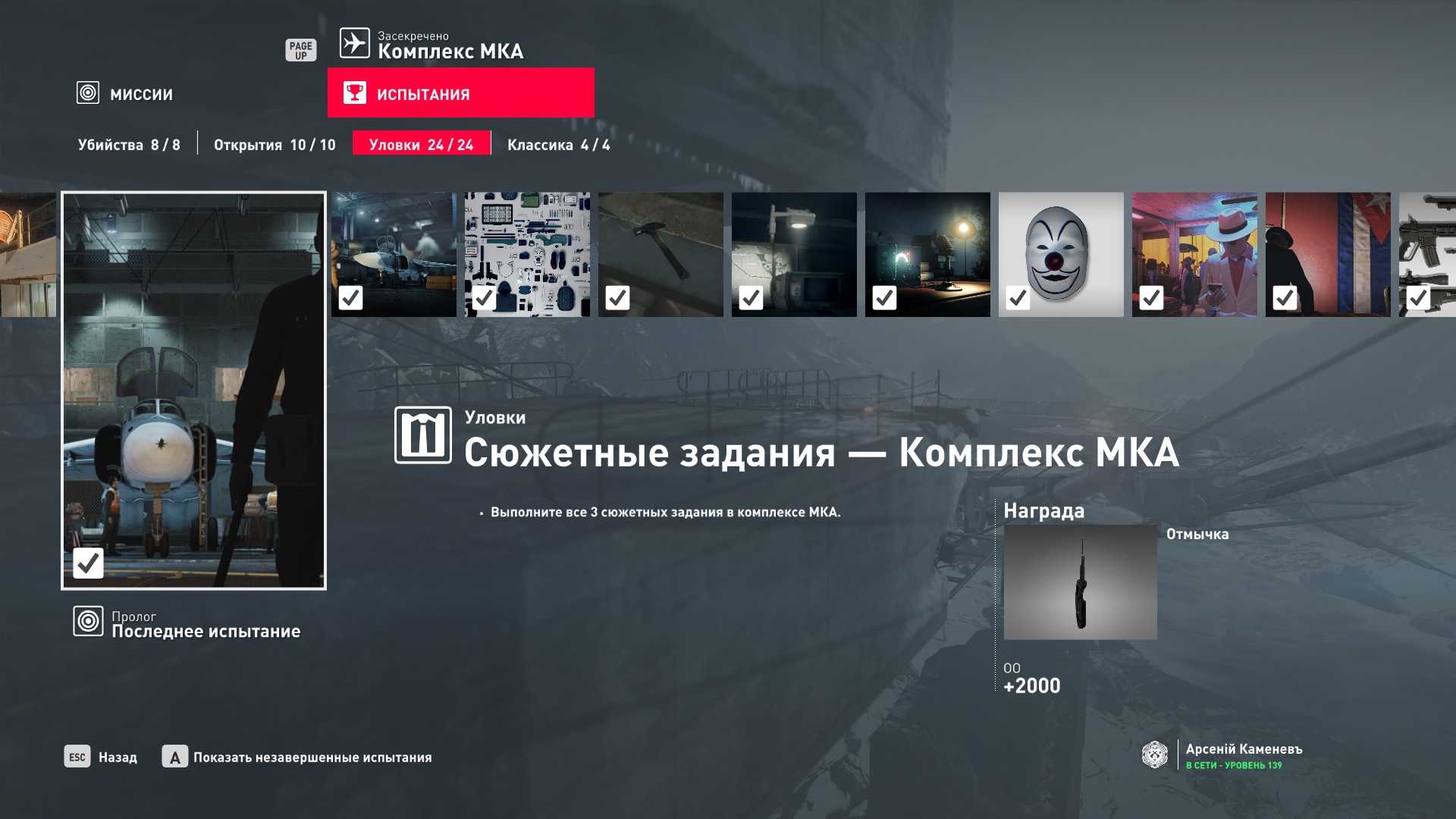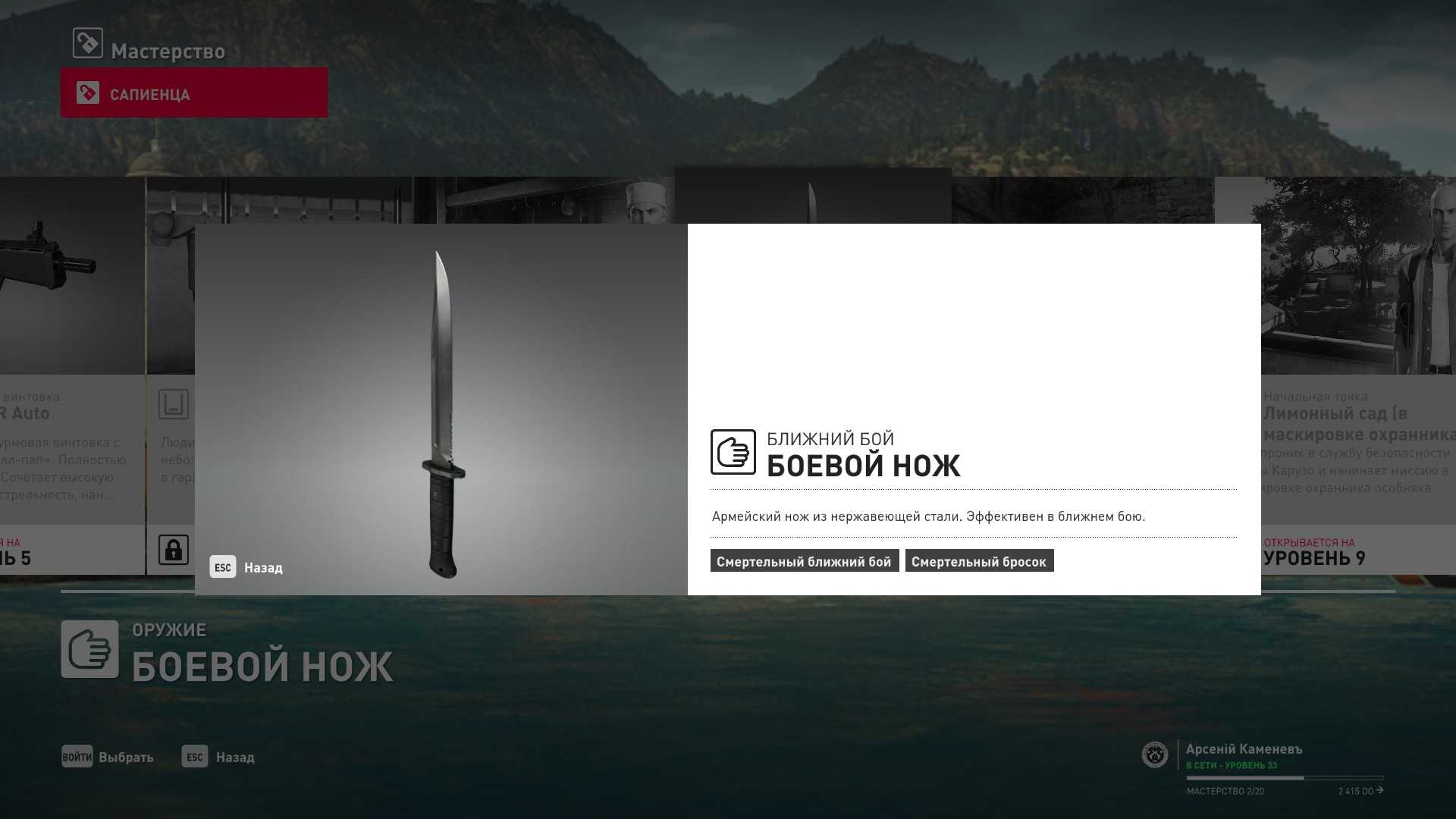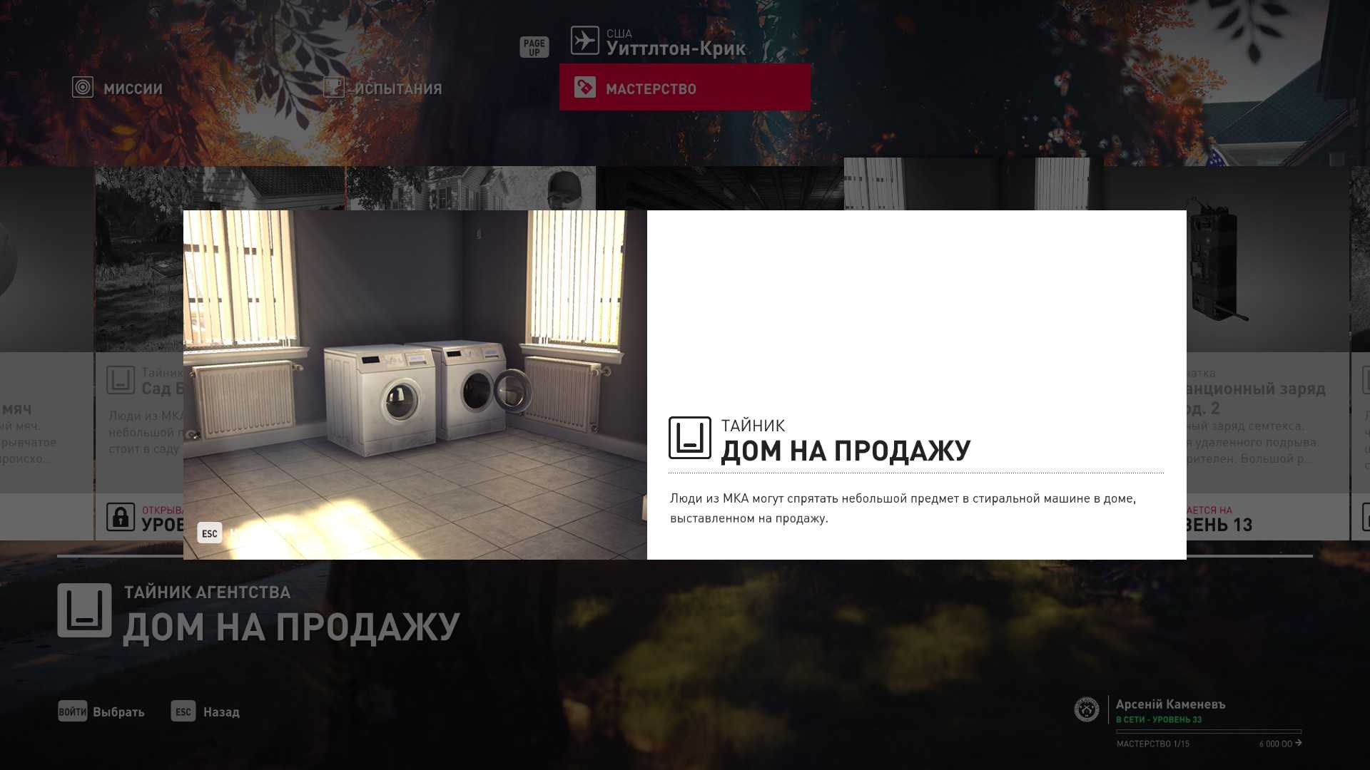 6 уровень мастерства: Тайник МКА в гараже особняка 7 уровень мастерства: Начальная точка на кухне в маскировке повара и боевой нож