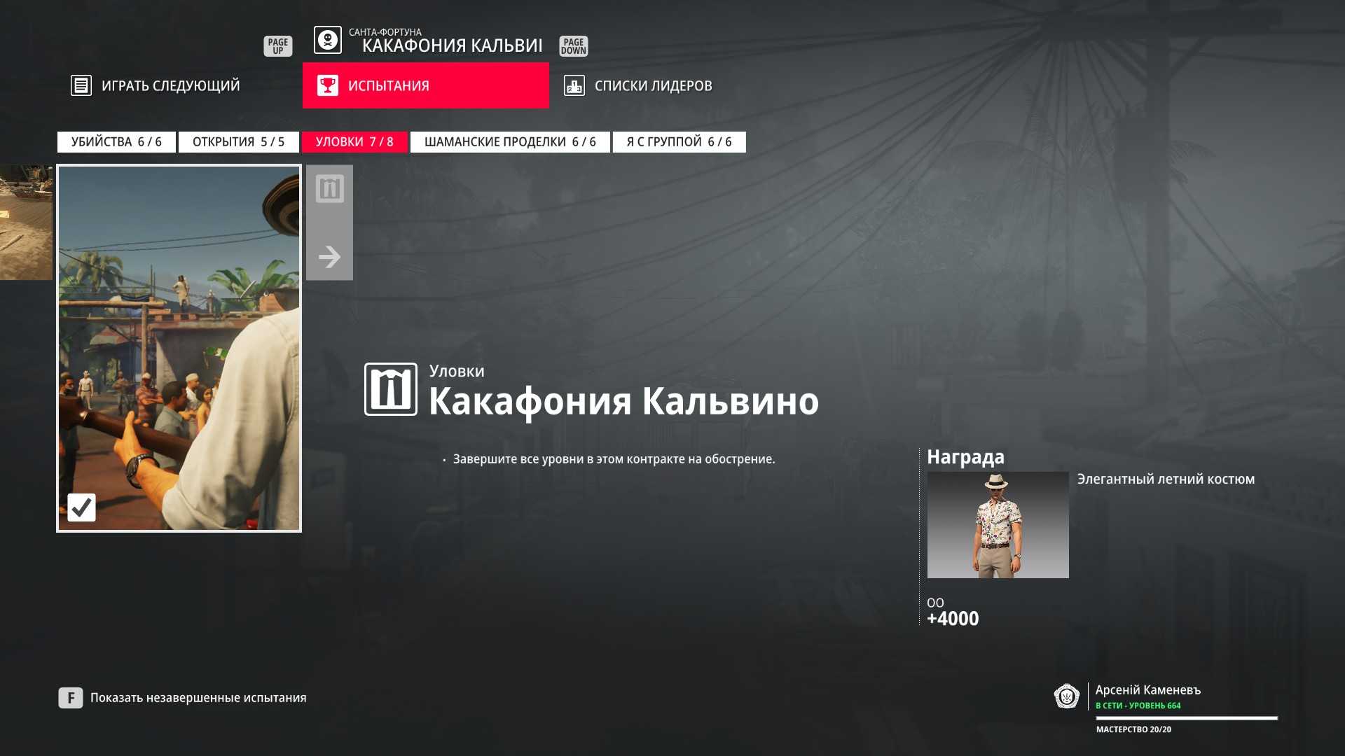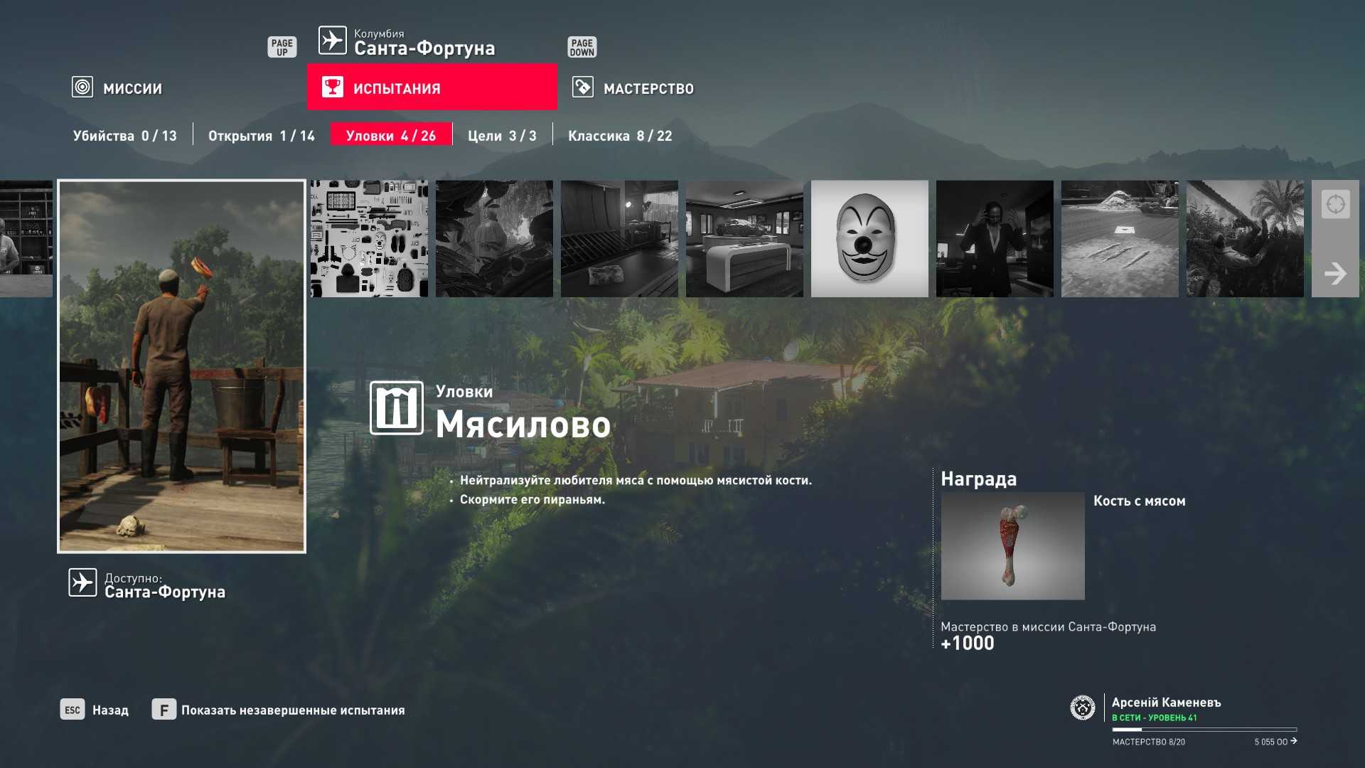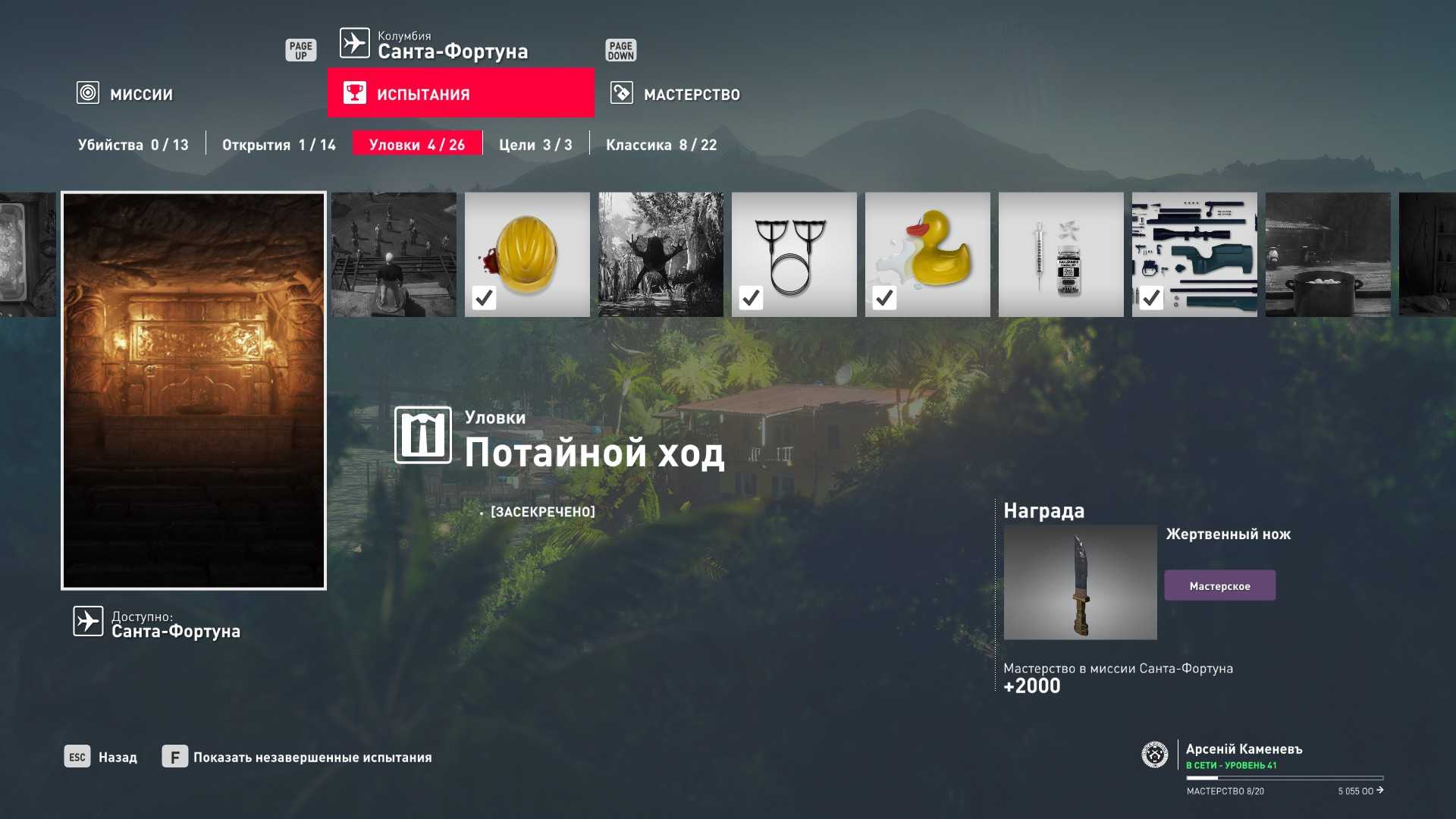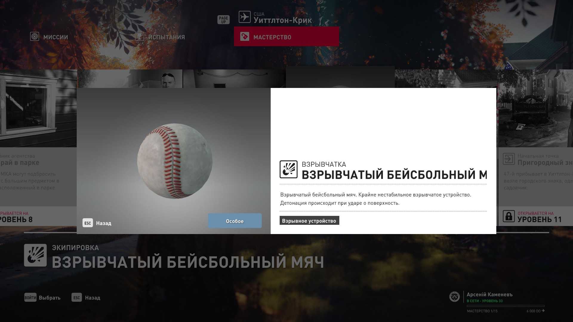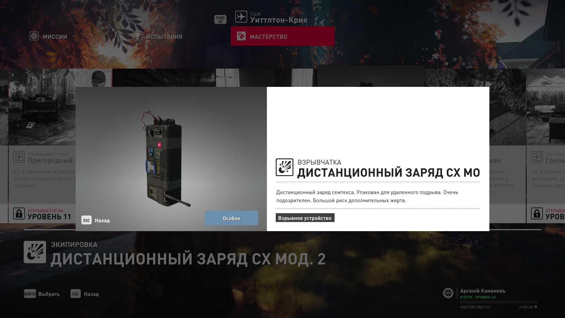 6 уровень мастерства: Тайник МКА в гараже особняка 7 уровень мастерства: Начальная точка на кухне в маскировке повара и боевой нож