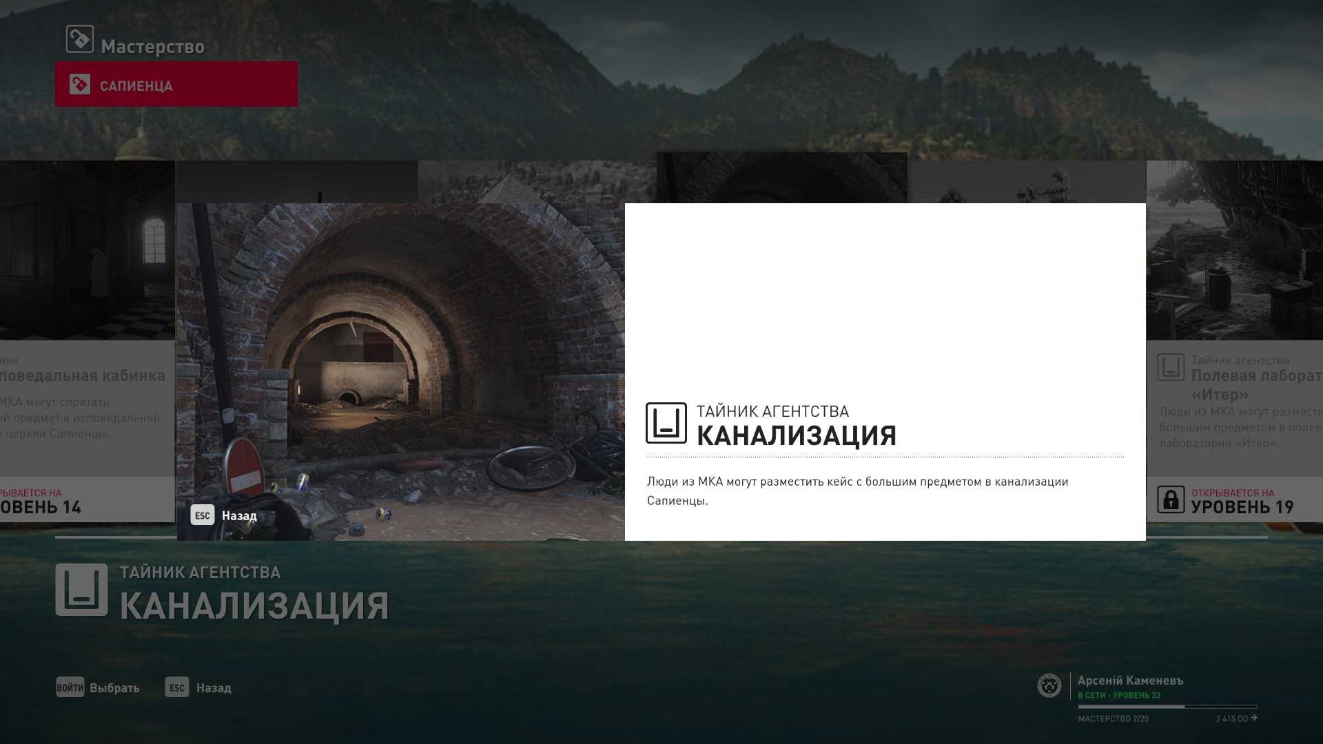 17 уровень мастерства: Тайник МКА в канализации 18 уровень мастерства: Начальная точка в развалинах крепости в Сапиенце