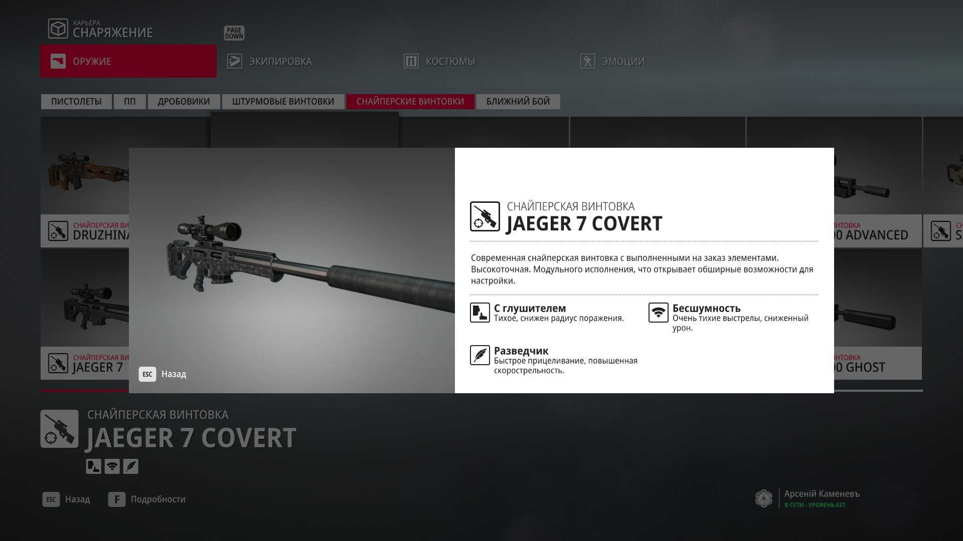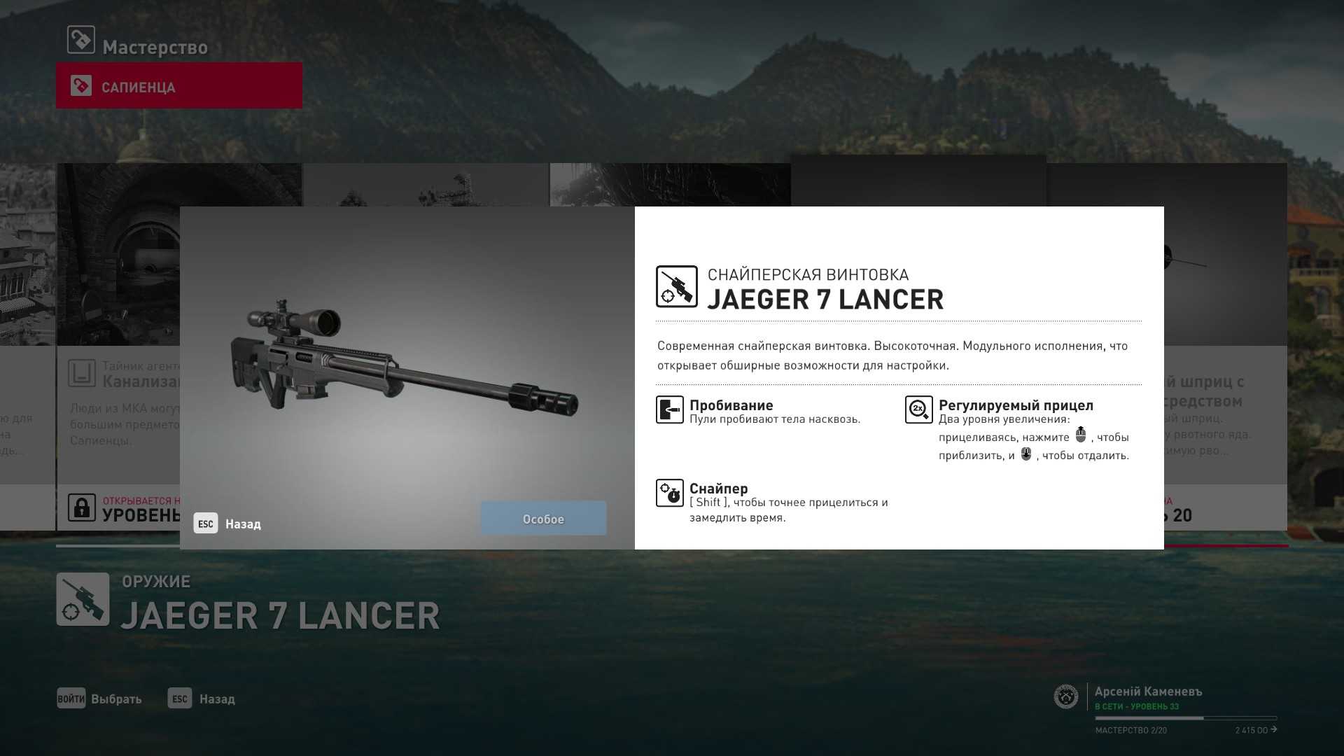 20 уровень мастерства: Снайперская винтовка Jaeger 7 Lancer и латунный шприц с рвотным ядом