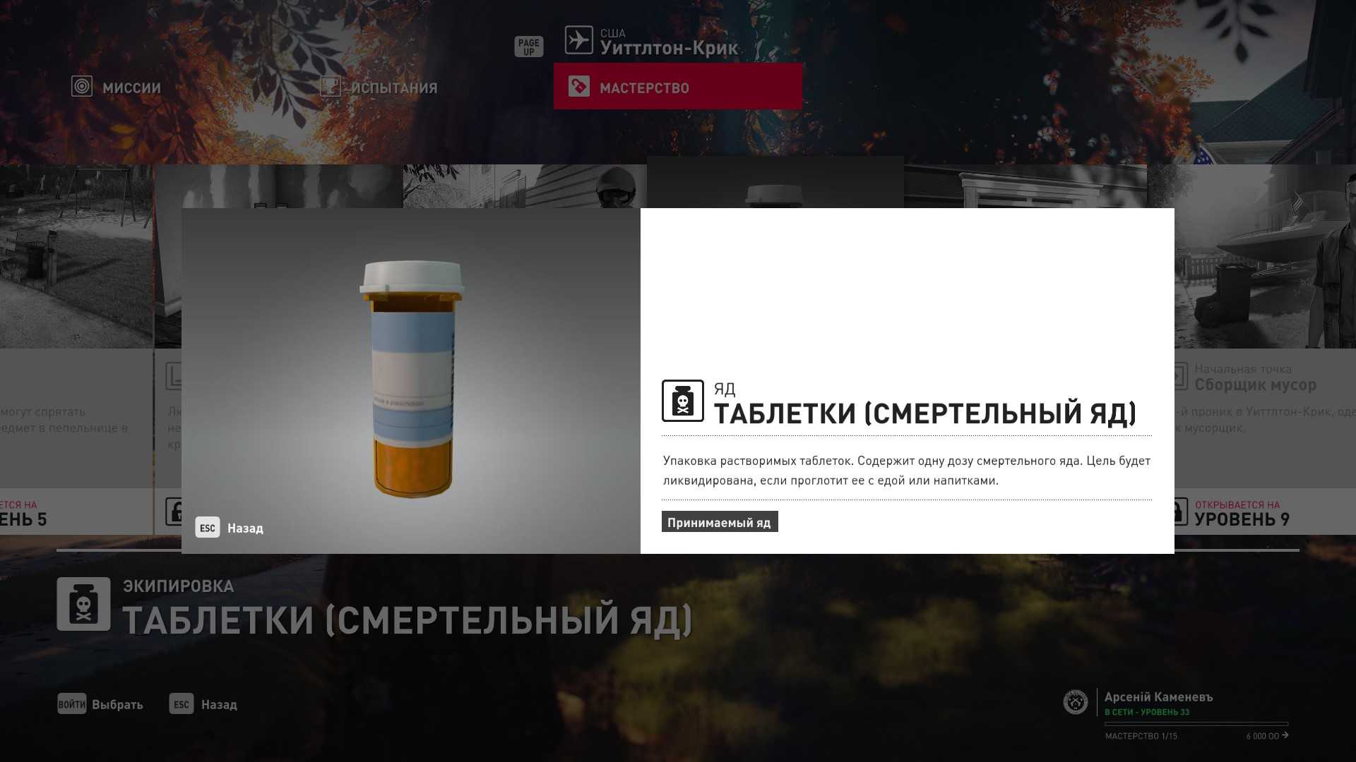 6 уровень мастерства: Тайник МКА в доме Левински 7 уровень мастерства: Начальная точка в саду резиденции Бэтти в маскировке дезинсектора и таблетки со смертельным ядом