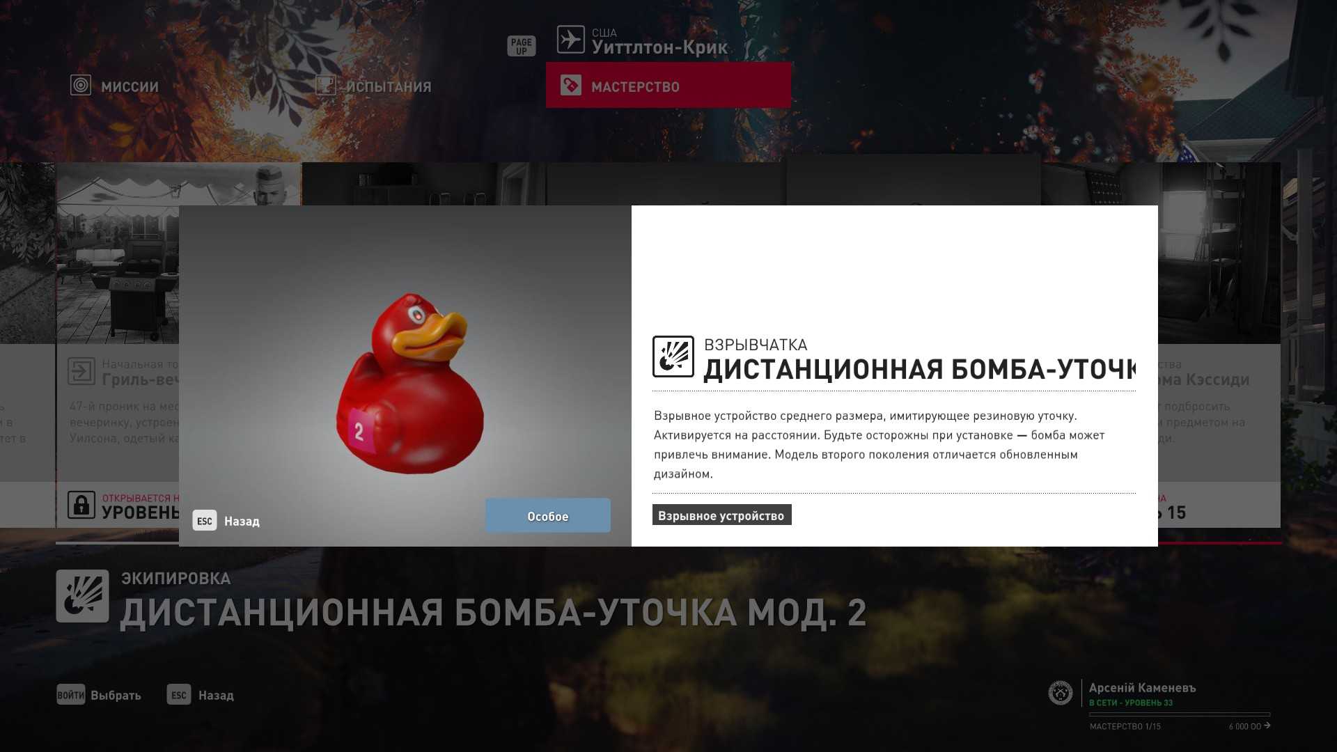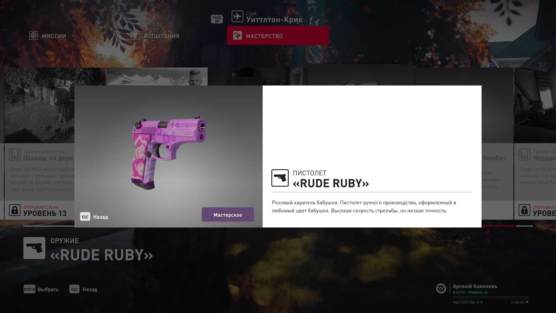 15 уровень мастерства: Высокоскоростной пистолет Rude Ruby, дистанционная уточка-взрывчатка мод. 2 и тайник МКА на чердаке дома Кэссиди