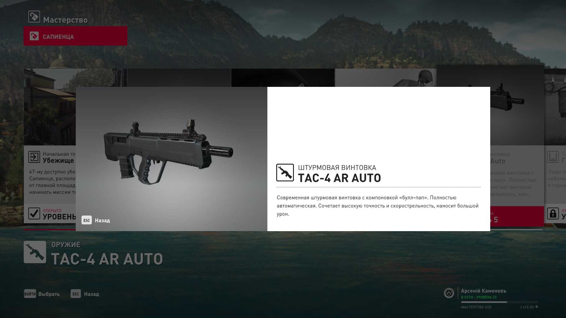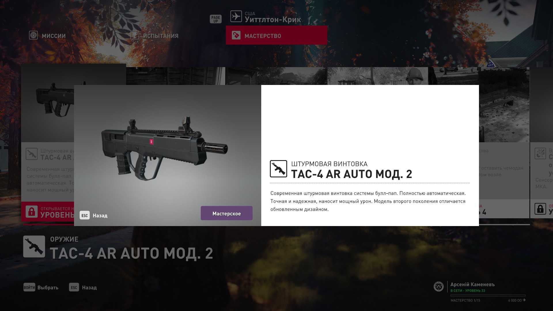 2 уровень мастерства: Штурмовая винтовка TAC-4 AR Auto мод. 2 и тайник МКА в сарае у ручья