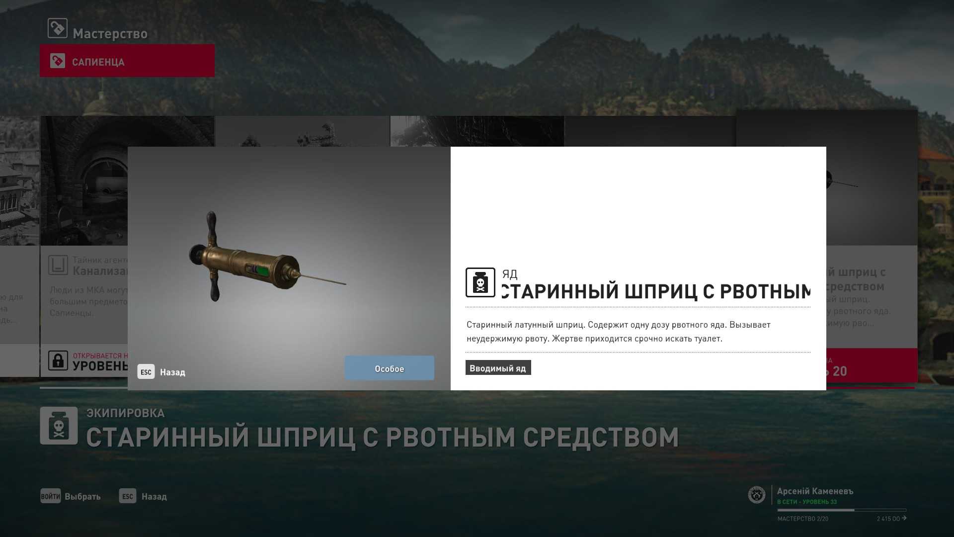 10 уровень мастерства: Шприц с рвотным ядом 11 уровень мастерства: Тайник МКА на балконе на втором этаже в южном крыле
